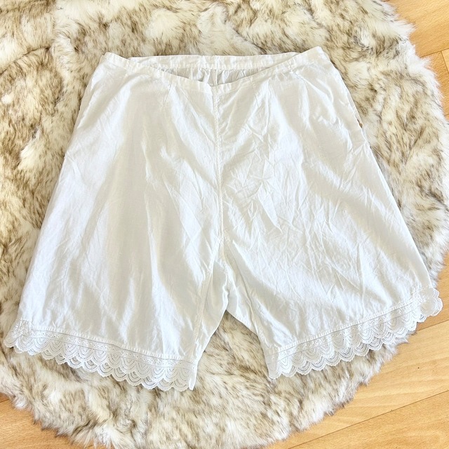 ドロワーズパンツ。膝丈で、後ろのボタンでとめるタイプのパンツです。シンプルですが、裾のレースが可愛い1枚です。デニムパンツの上などレイヤードにオススメです。 ❁素材 :おそらくコットン ❁カラー:白 ❁サイズ:着丈 約50cm ウエスト 約66cm 股上 約35cm 股下 約14cm 裾幅 約30.5cm ❁状態:特に目立った汚れや傷はありません。 ❁管理番号:P1-70 ≪注意事項≫ ☾ 採寸に関しましてはなるべく誤差のないよう心掛けていますが、若干のズレが生じる場合がございますのでご容赦ください。 ☾ 商品画像はできる限り実物に近い色を再現するよう努めておりますが、お使いのPCや携帯電話の環境により、実物と異なる場合もございますのでご了承ください。 ☾ 掲載されております商品は基本的には1度誰かが大切に使用していたものであり、何年もの時を経てきたものになります。ダメージやリペア跡についてはできる限り記載するよう努めておりますが、気にならないようなものについては省略させていただく場合もございます。 ☾ 古着という観点からご購入後のキャンセルは原則的にお受けできませんので、ご質問等はご購入前にしていただき、よくご理解ご確認の上ご注文いただきますようお願いいたします。