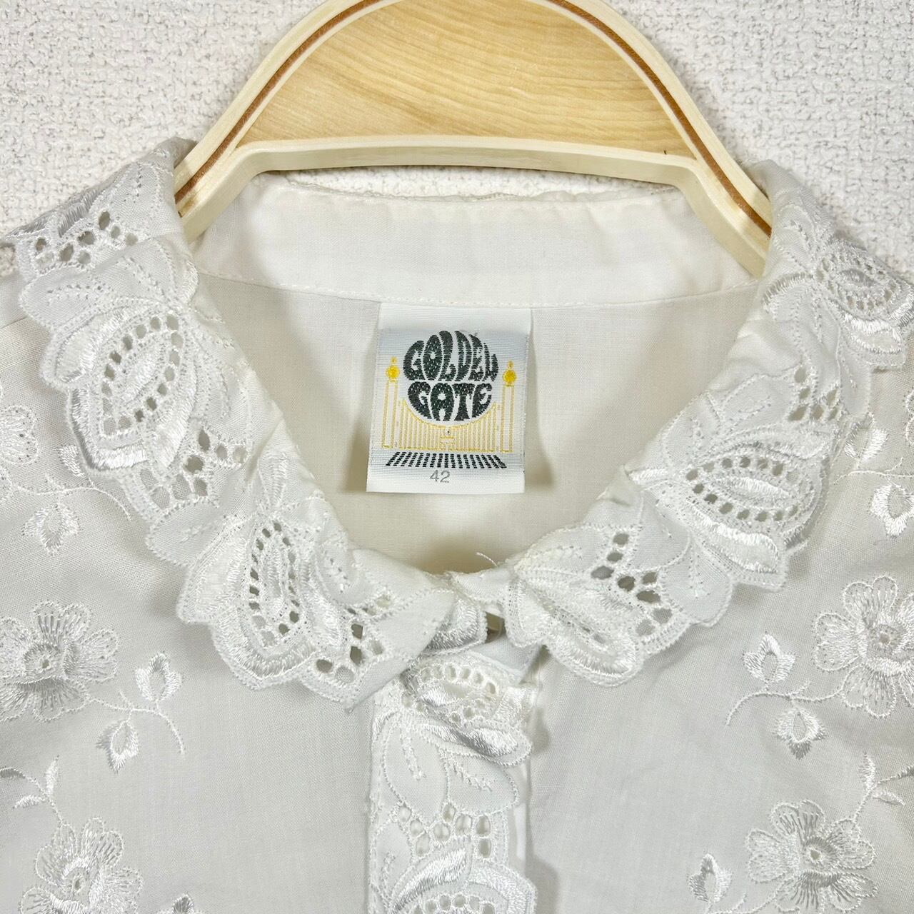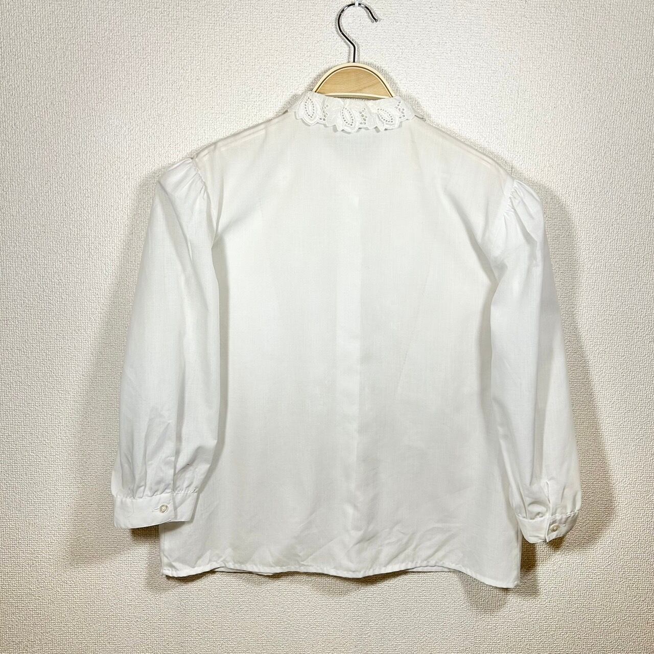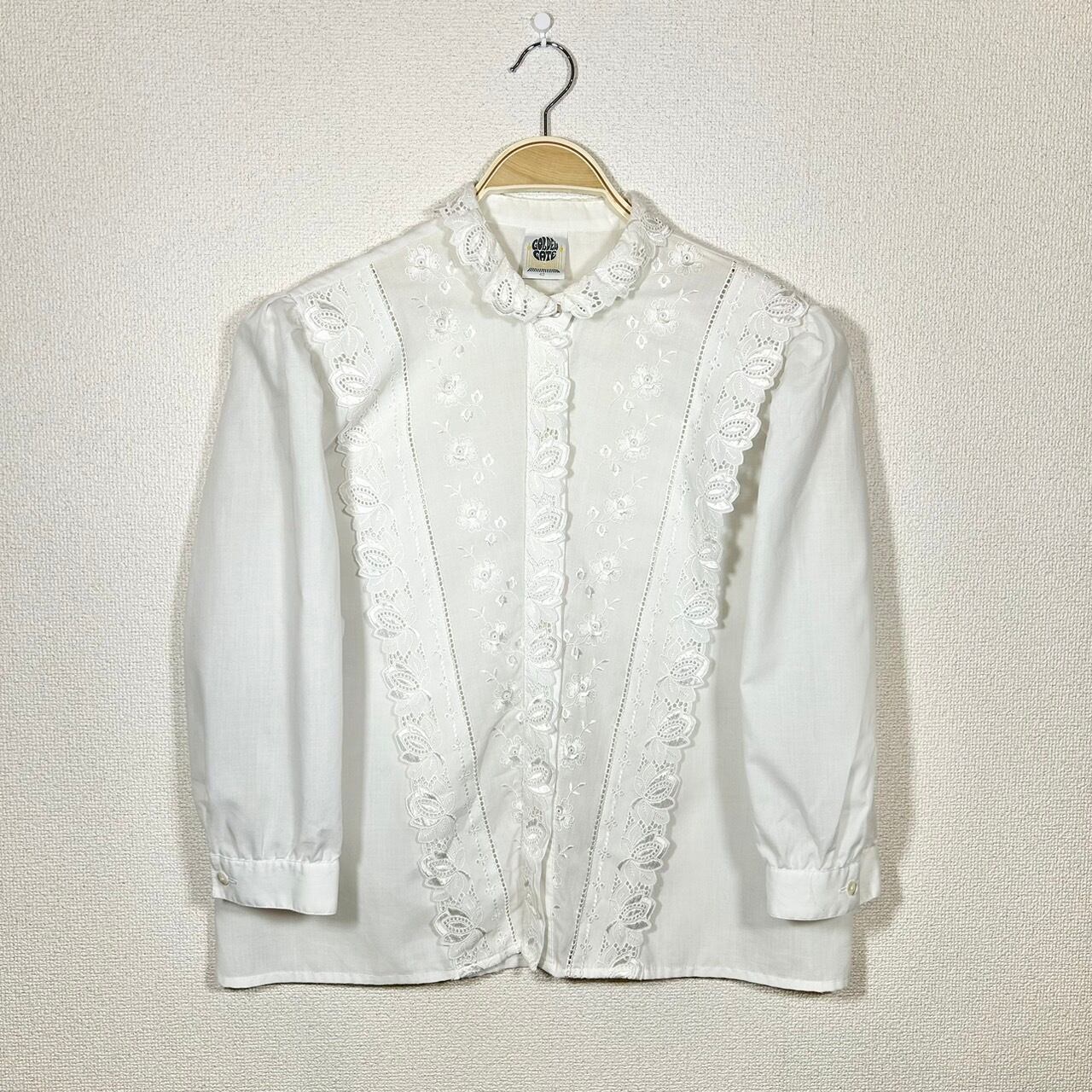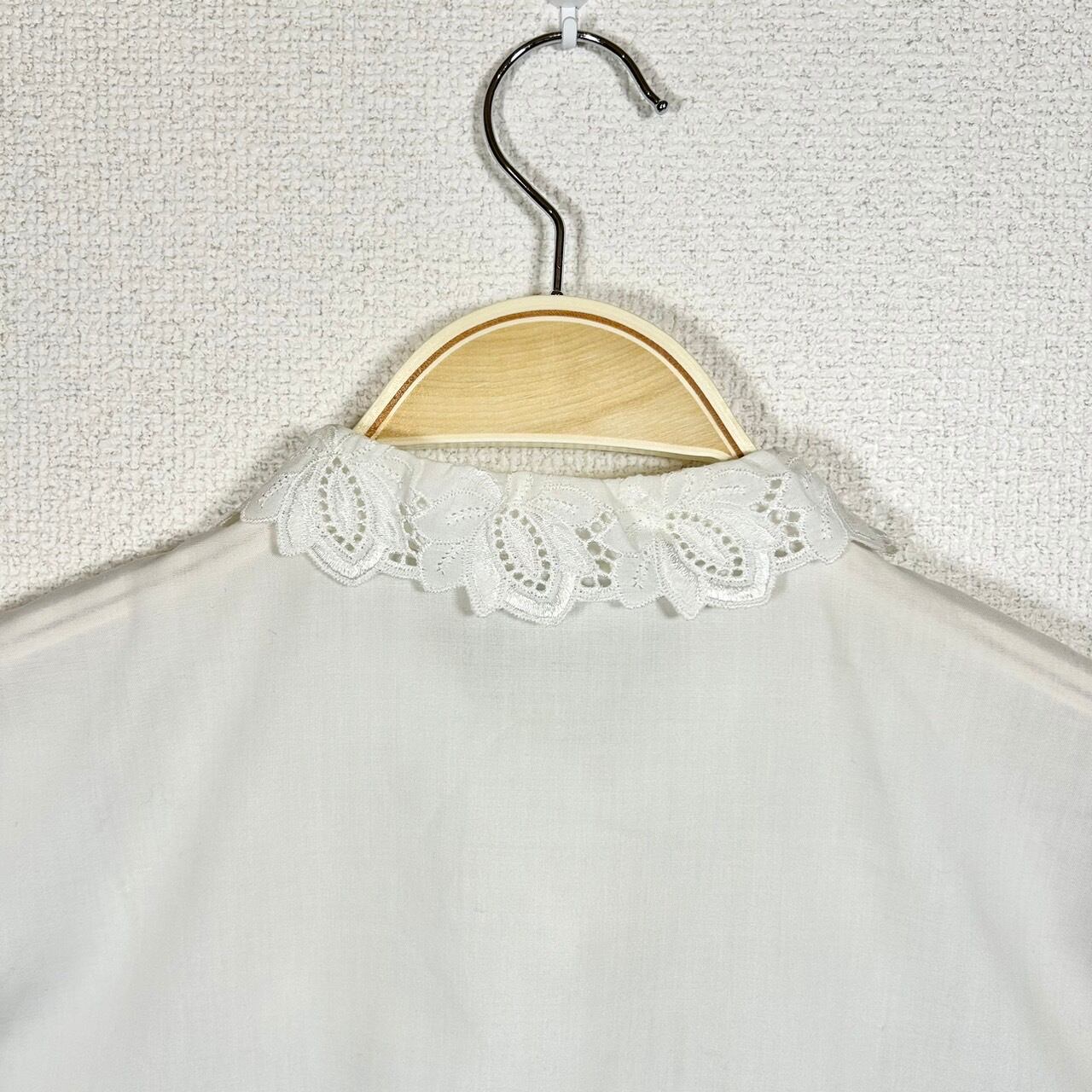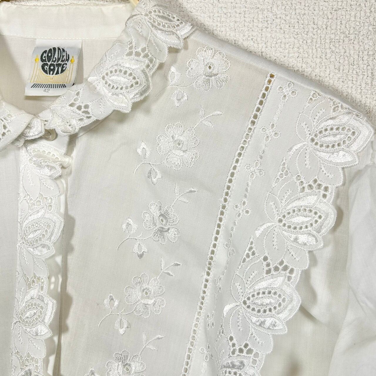 フロントの肩から裾にかけてのレースや刺繍が凝っていて素敵な白ブラウス。レイヤードで襟のレースを出して着たり、1枚で着るのも可愛くて幅広く楽しめる1着です。サイズ42とゆったりめなデザインです。
