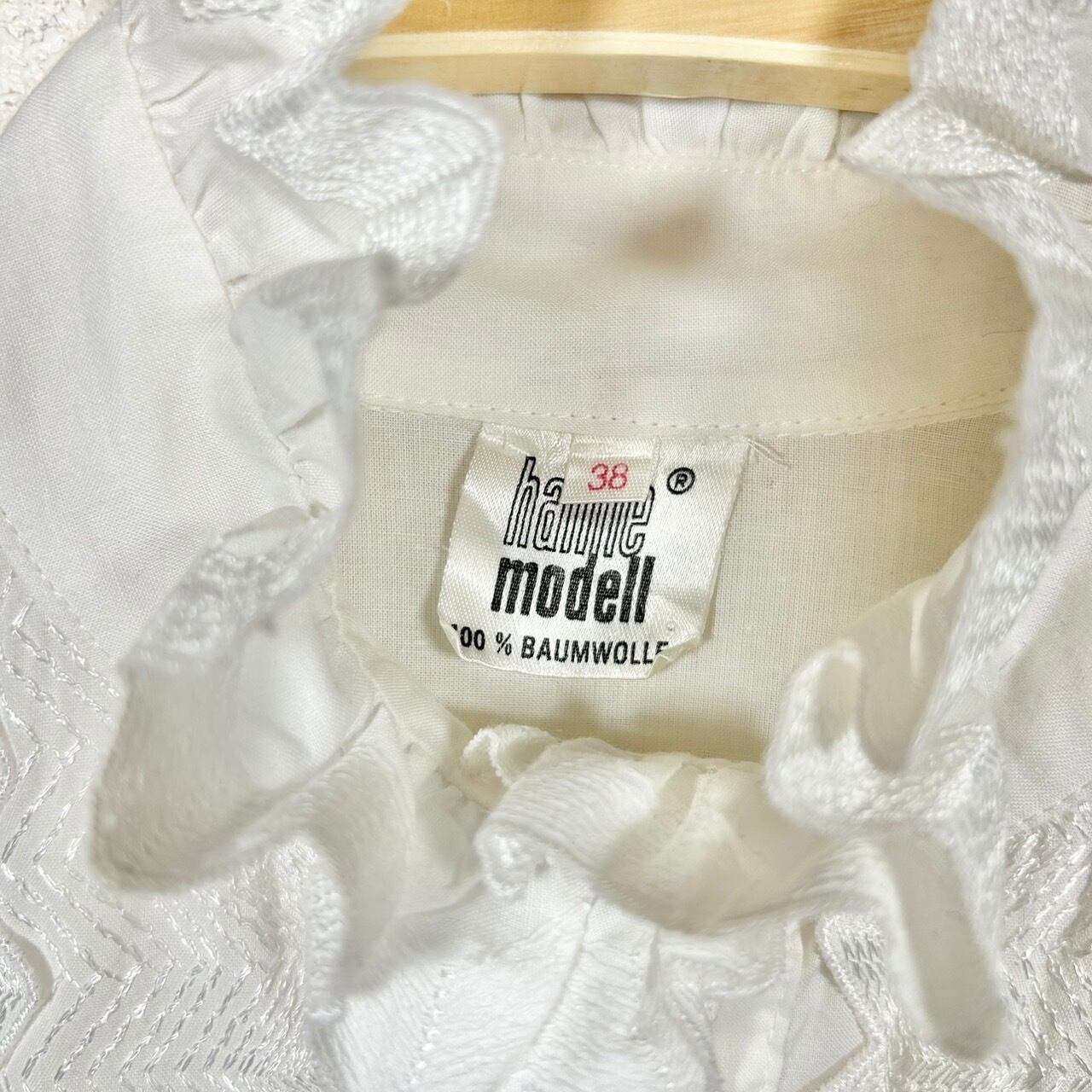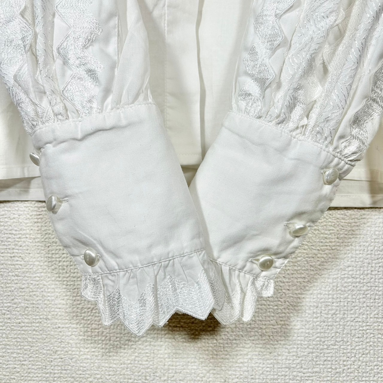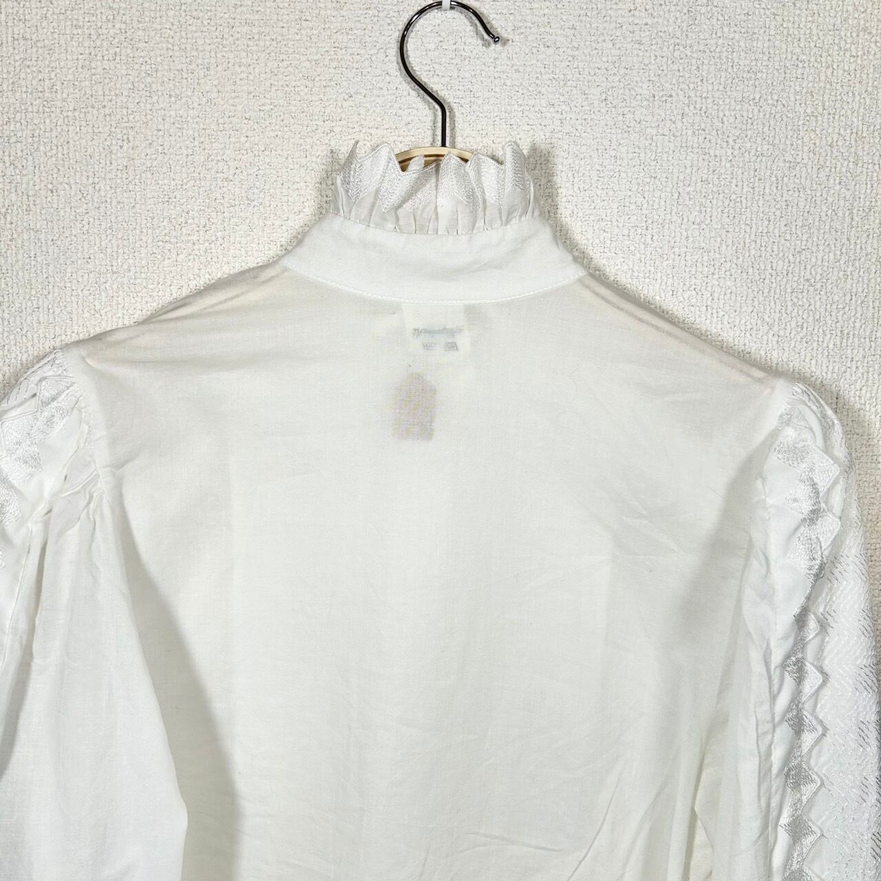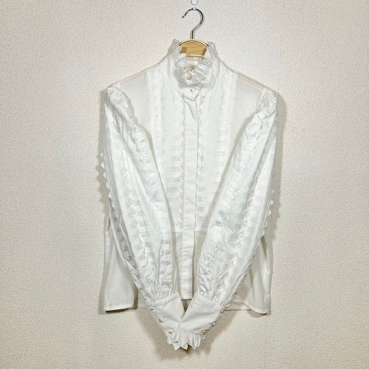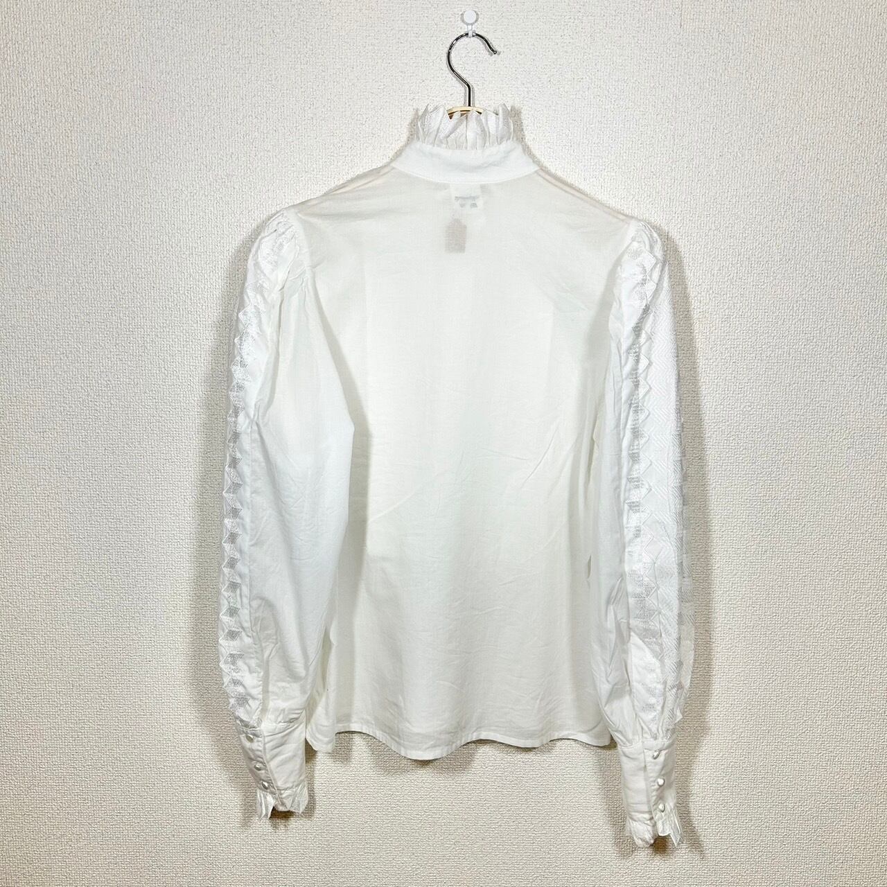 フロントの立ち襟が印象的で全体の作りが凝っている白ブラウス。アーム部分など全体的にレースが施されたデザインは、シンプルながらも存在感を放ち、特別な日のコーディネートにもぴったり。1枚での着用はもちろん、重ね着することで更にスタイルの幅を広げることができます!