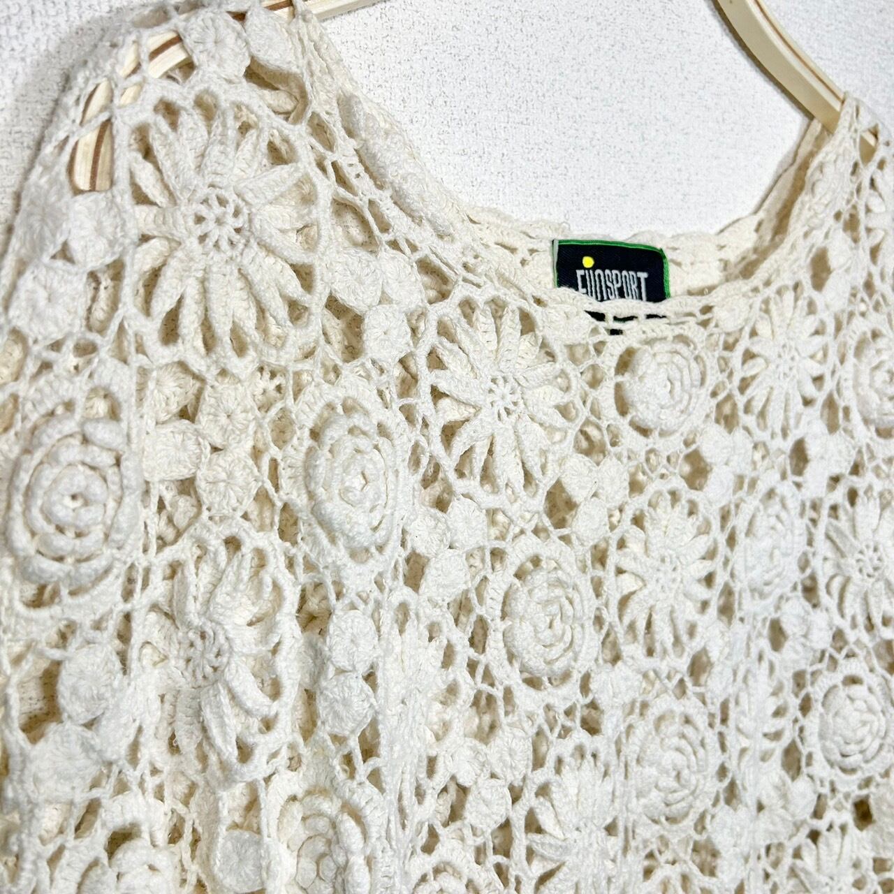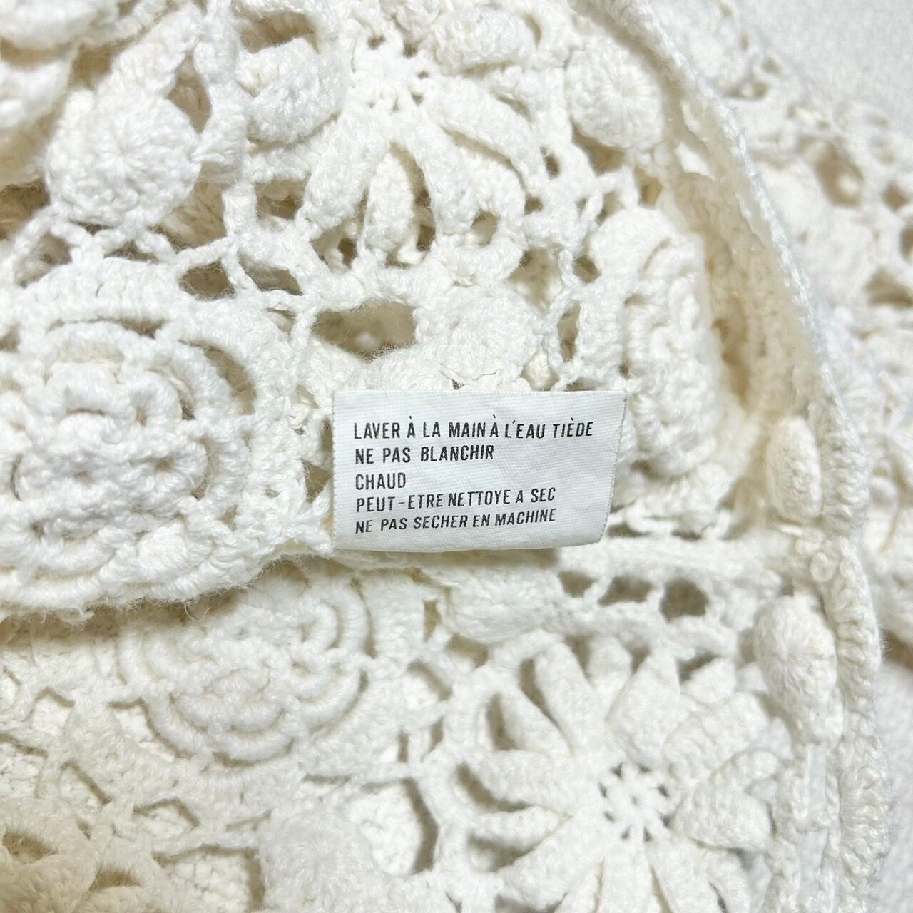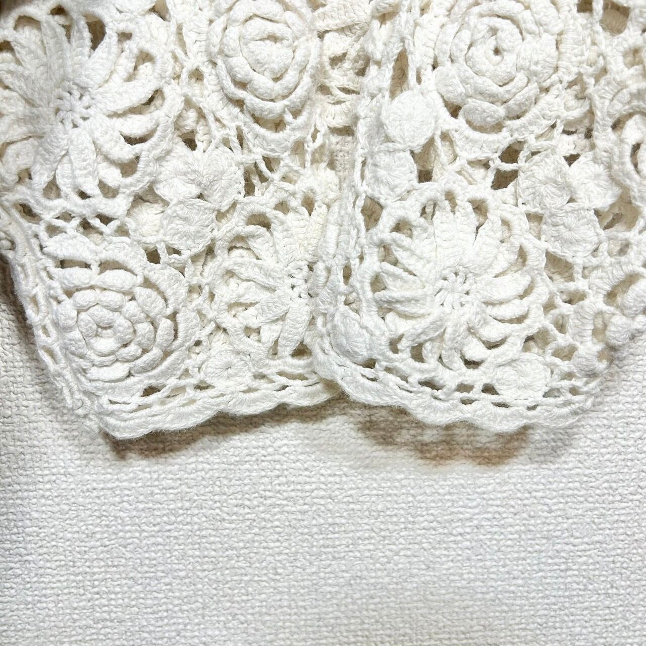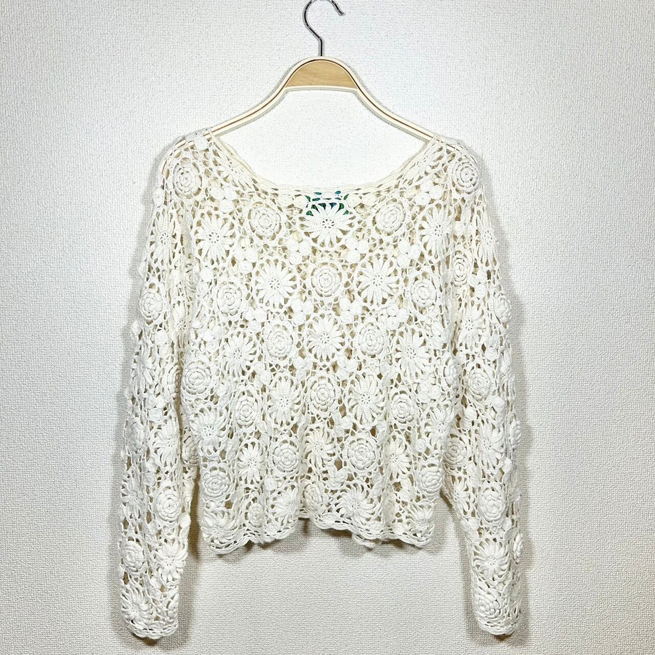 ホワイトの花柄クロシェ編みトップス。やわらかな麻混素材が肌に優しく、カジュアルから特別な日までどんなスタイルにも合わせやすいです。中に着るインナーによってシーズンレスで使えるアイテムです。