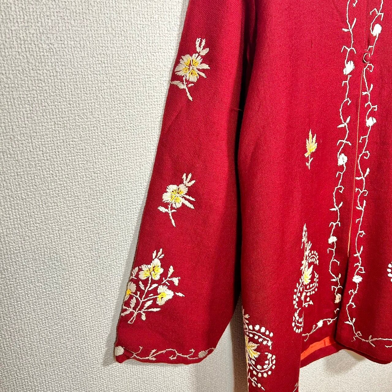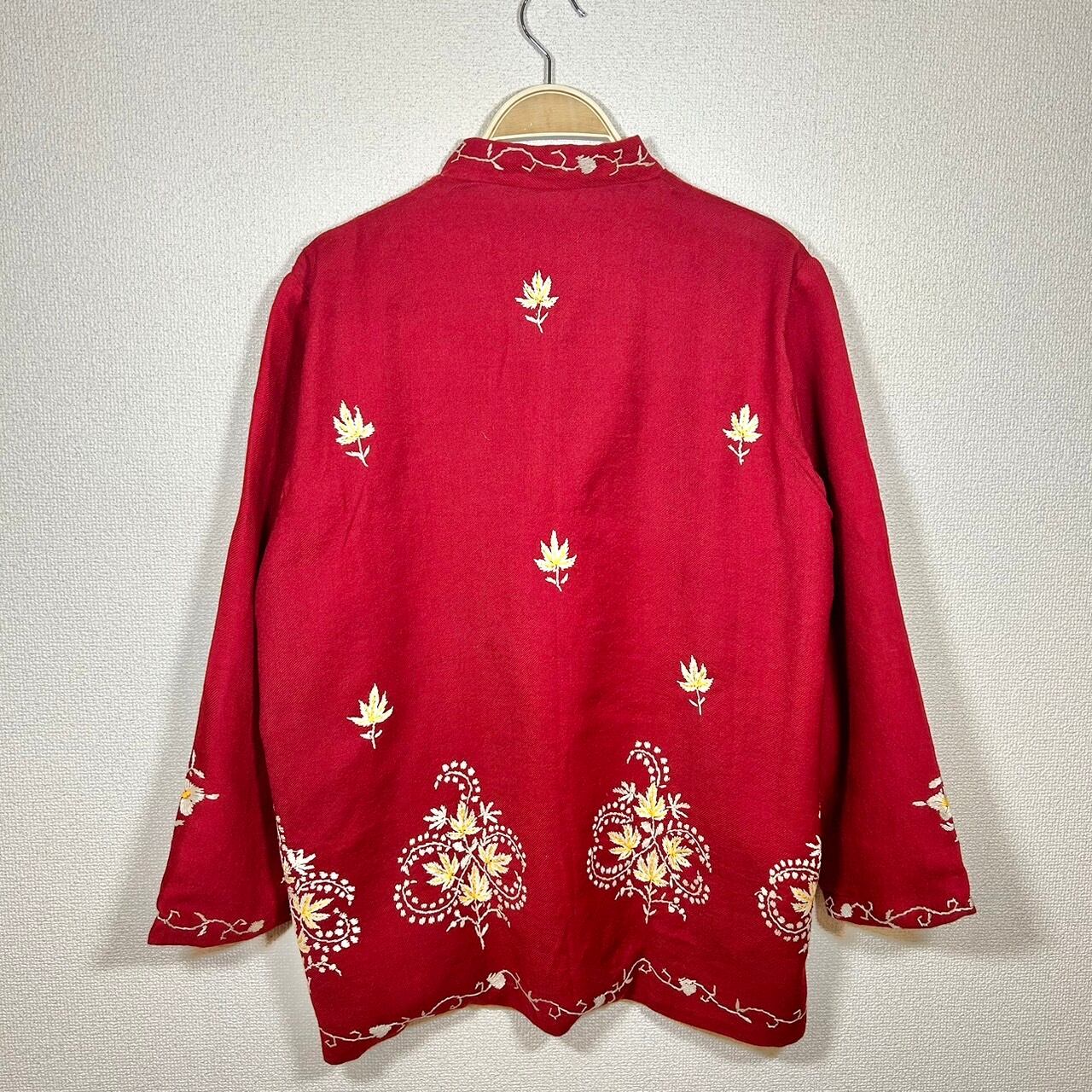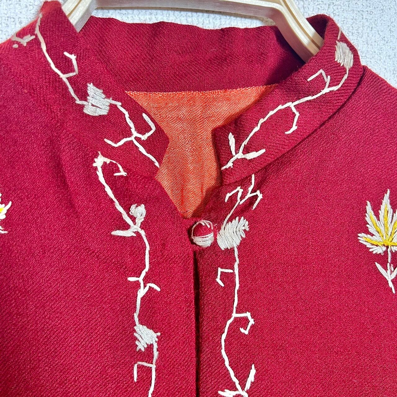 60'sの刺繍が施されたチャイナ風ウールジャケットです。濃い朱色のような色合いと繊細な刺繍が特徴です。1枚で着ても羽織として着ても素敵ですし、インナーを変えることで春先や秋冬も楽しめる1着です。