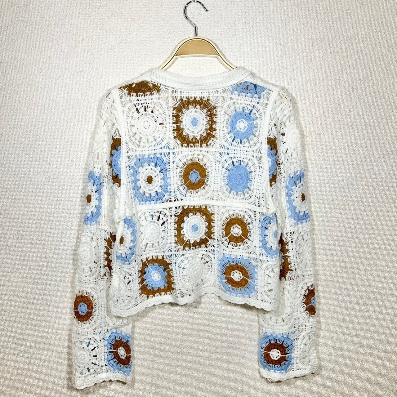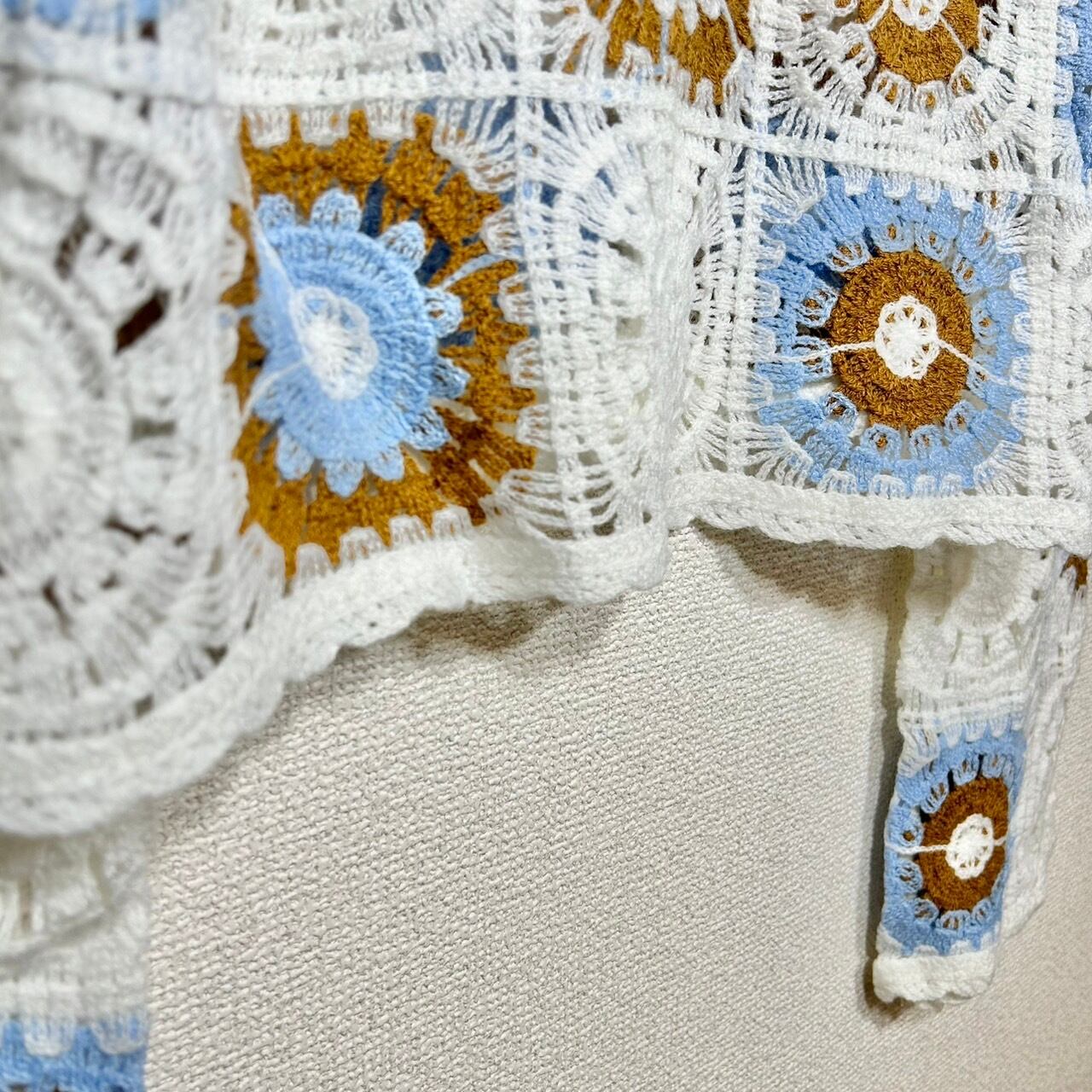 全体クロシェ編みのシャツです。柔らかな素材感と繊細なデザインが特徴で、さらりとした肌触りが心地よく着れる1着です。夏に1枚で着ても可愛いですし、秋冬も中に着るインナーを変えてレイヤードすることで幅広くコーディネートを楽しめます。