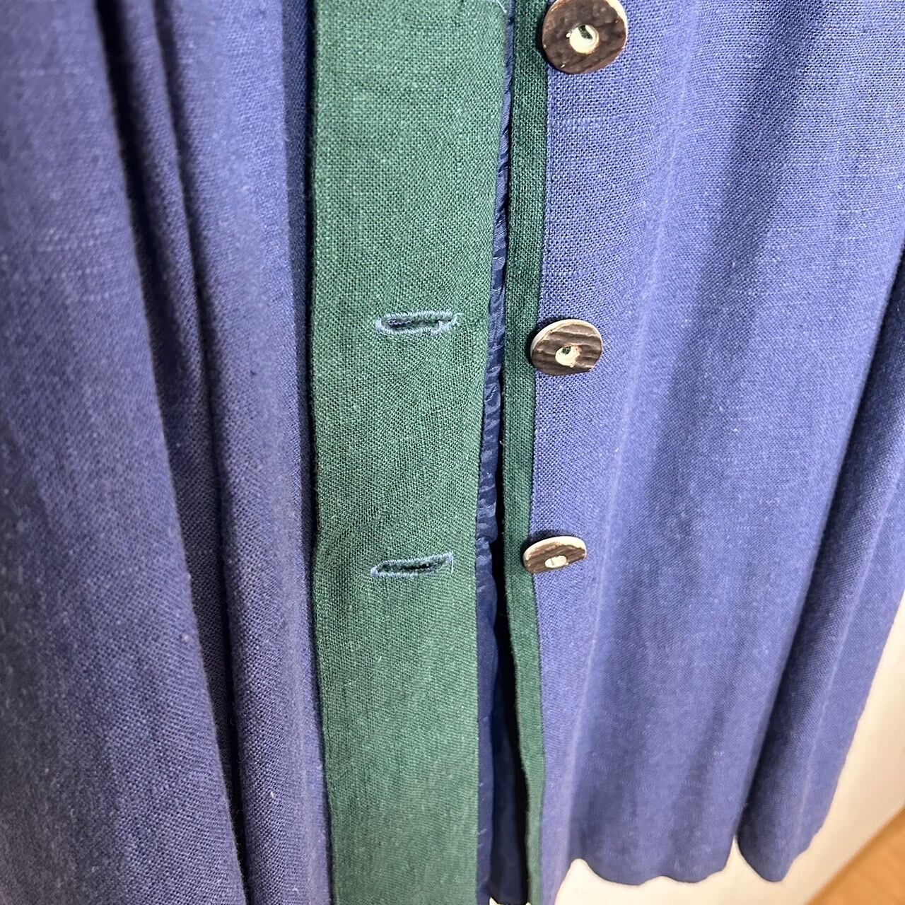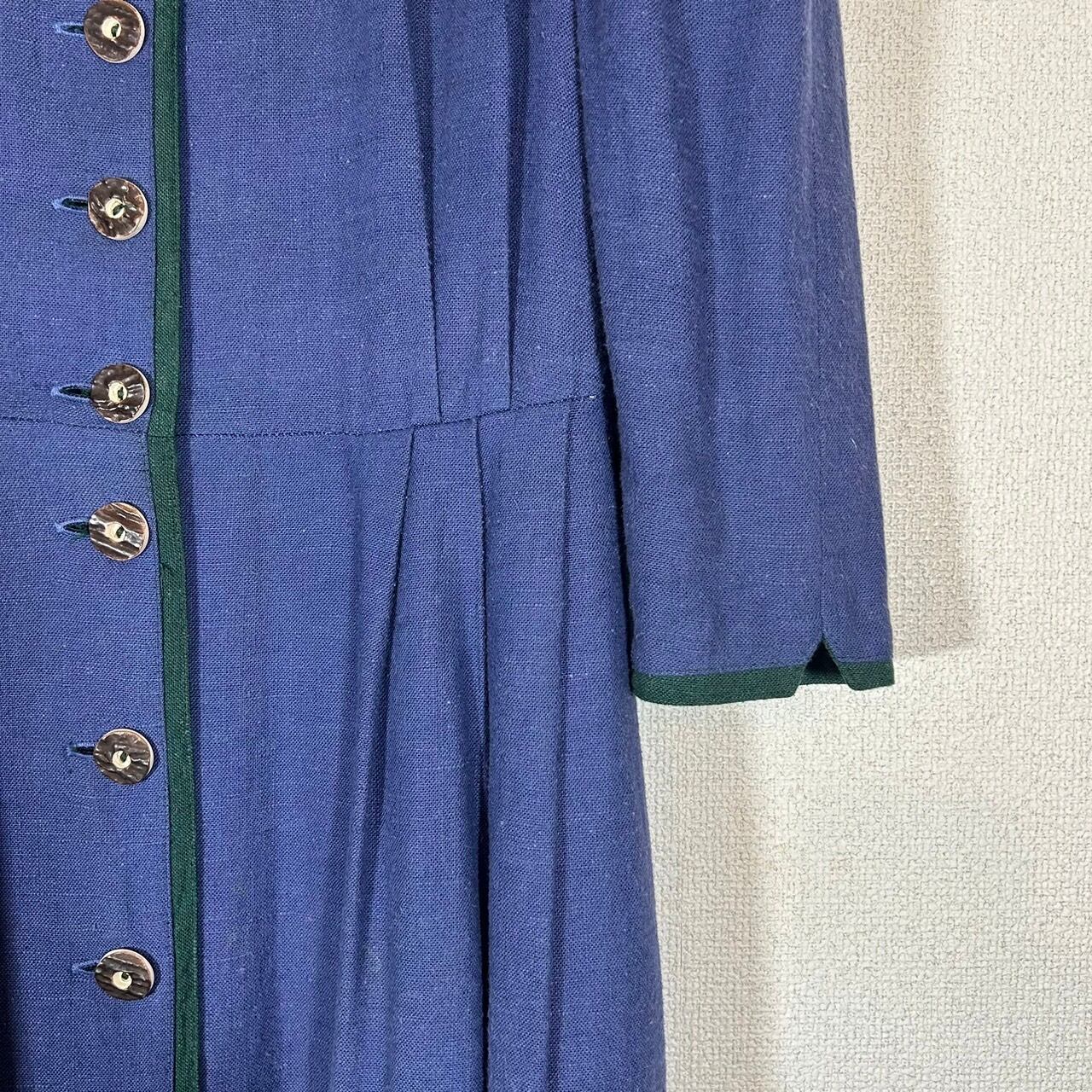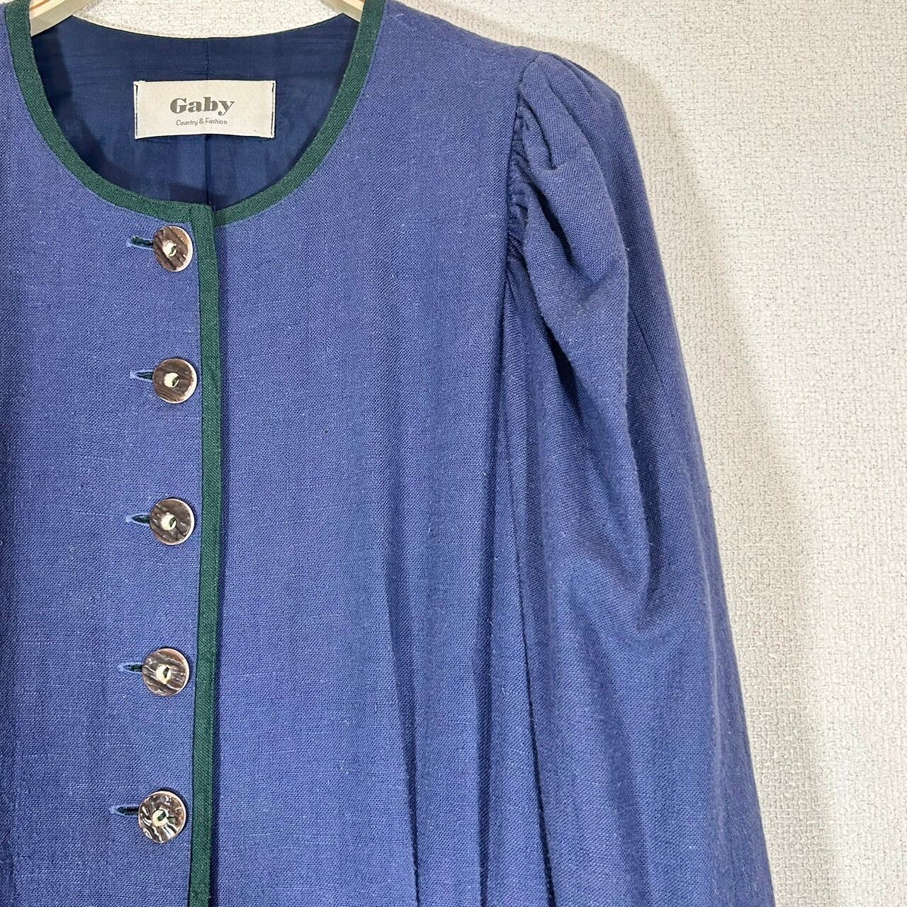 Gaby Country & Fashion のVintage チロルワンピース。美しいブルーの色合いが魅力的で、袖口や襟からフロントボタンにかけての緑ラインが可愛い1着です。