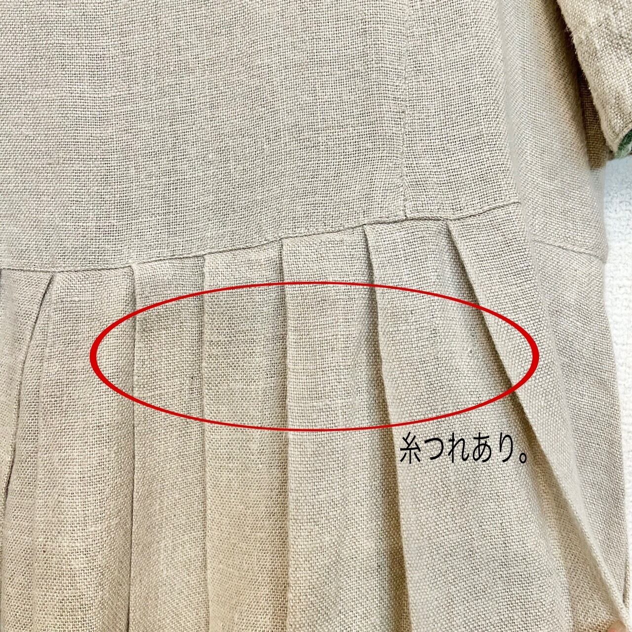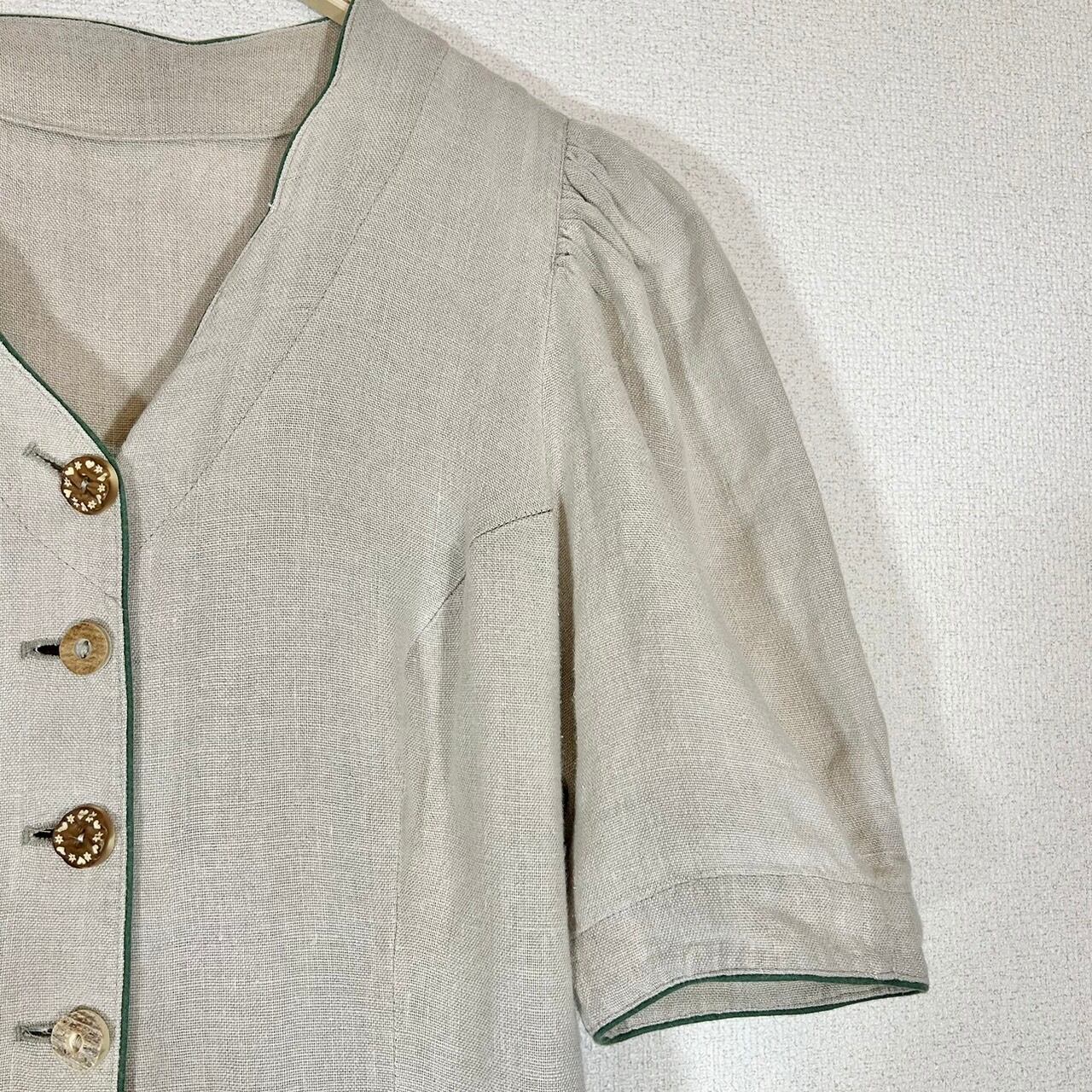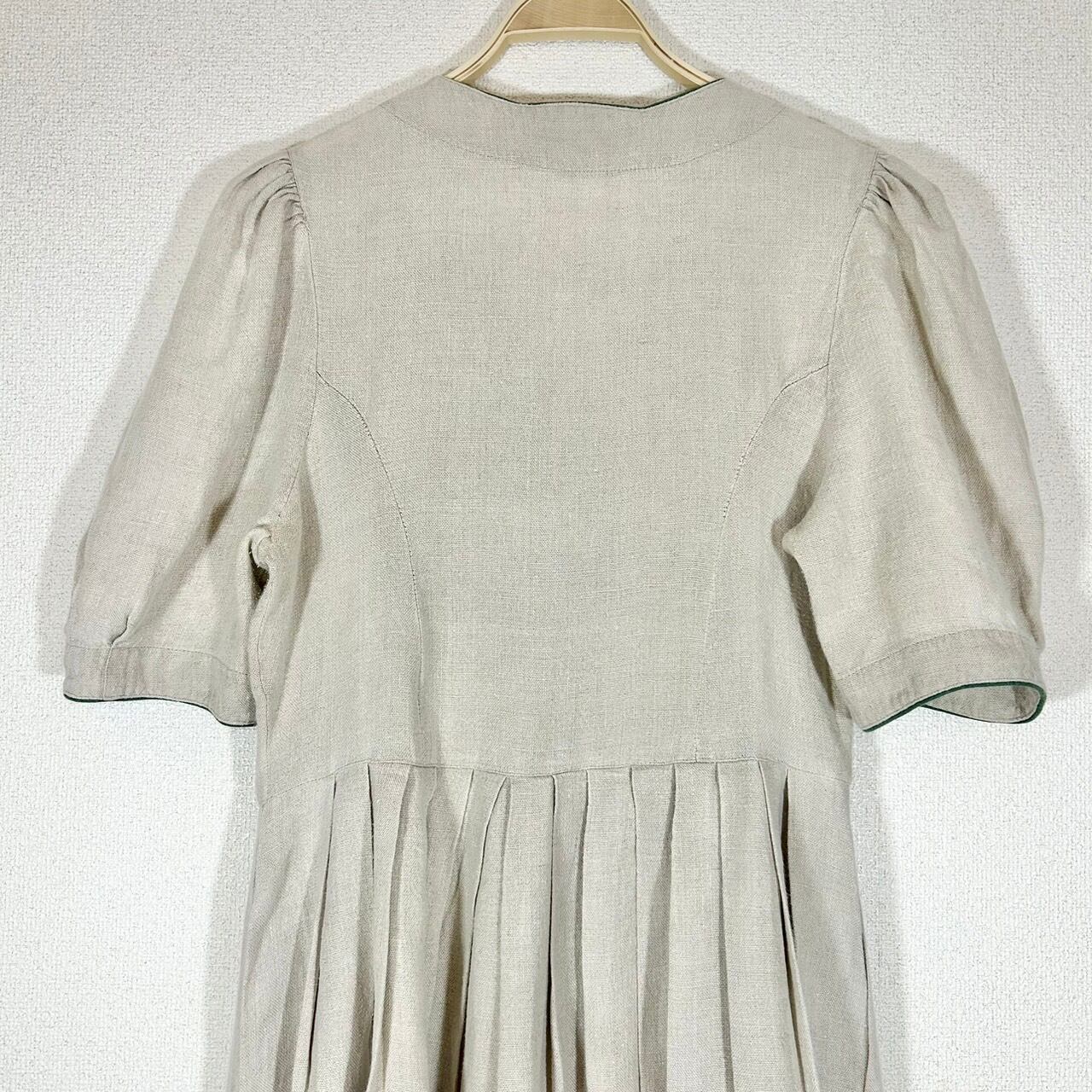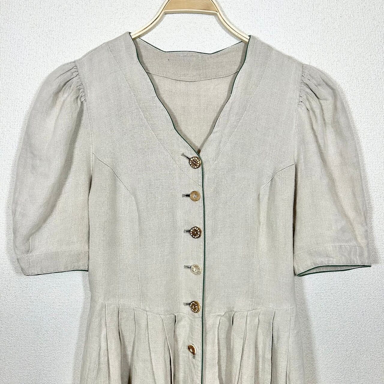 おそらくリネンのチロルワンピース。スカート部分がプリーツのようなタックが入っている縁が緑のデザインとボタンが魅力的な一着です。パフスリーブの袖と柄入りボタンがとても可愛いです。
