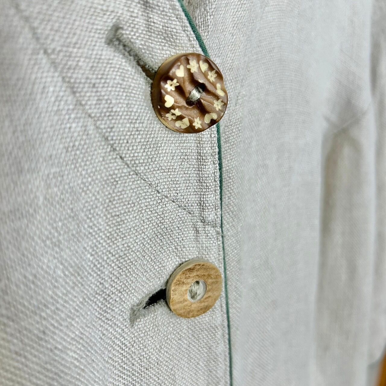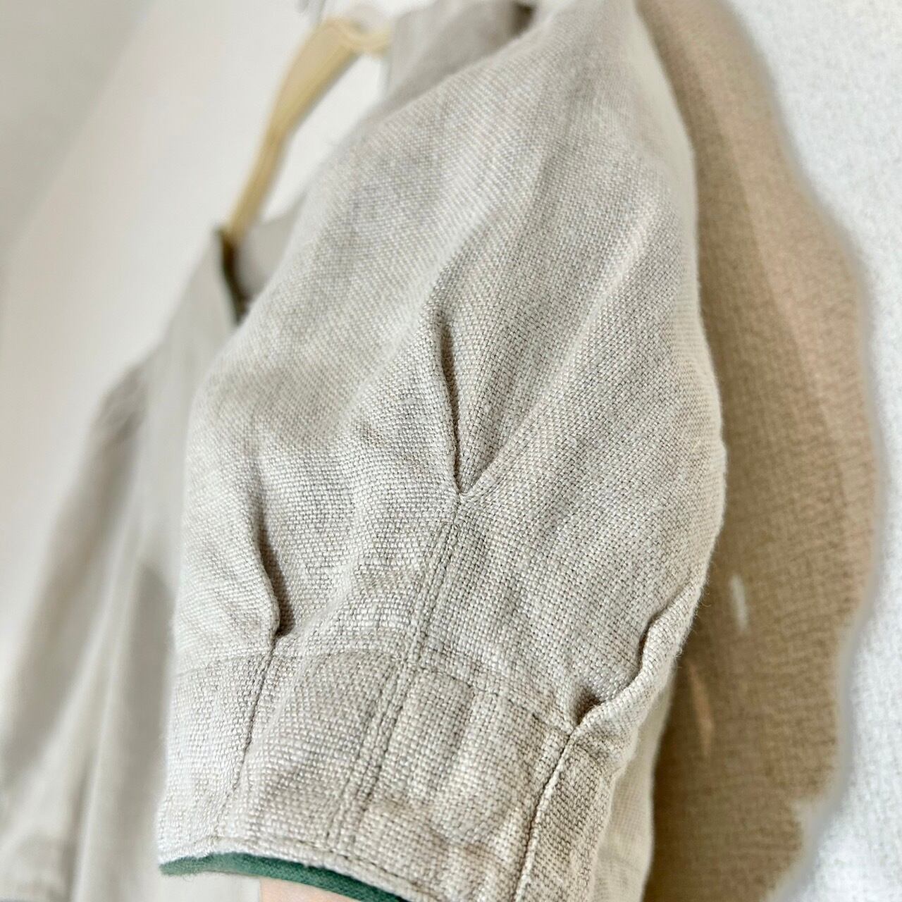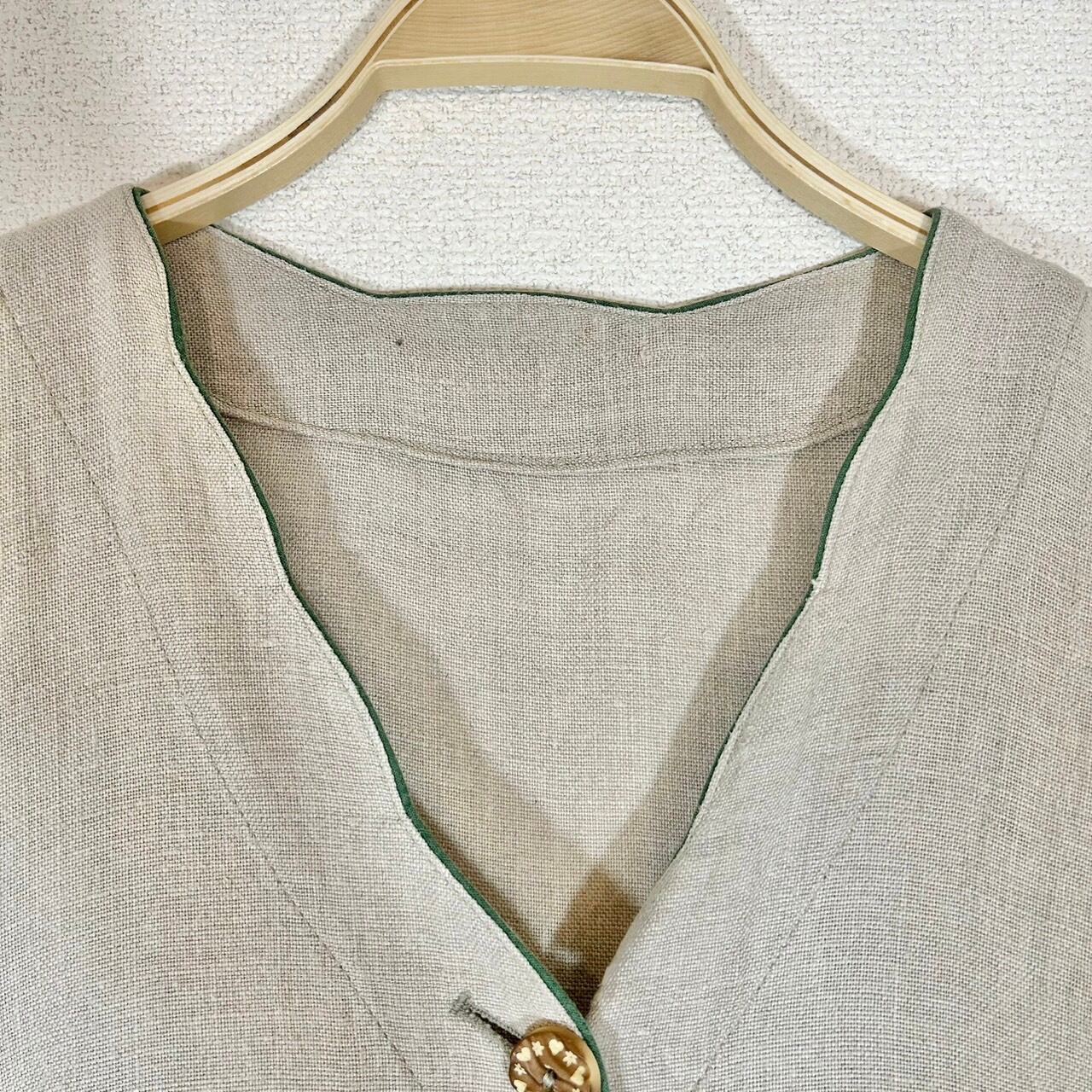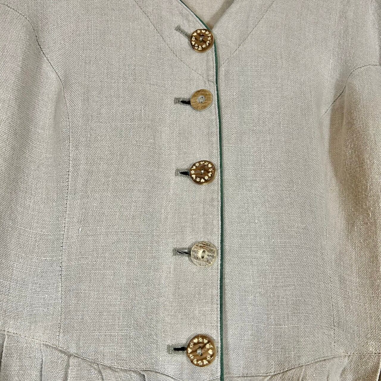 おそらくリネンのチロルワンピース。スカート部分がプリーツのようなタックが入っている縁が緑のデザインとボタンが魅力的な一着です。パフスリーブの袖と柄入りボタンがとても可愛いです。