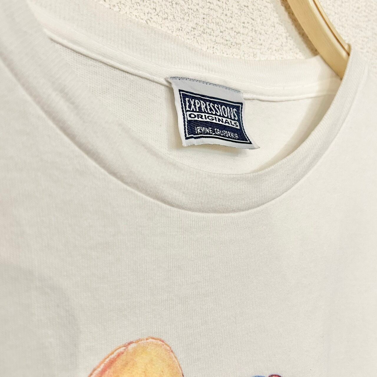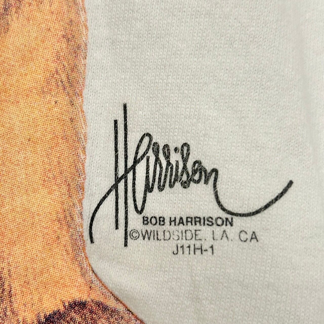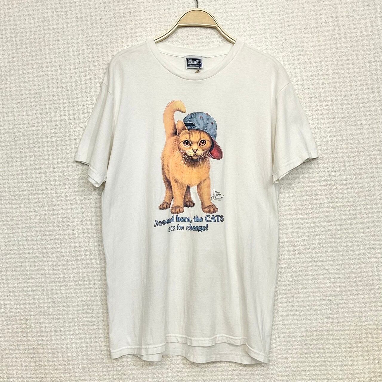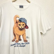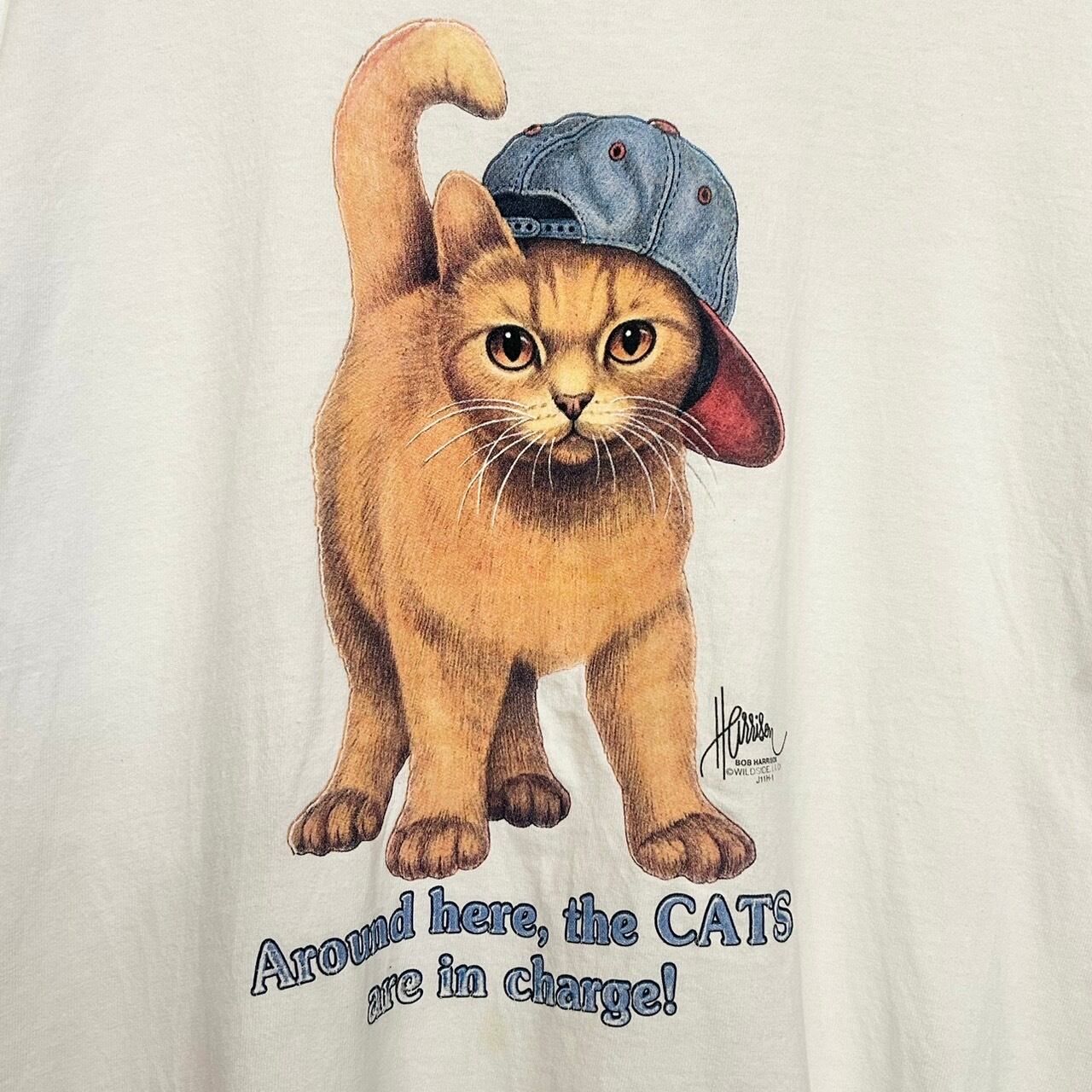 90's ボブハリソン アニマルプリントTシャツ。白のボディにキャップを被ったオレンジ色の毛並みの猫が映えるとても可愛いTシャツです。遊び心がありながら合わせやすい1着です。