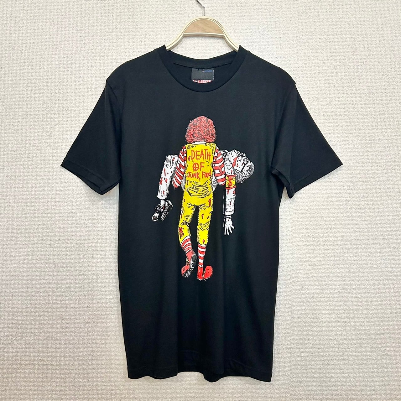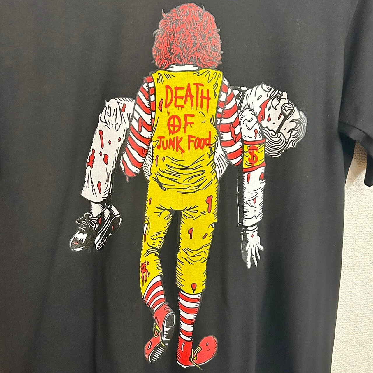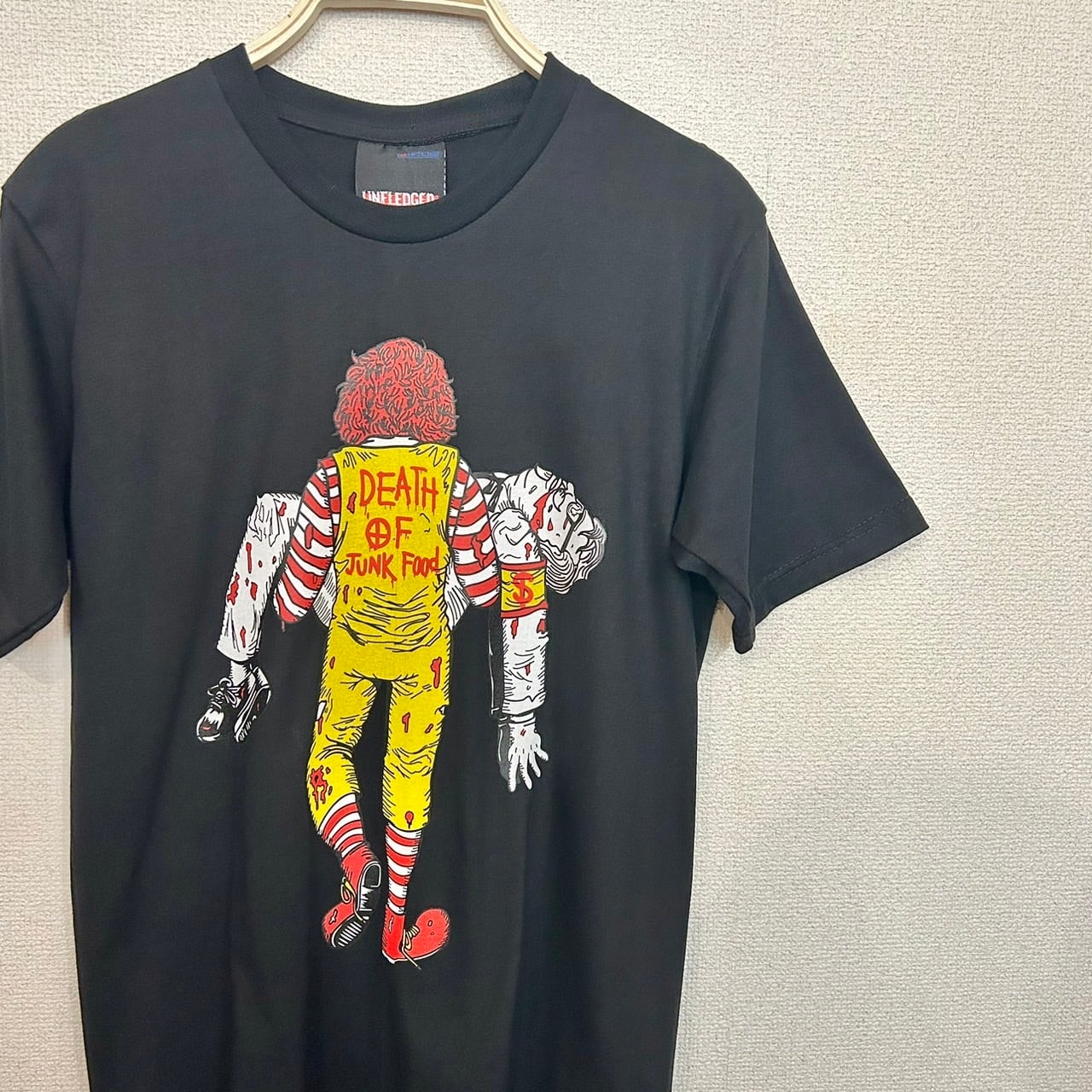 UNFLEDGED ドナルド×カーネルサンダースのパロディTシャツ。マクドナルドのマスコットのドナルドがケンタッキーフライドチキンのマスコットのカーネルおじさんを抱えているその背中にはDEATH OF JUNK Foodと描いてありとてもユーモア溢れるデザインの1着です。