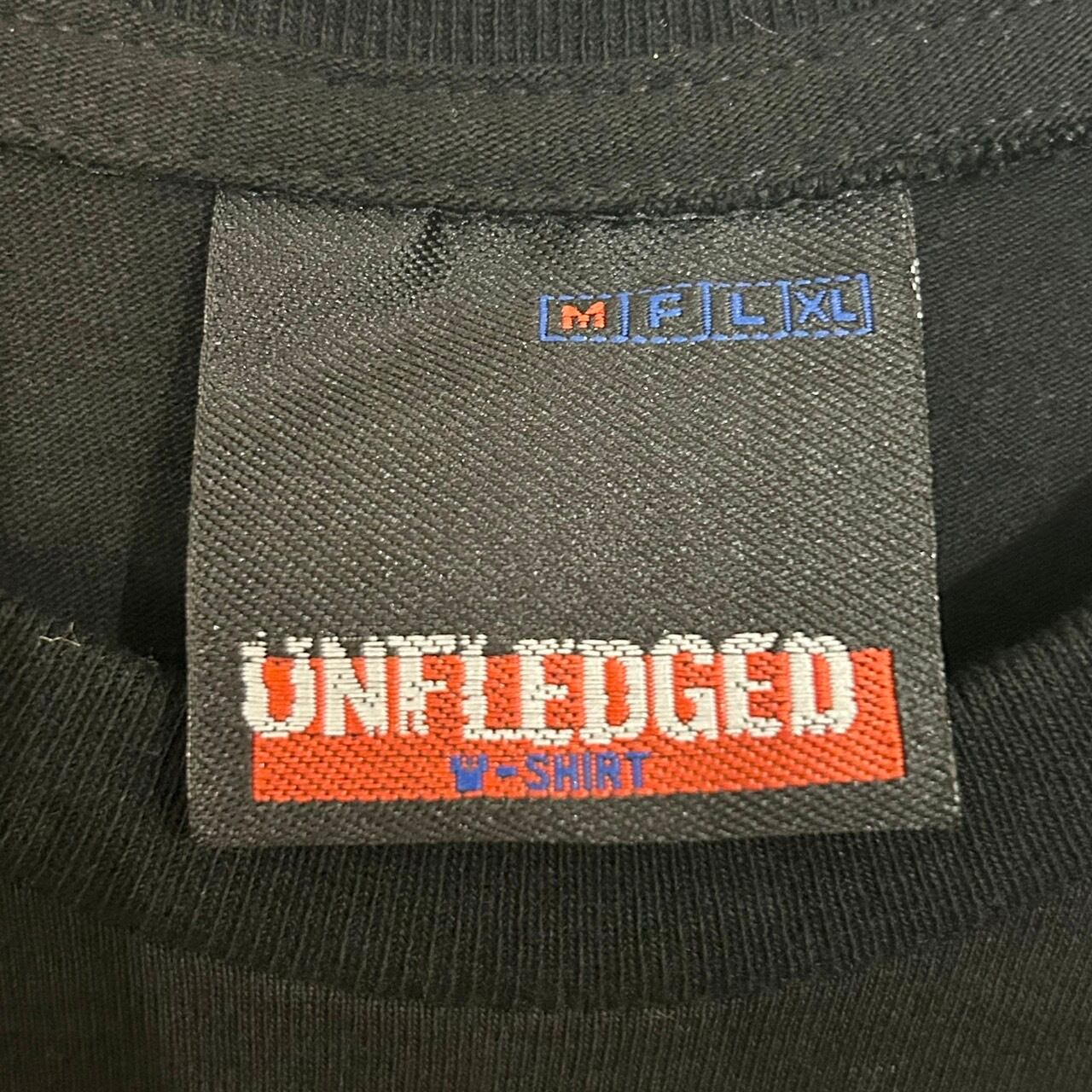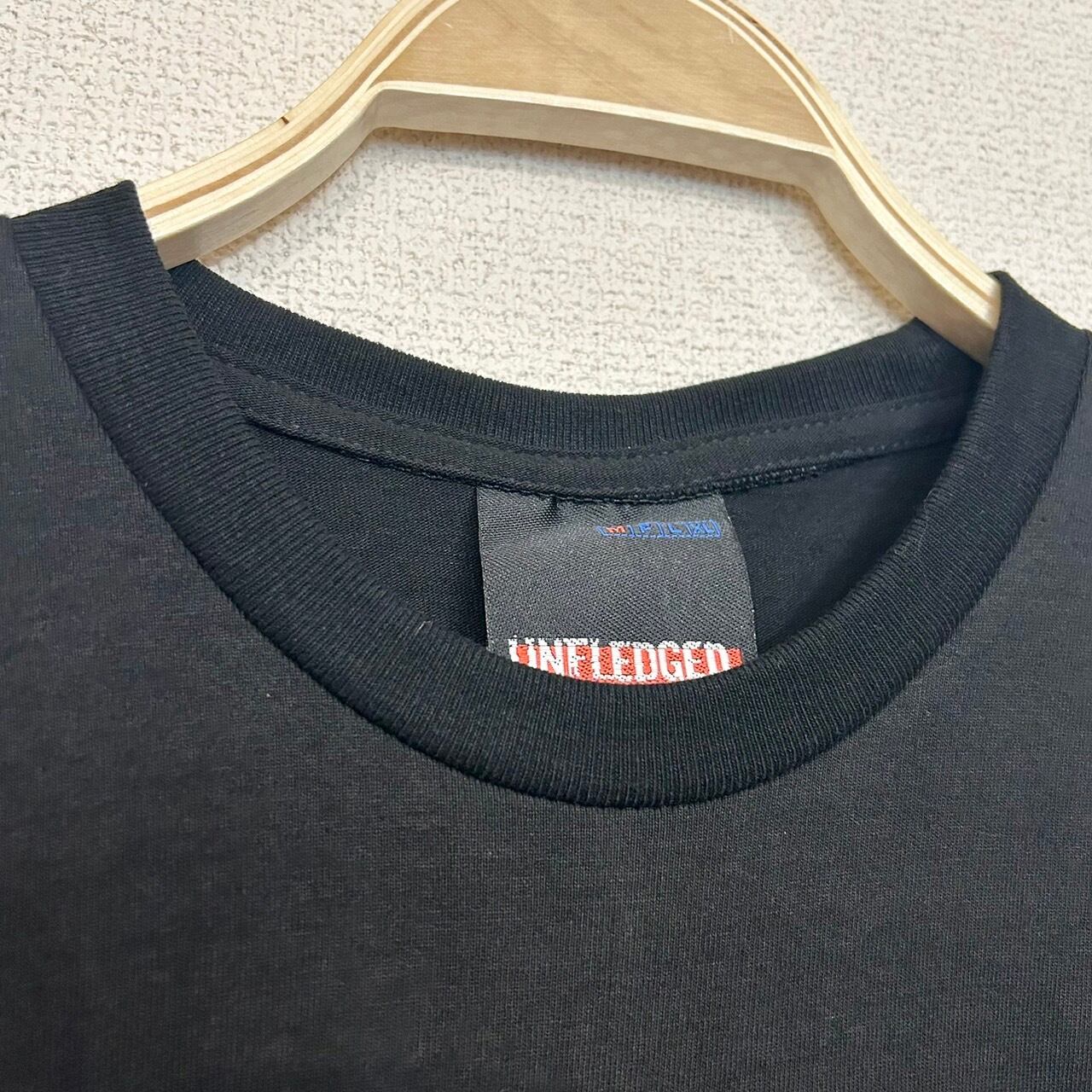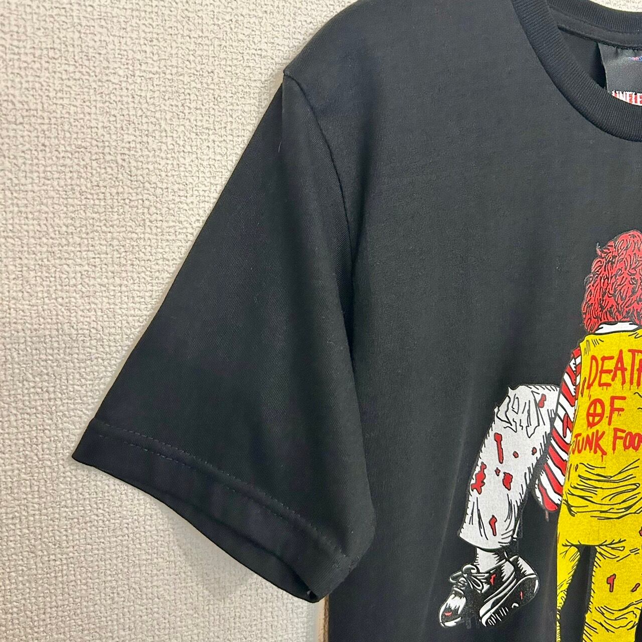 UNFLEDGED ドナルド×カーネルサンダースのパロディTシャツ。マクドナルドのマスコットのドナルドがケンタッキーフライドチキンのマスコットのカーネルおじさんを抱えているその背中にはDEATH OF JUNK Foodと描いてありとてもユーモア溢れるデザインの1着です。