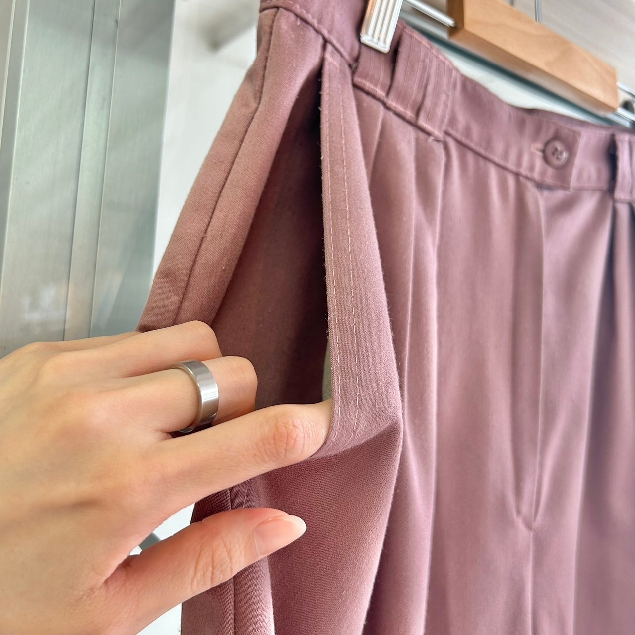C&A candaの膝下丈ハーフパンツ。くすみピンクのような薄紫のような色合いのハーフパンツです。レーヨンの素材感で肌触り柔らかくとても履きやすい1枚です。