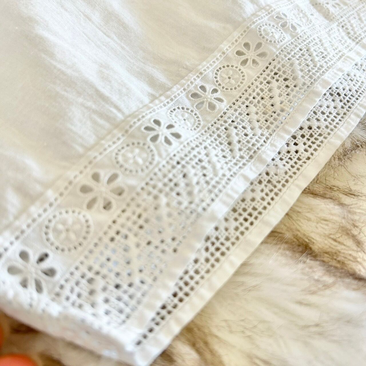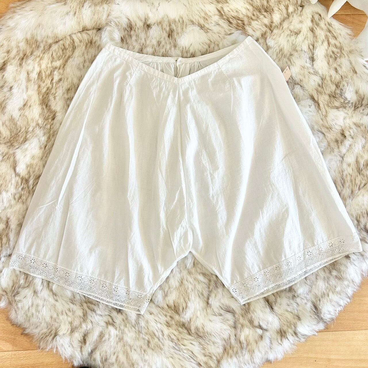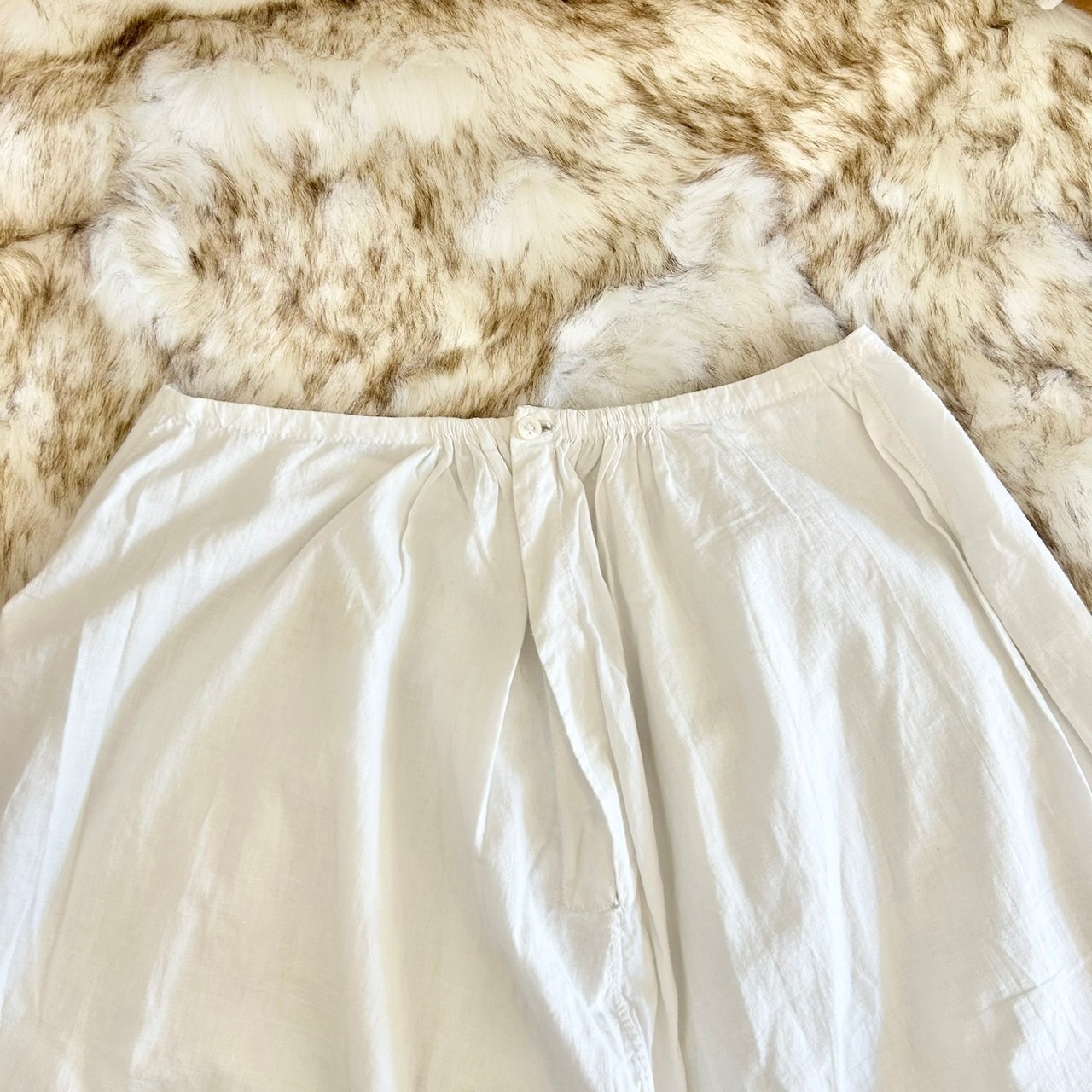 ドロワーズパンツ。膝丈で、後ろのボタンでとめるタイプのパンツです。シンプルですが、裾のレースが可愛い1枚です。デニムパンツの上などレイヤードにオススメです。