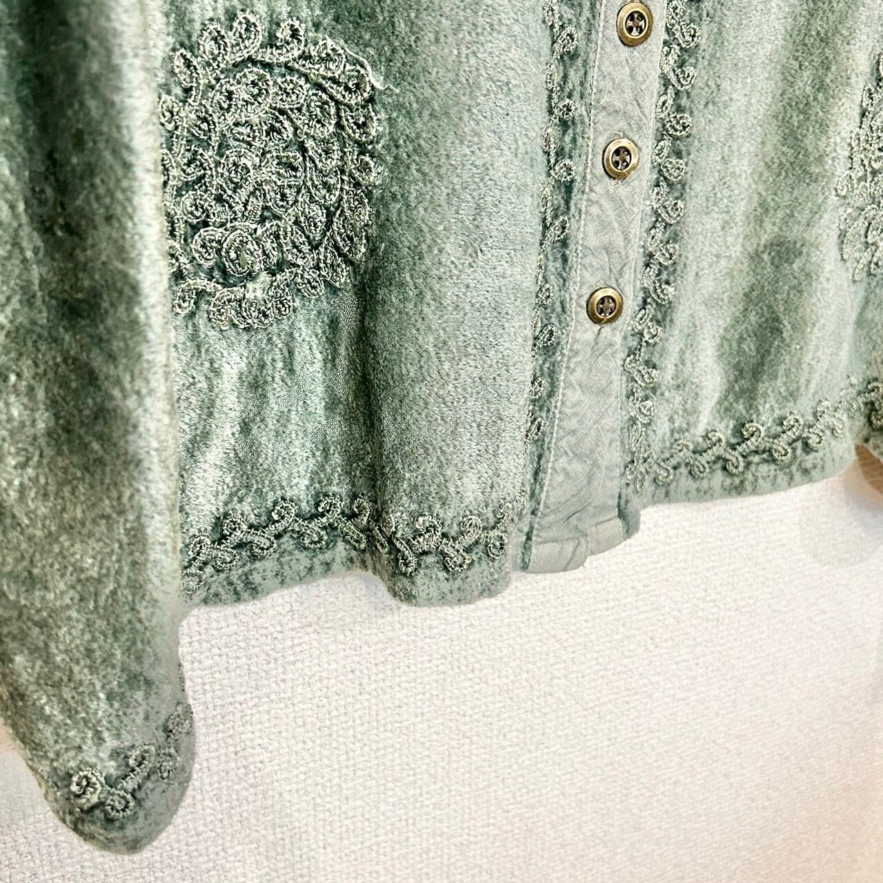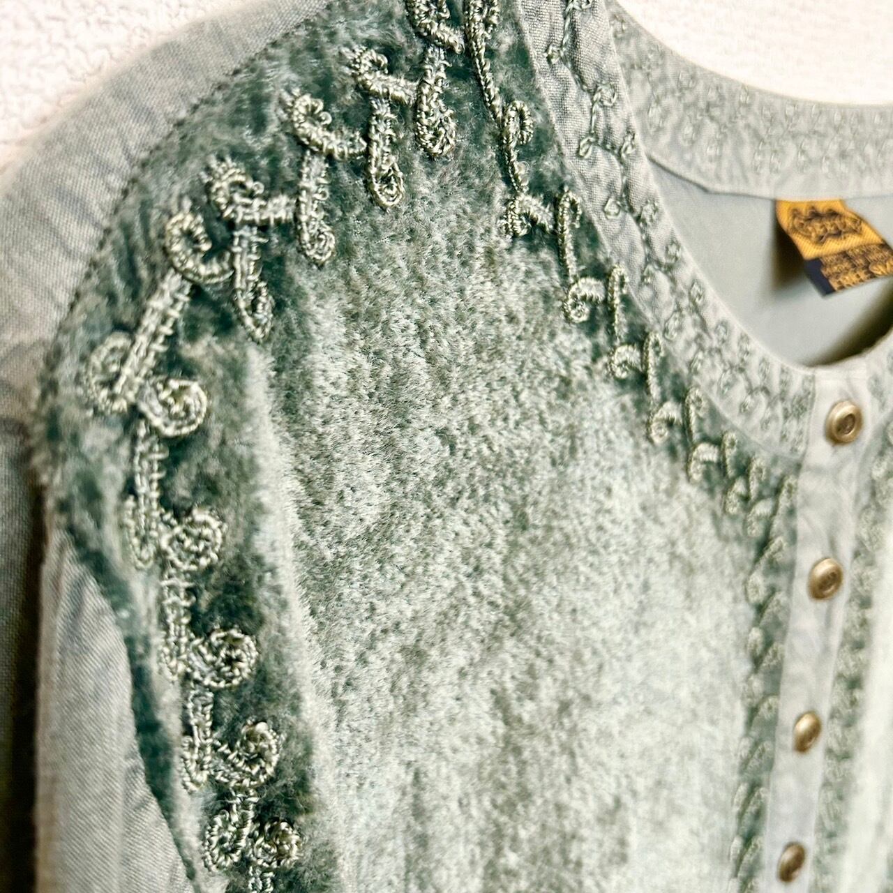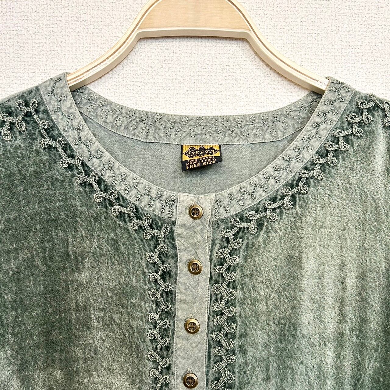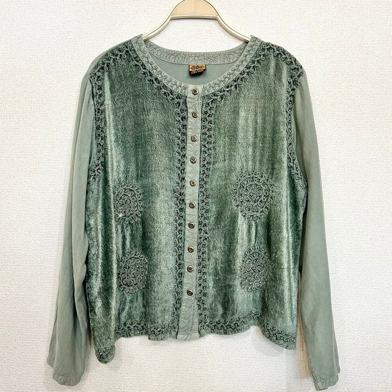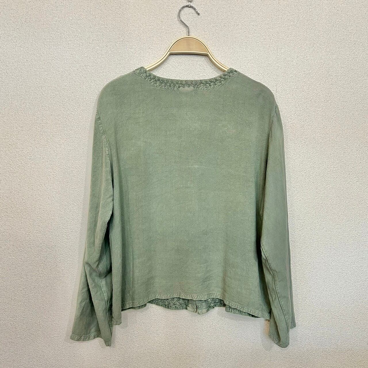 美しい緑色をしたレーヨン刺繍トップスです。フロントの刺繍が素敵な1枚です。どんなカジュアルシーンにも合わせやすく、インナーを変えることであらゆる季節にご着用いただけます。