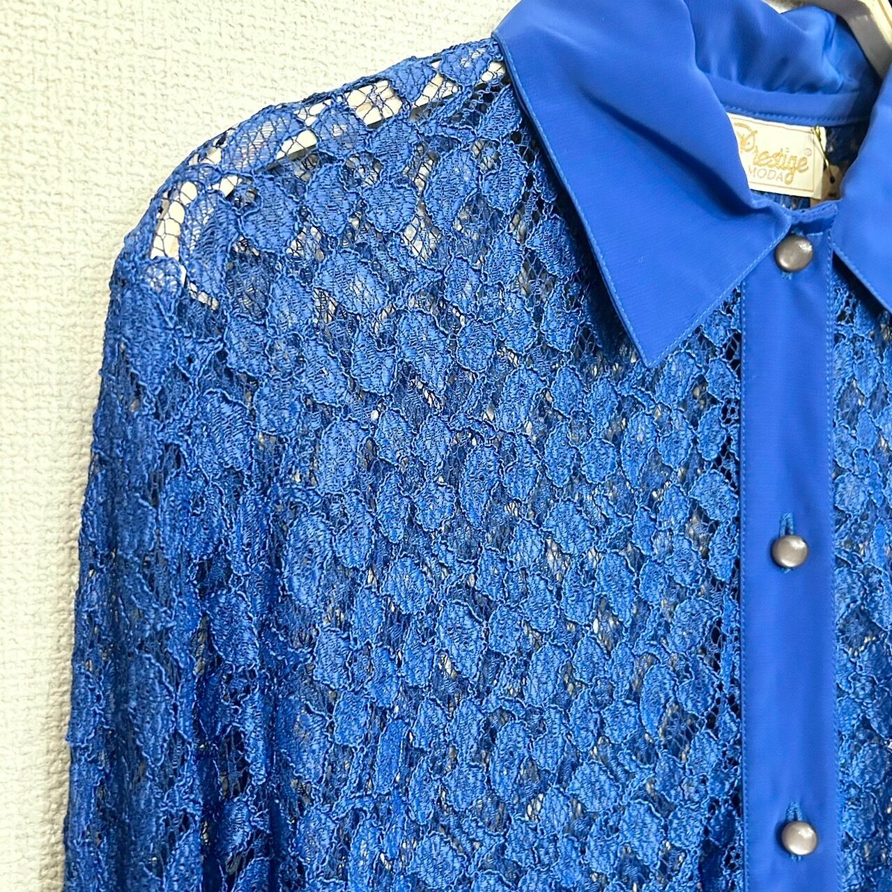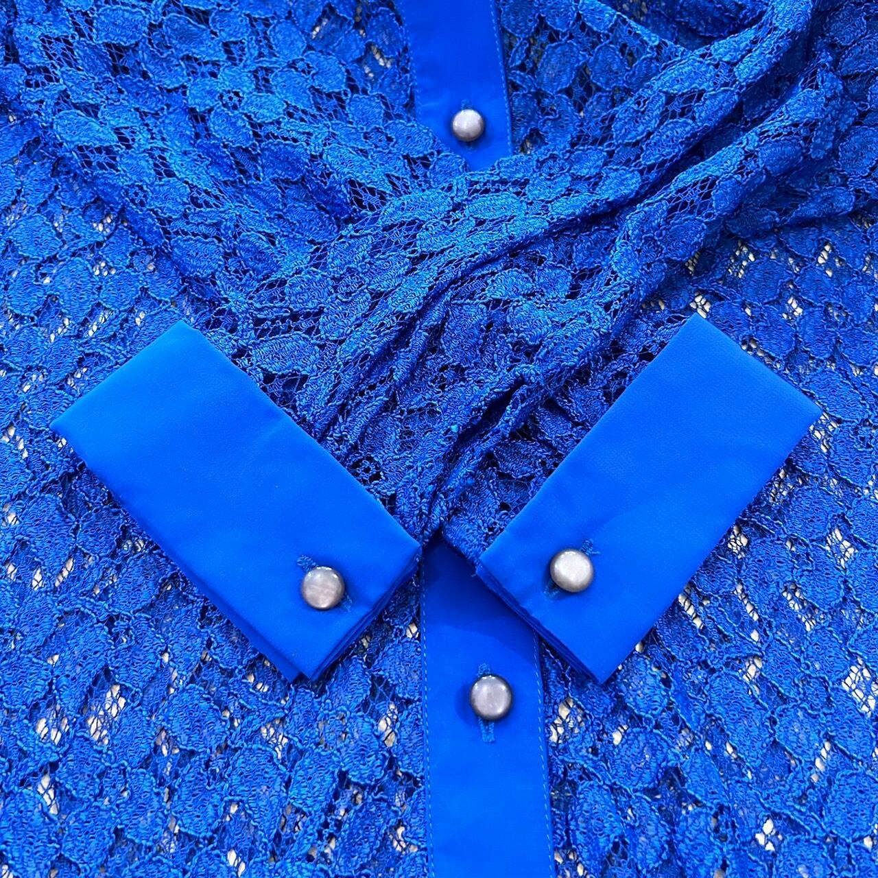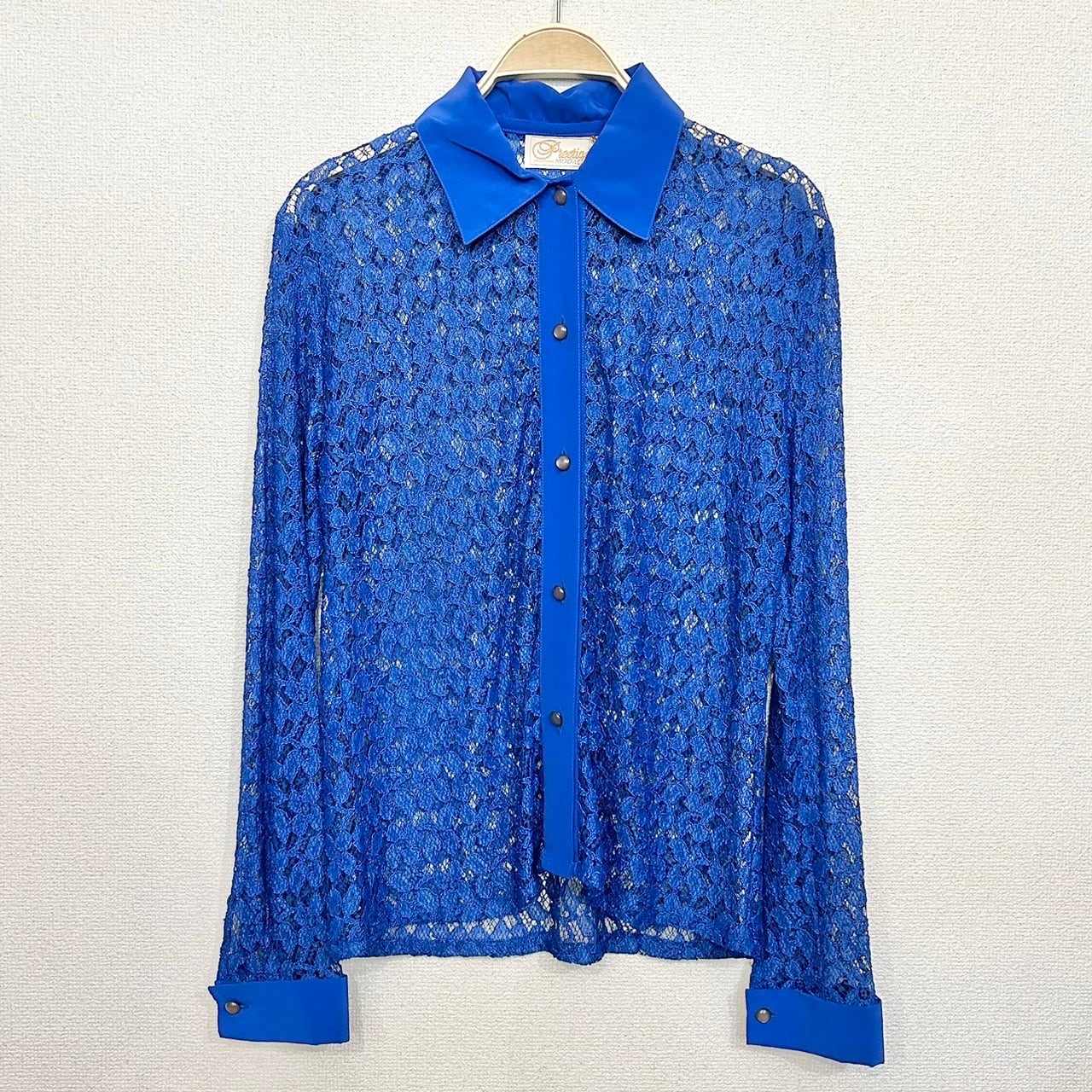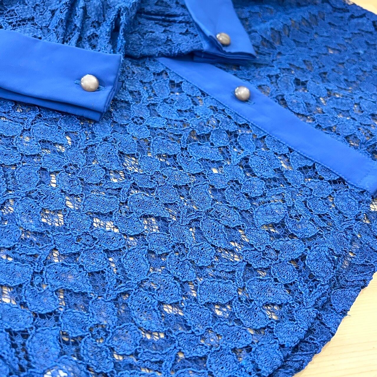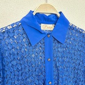 鮮やかなブルーの総レースシャツ。襟と袖の切り返しデザインがアクセントになり、爽やかな印象の1枚です。柔らかいレースが着心地のいいシャツです。1枚でもレイヤードにも使えるアイテムです。