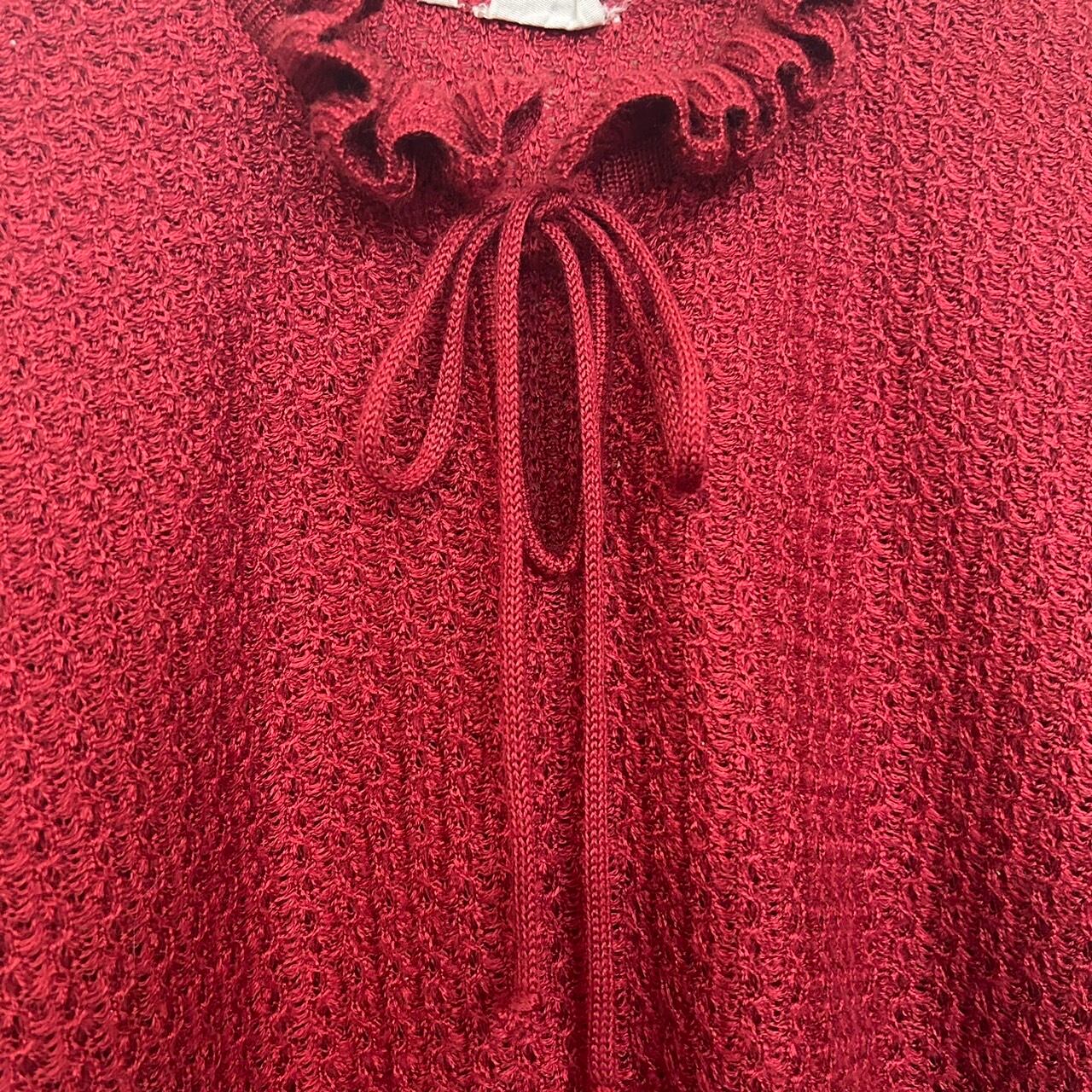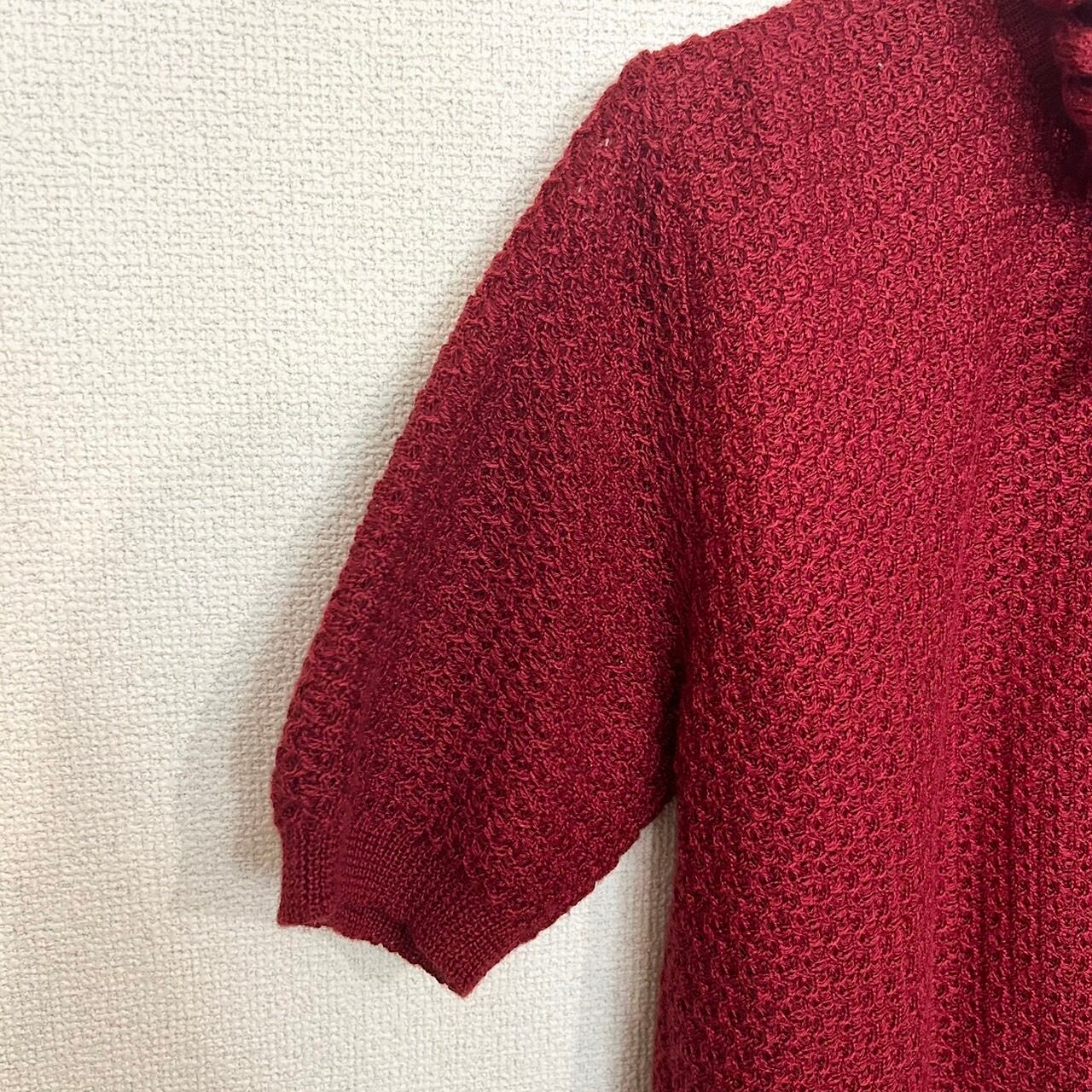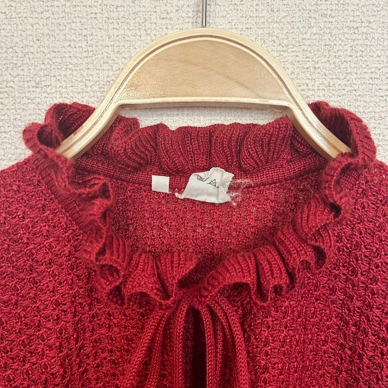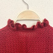 ボリュームのあるフリルの立ち襟とリボンが可愛いニットです。色味が明るすぎない赤色なので甘くなりすぎることなくさらりと着ていただける1着です。スカートやパンツなど色々な組み合わせで楽しめるニットです。