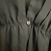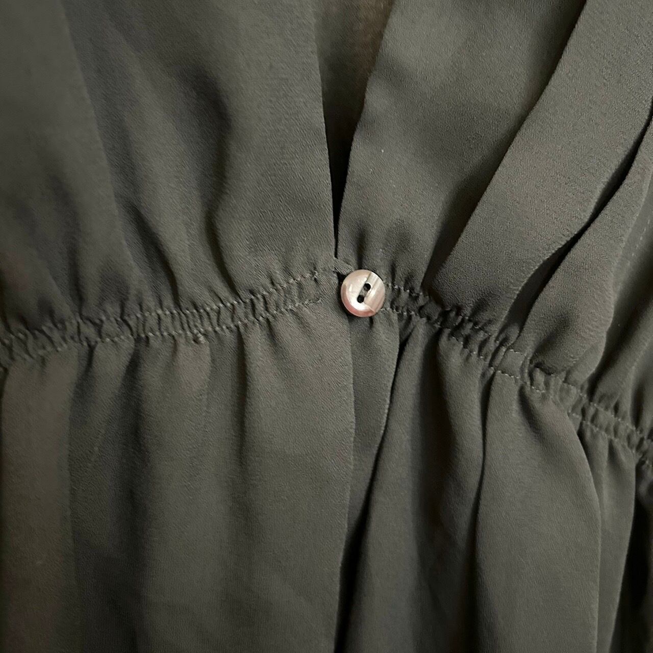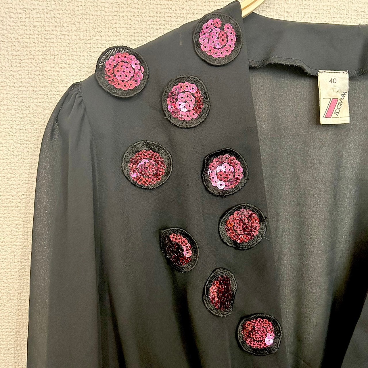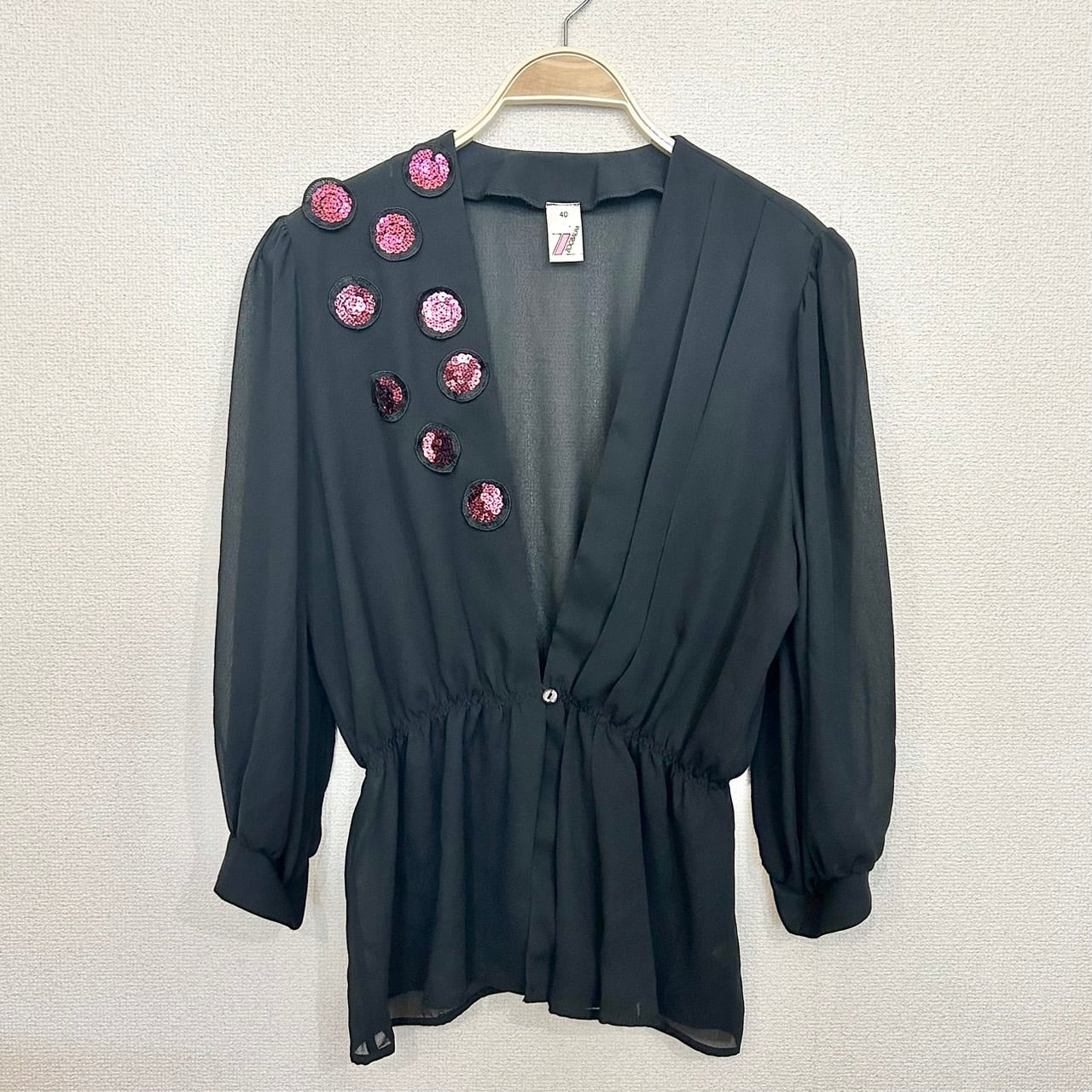 スパンコールデザインのブラウス。程よい透け感とウエストが絞られているシルエットが綺麗なブラウスです。ウエスト部分のボタンをあけることで羽織りにもできる1枚です。