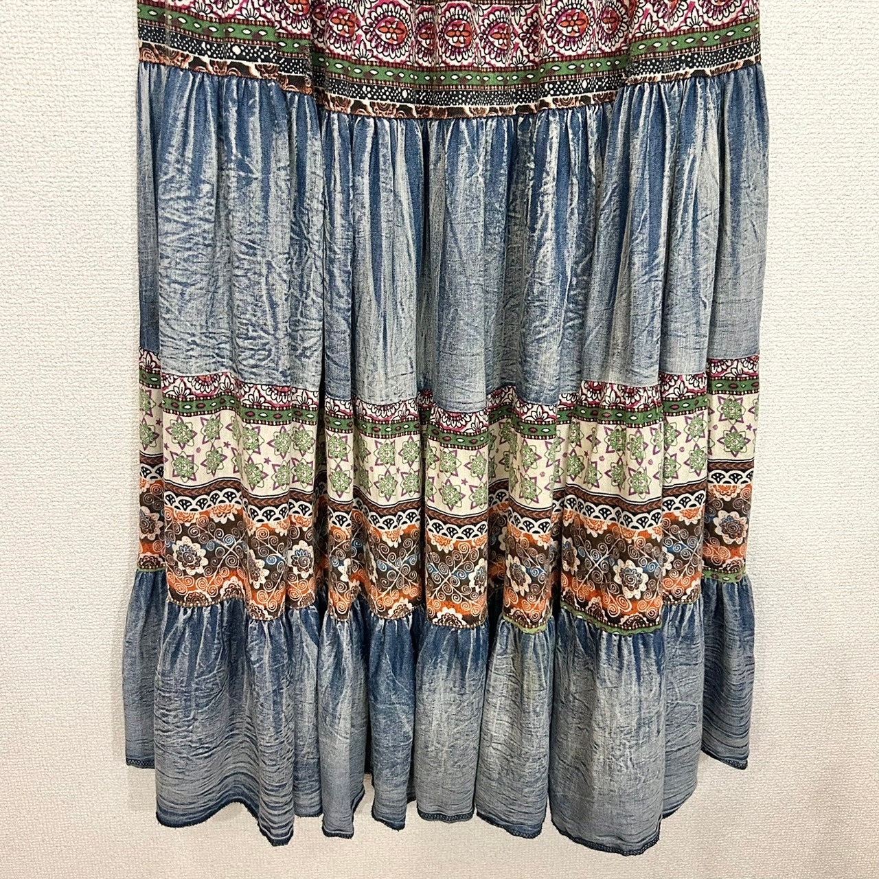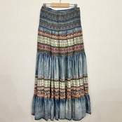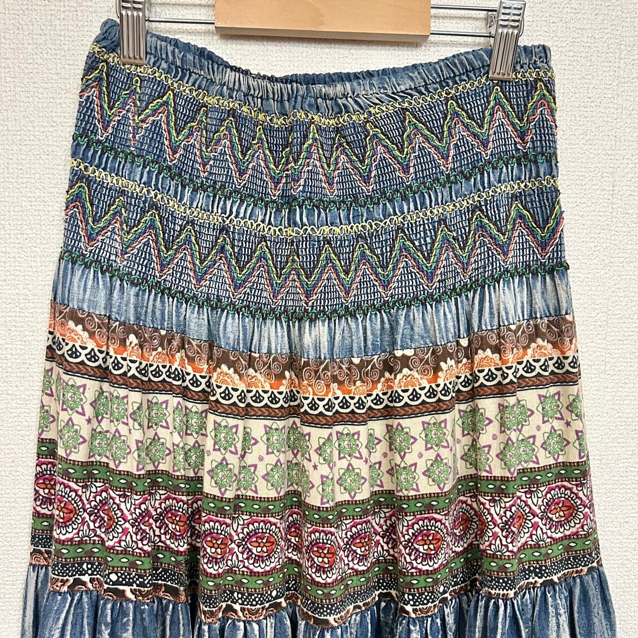 エスニックな雰囲気のロングスカート。ウエストに施された刺繍やエスニック柄、フェード感が魅力的な個性的なスカート。ウエスト周りはゴムになっているので、チューブトップのワンピースとしても着ることができます。さらっとした履き心地で、これからの季節にぴったりの1枚です。