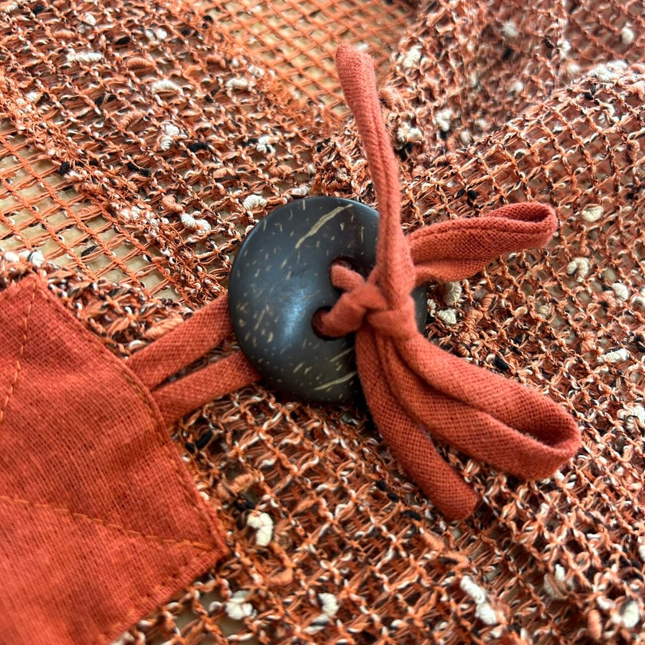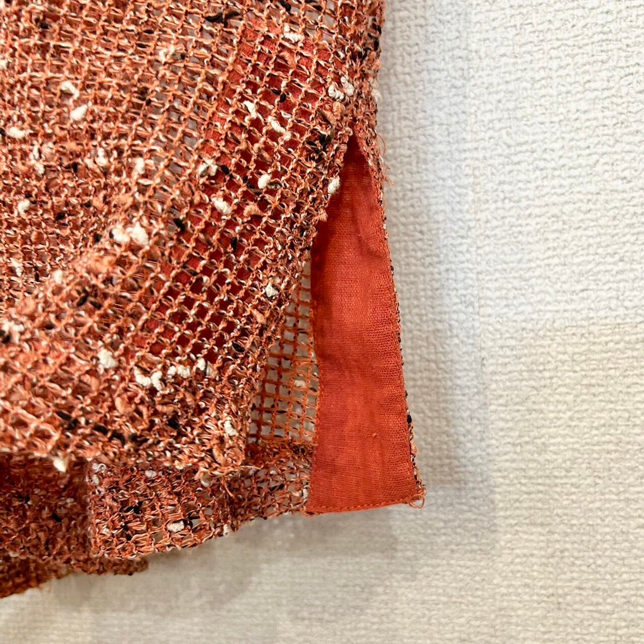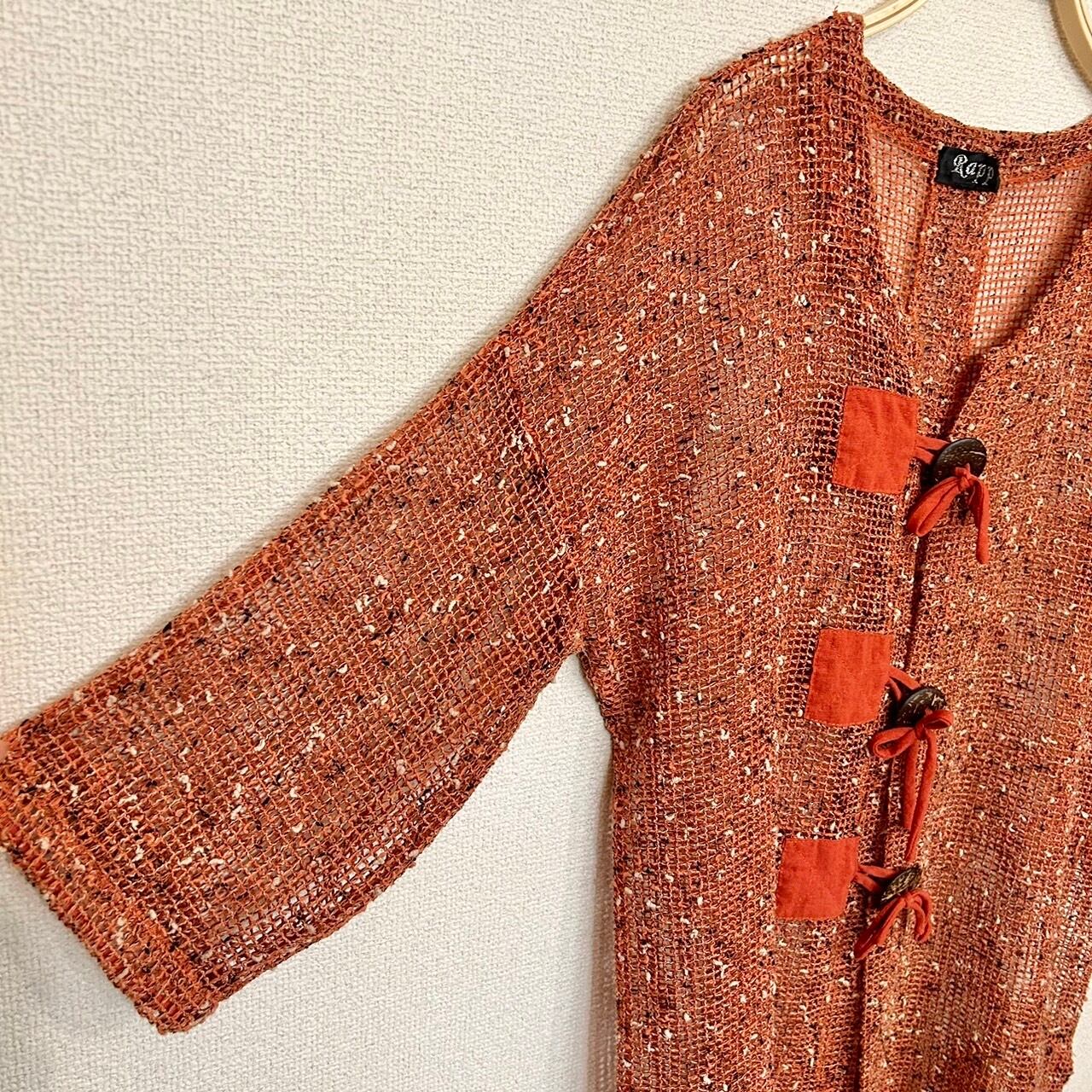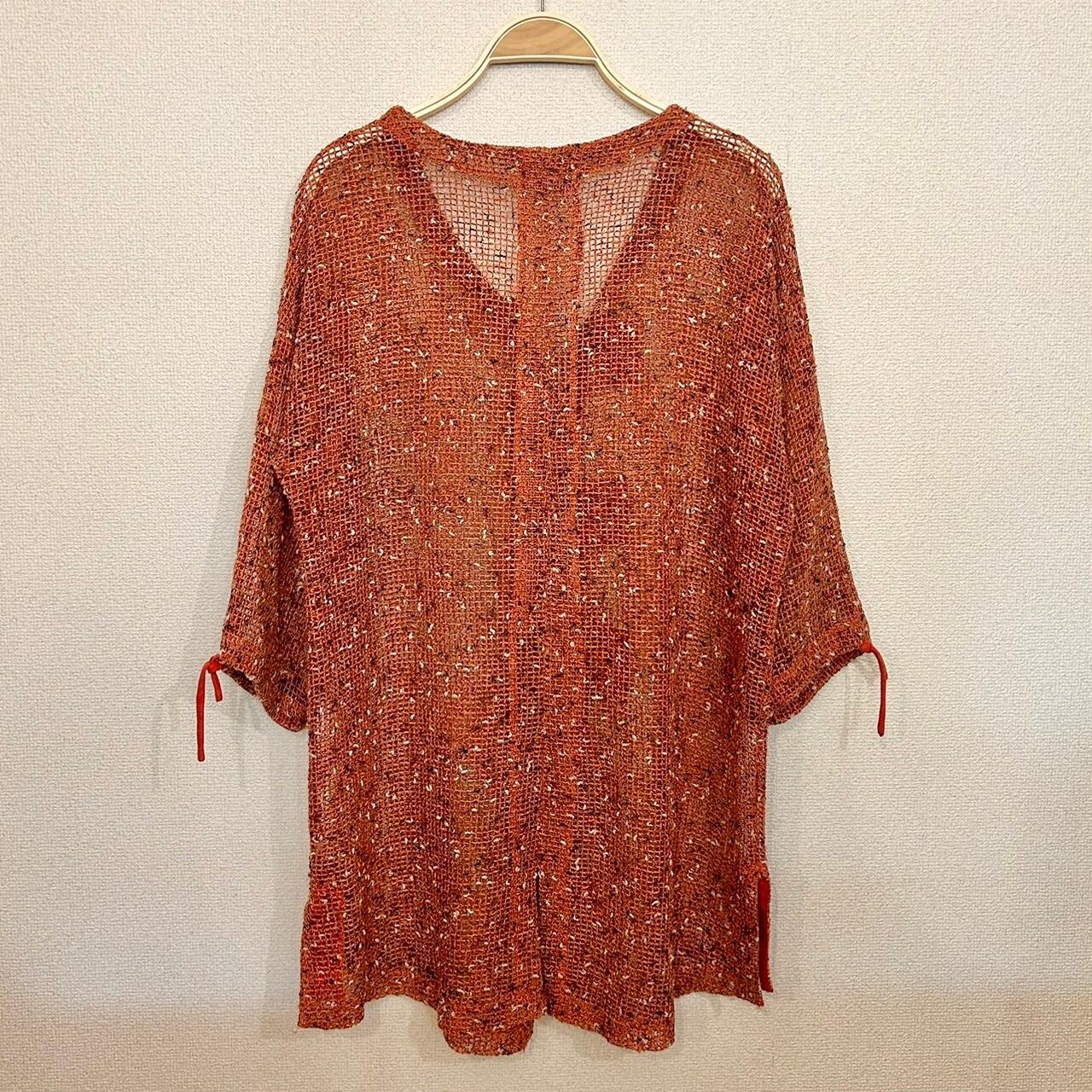 大きめボタンがアクセントになった透かし編みのトップス。フロントボタンのデザインとエンジ色のボディが素敵な一枚です。