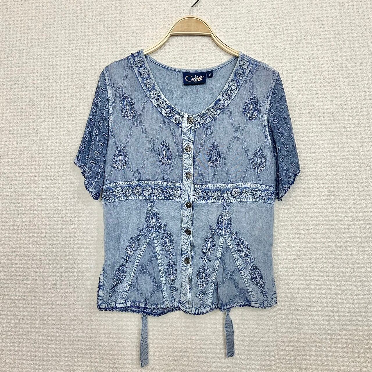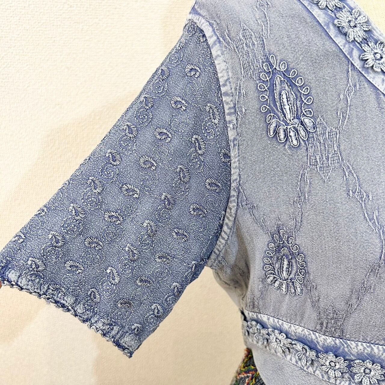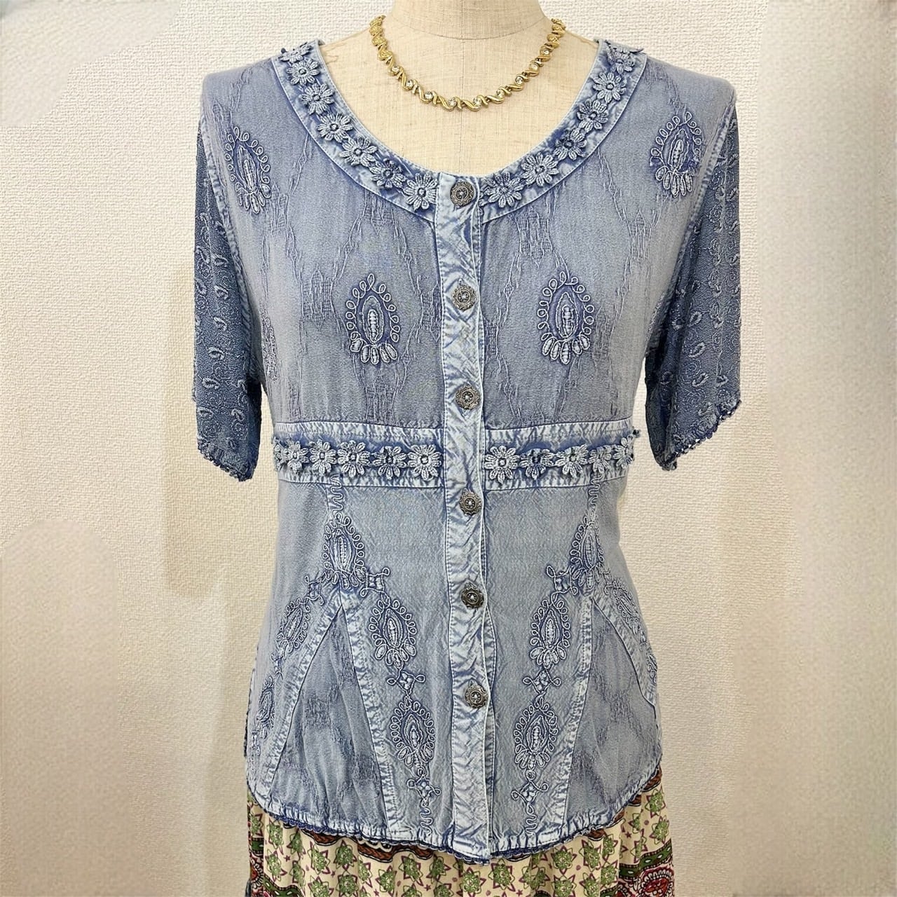 インドレーヨン刺繍トップス。フロント全体にインド刺繍が施された半袖シャツ。袖は透け感のある素材で刺繍が施されていて、後ろには紐が付いていて縛ることでウエスト周りをシュッとさせることができます。フェード感がある青色が素敵な1着です。