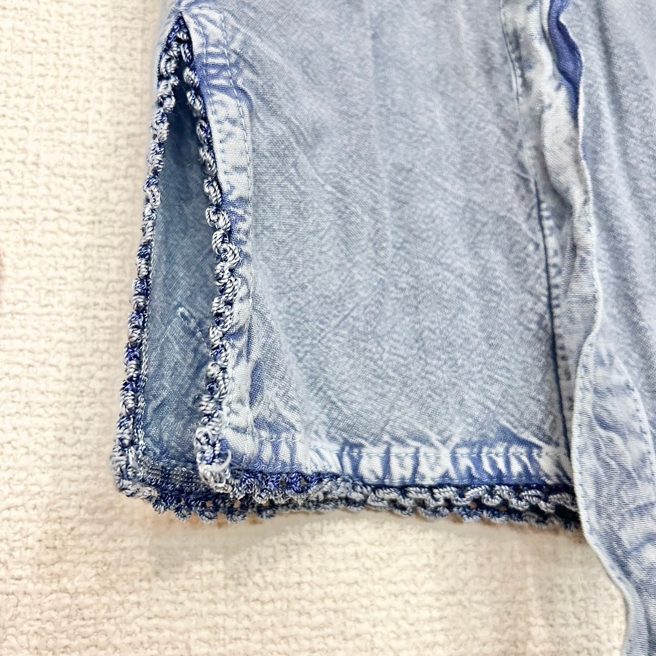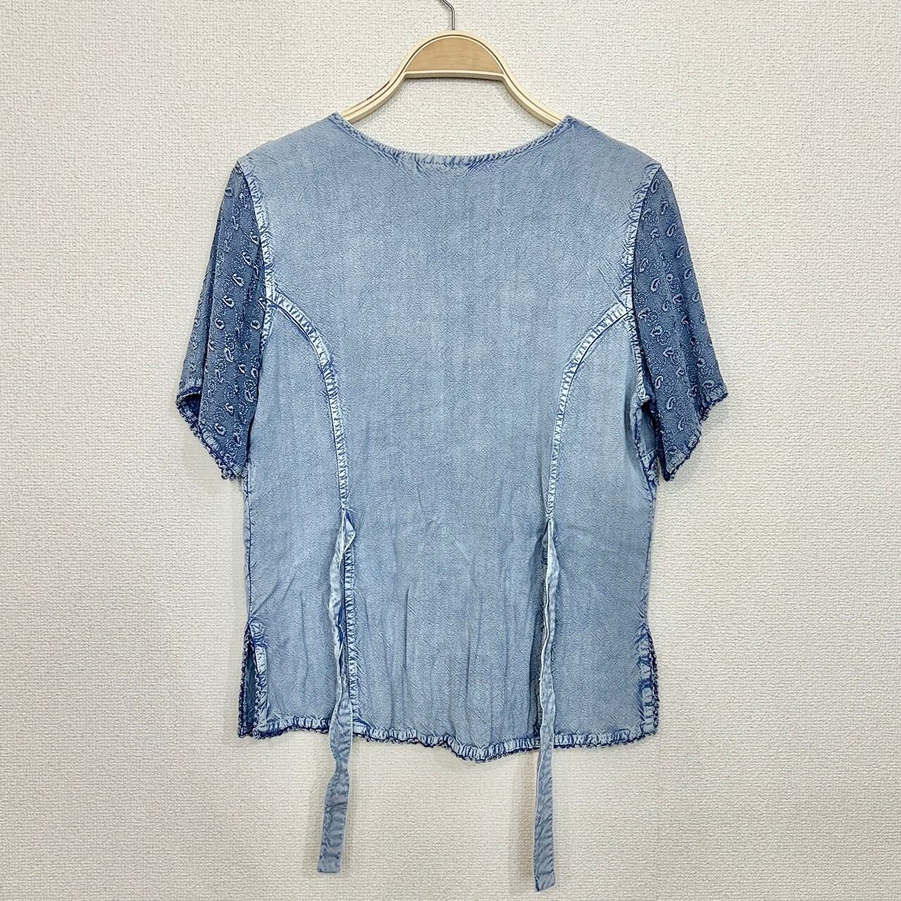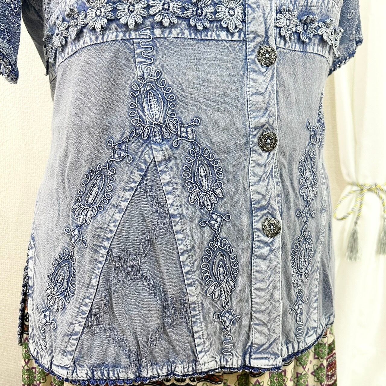 インドレーヨン刺繍トップス。フロント全体にインド刺繍が施された半袖シャツ。袖は透け感のある素材で刺繍が施されていて、後ろには紐が付いていて縛ることでウエスト周りをシュッとさせることができます。フェード感がある青色が素敵な1着です。
