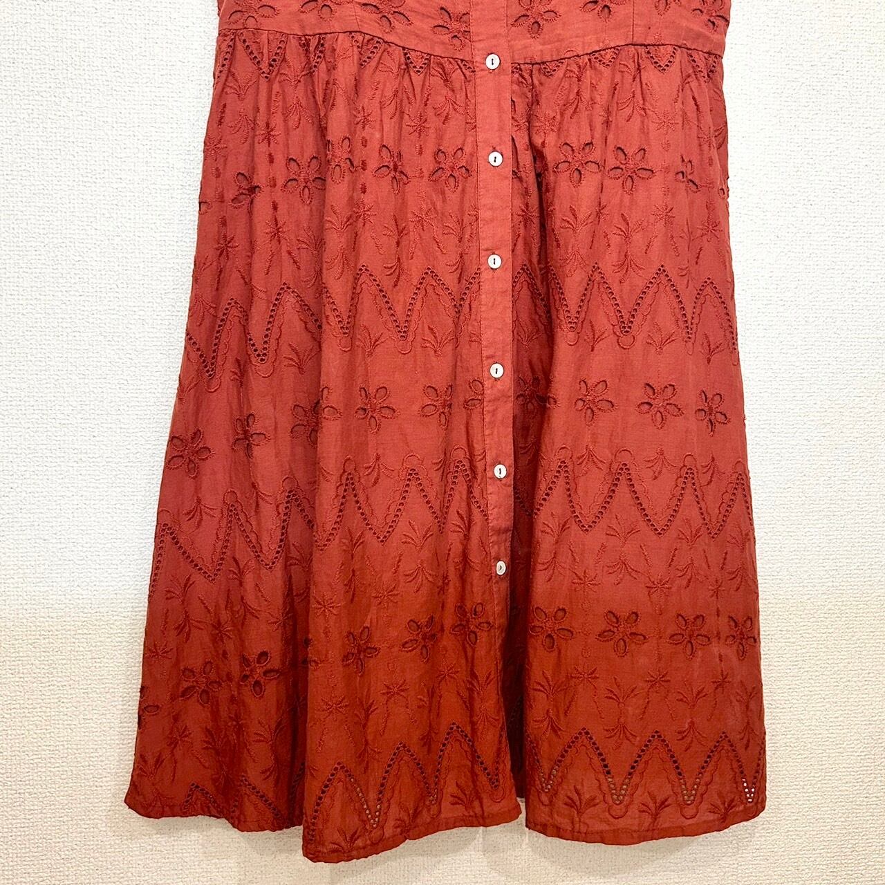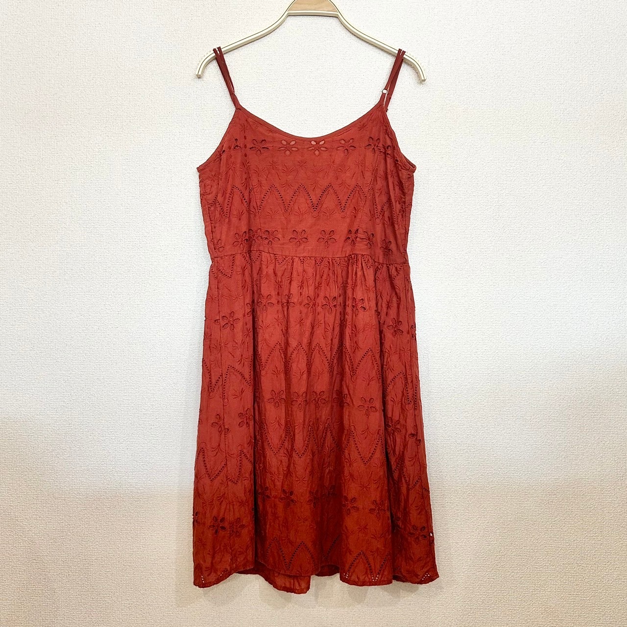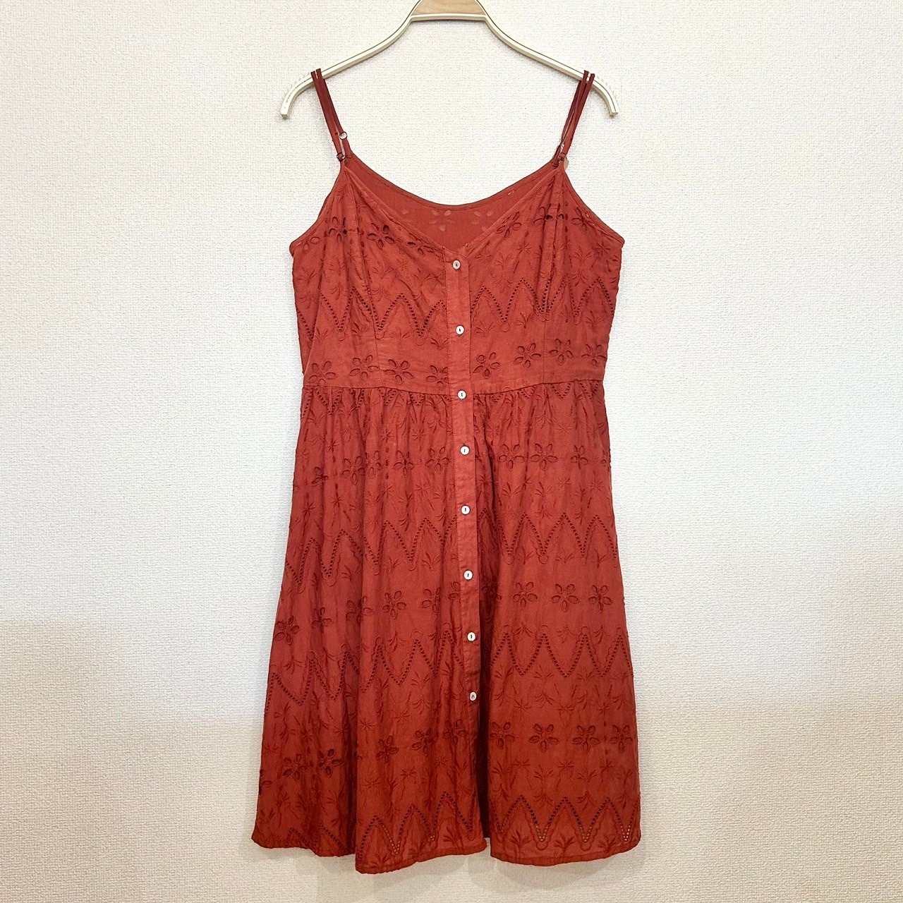 カーミン色の素敵なキャミワンピース。フロントボタン2段目までの間にスナップボタンが付いているので胸元が隙間から見えることがありませんし、裏地に薄手の布が付いているので透けることなく着れる1枚です。1枚でもレイヤードしても可愛いワンピースです。
