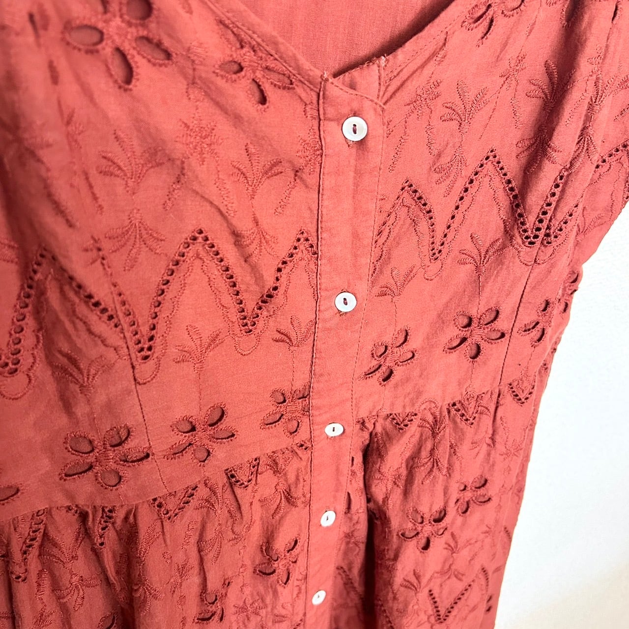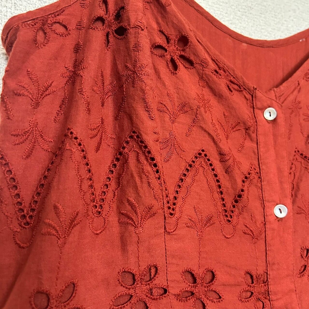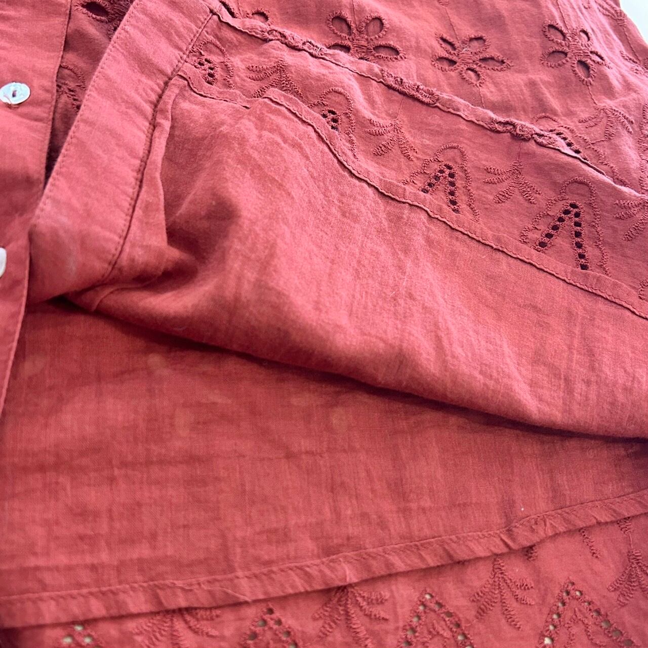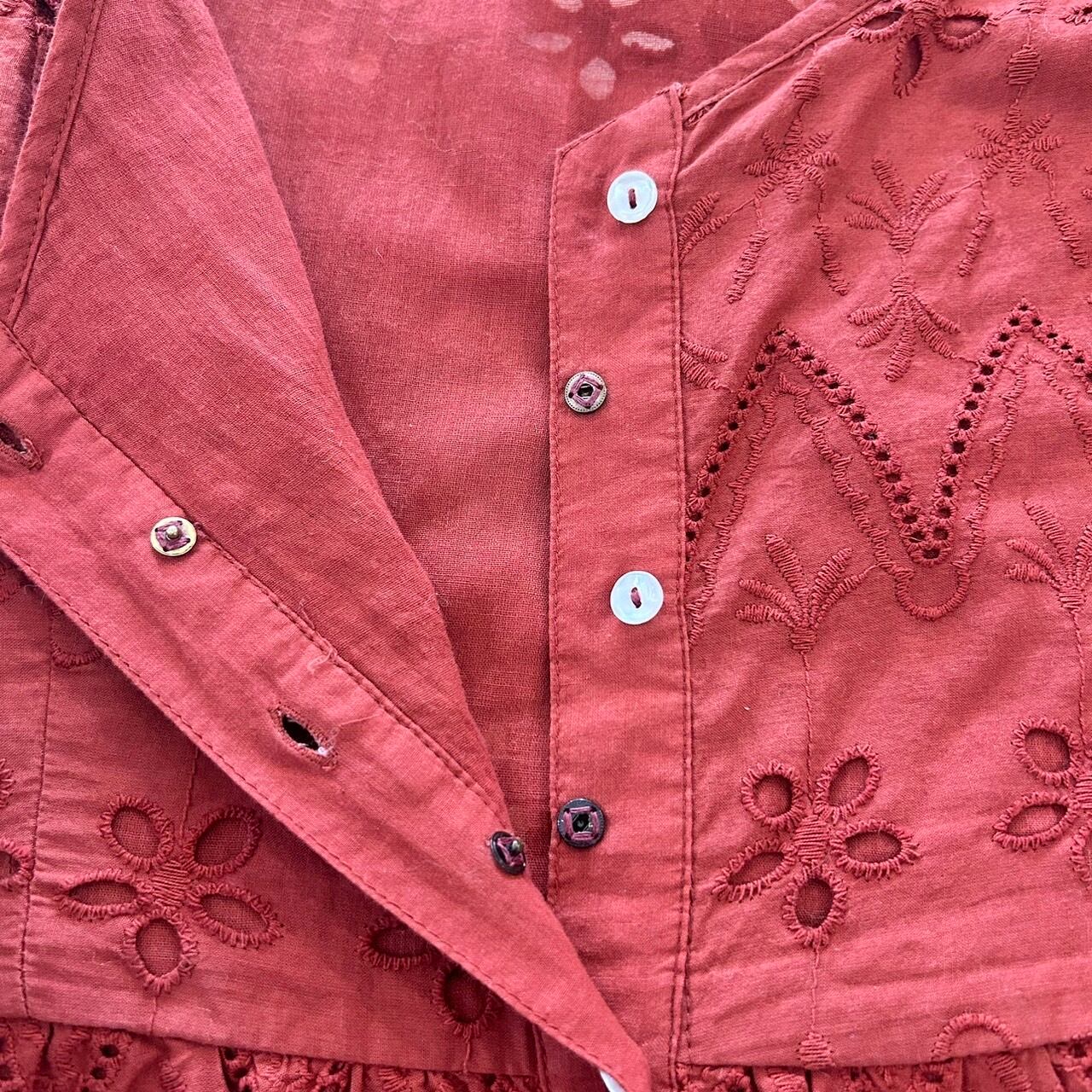 カーミン色の素敵なキャミワンピース。フロントボタン2段目までの間にスナップボタンが付いているので胸元が隙間から見えることがありませんし、裏地に薄手の布が付いているので透けることなく着れる1枚です。1枚でもレイヤードしても可愛いワンピースです。