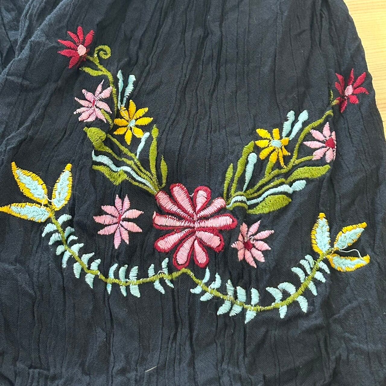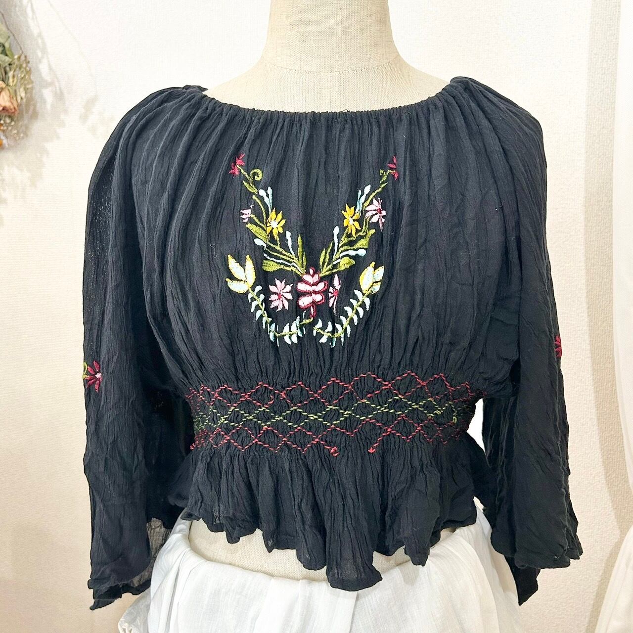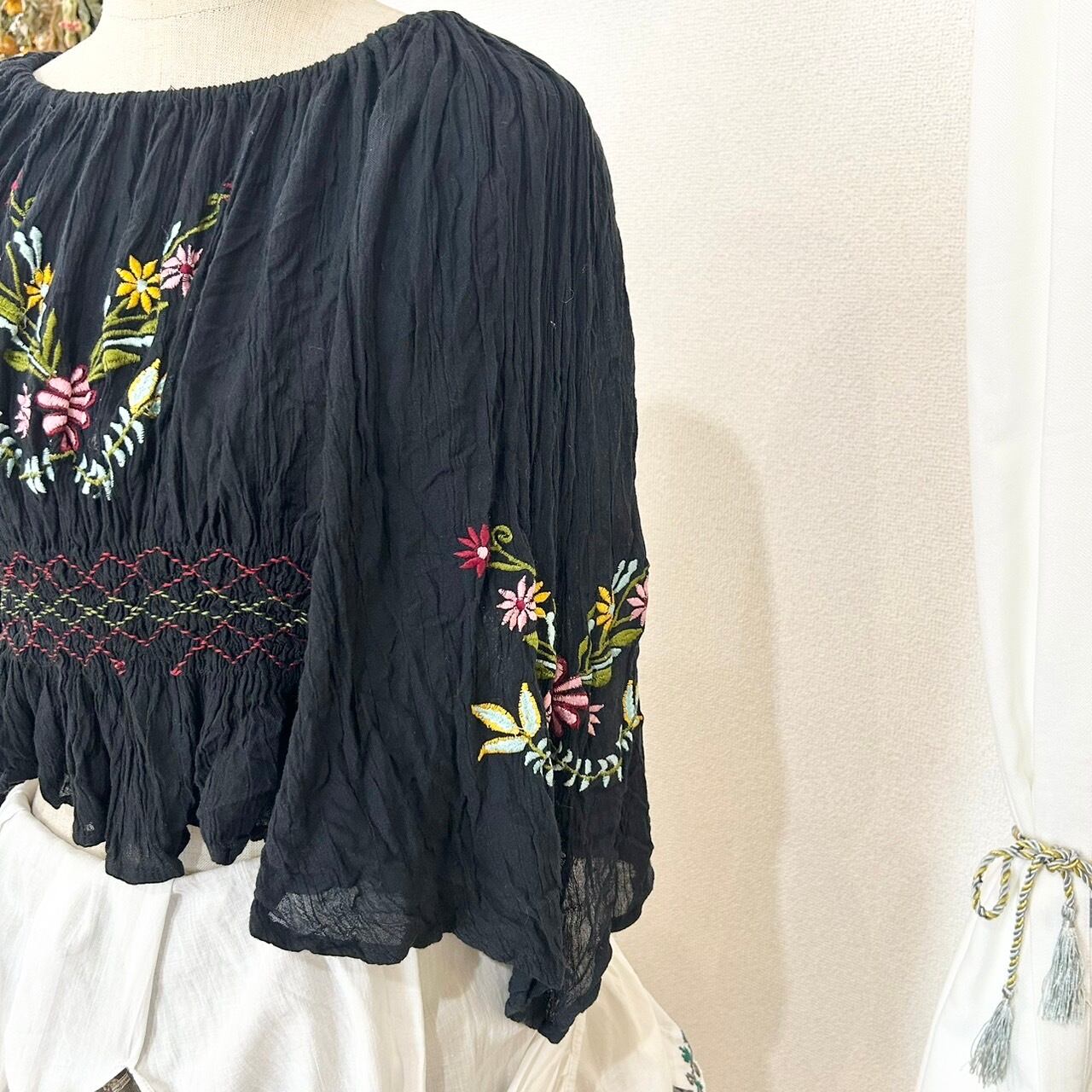 インド刺繍が施されたショート丈のトップス。胸元と袖に花の刺繍が素敵な1枚です。軽やかな素材感で暑い季節に着るのにピッタリな1着です。オフショルで着るのも可愛い。