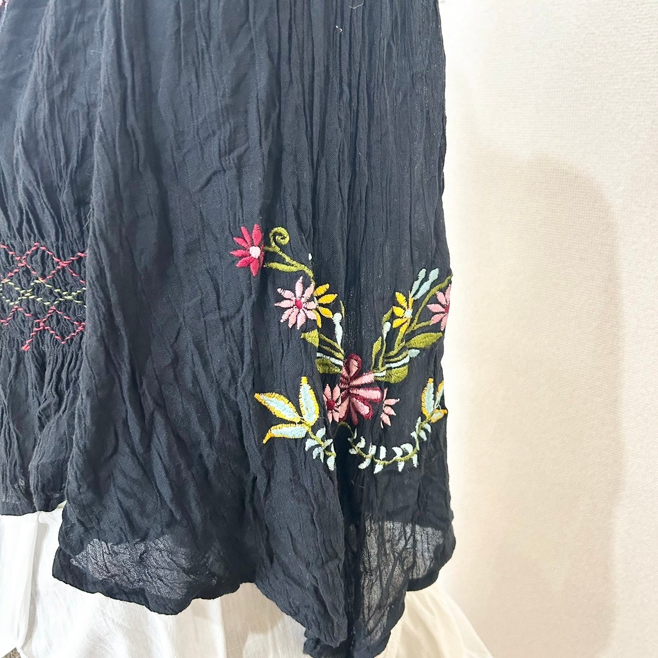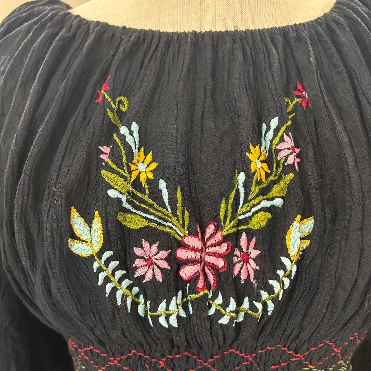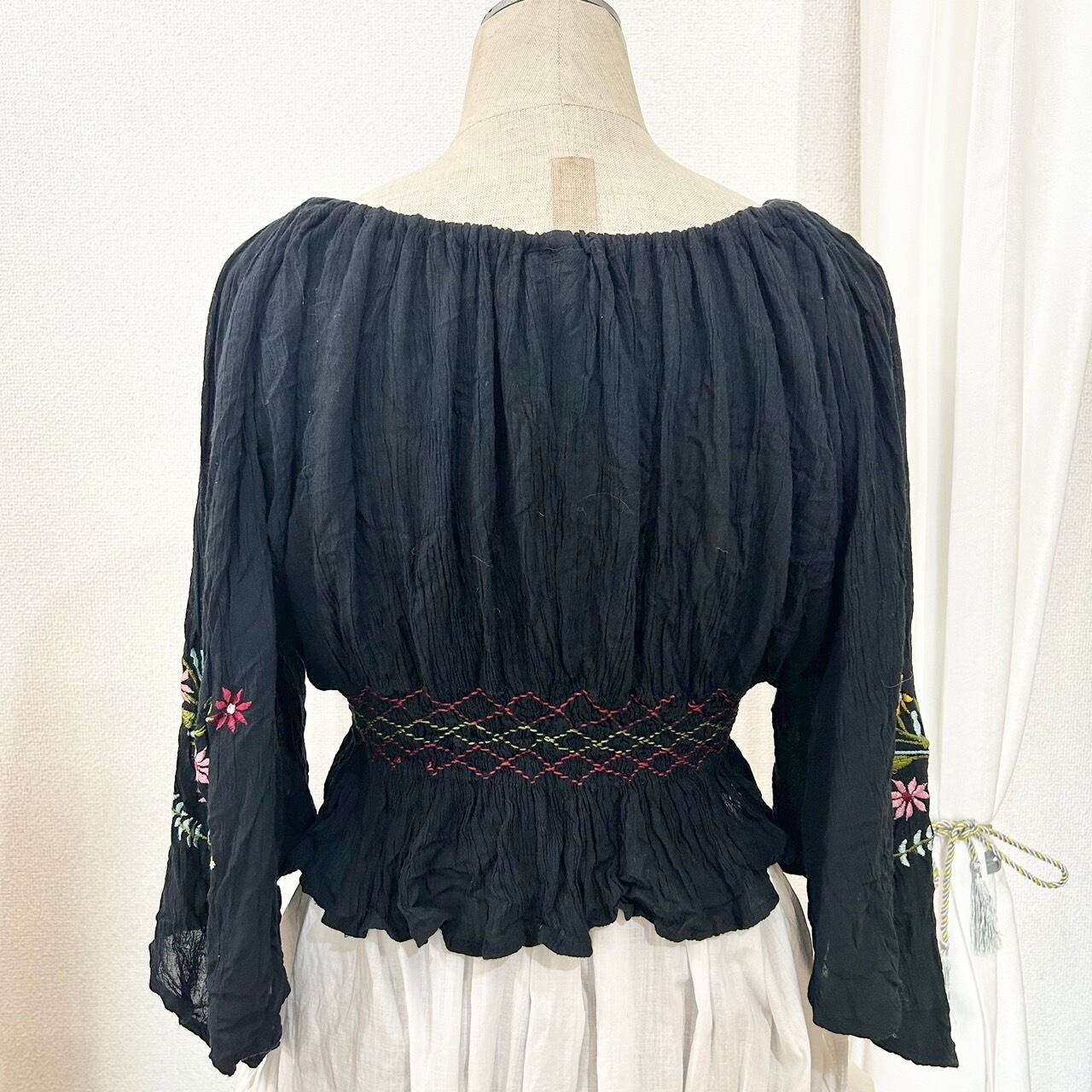 インド刺繍が施されたショート丈のトップス。胸元と袖に花の刺繍が素敵な1枚です。軽やかな素材感で暑い季節に着るのにピッタリな1着です。オフショルで着るのも可愛い。