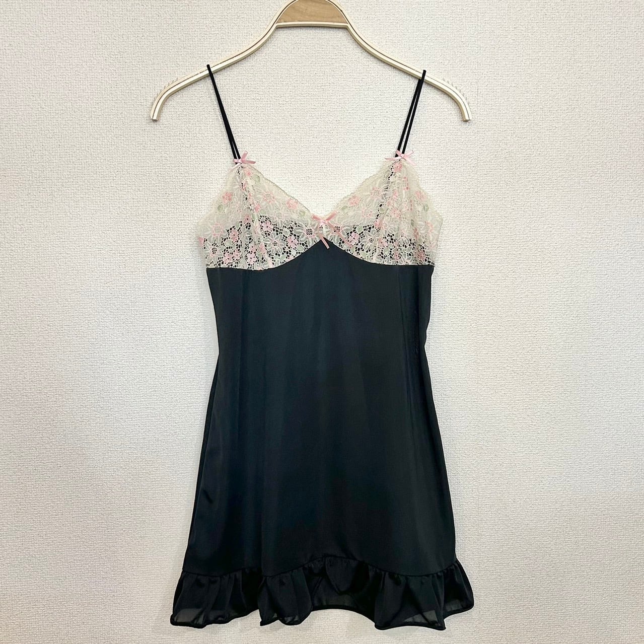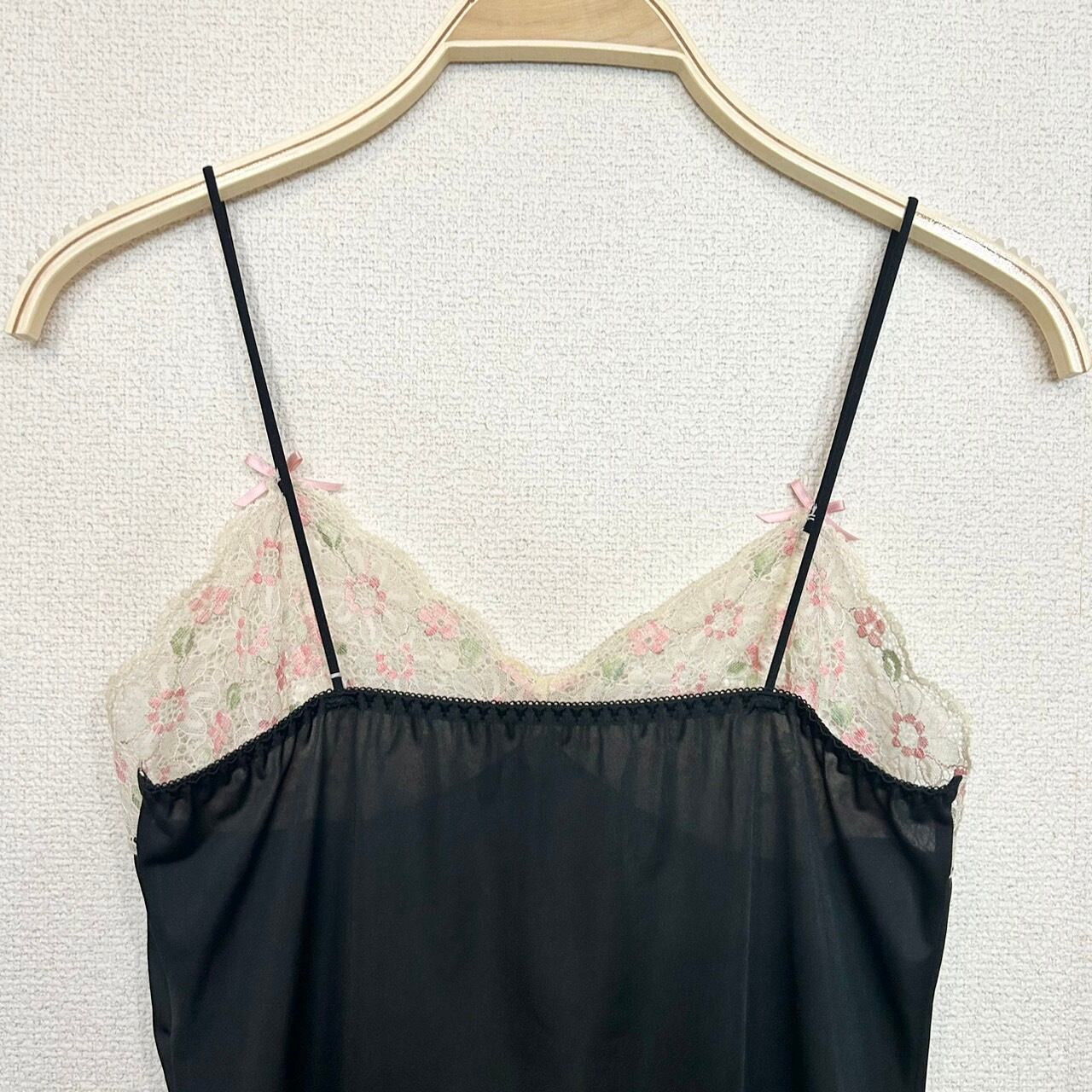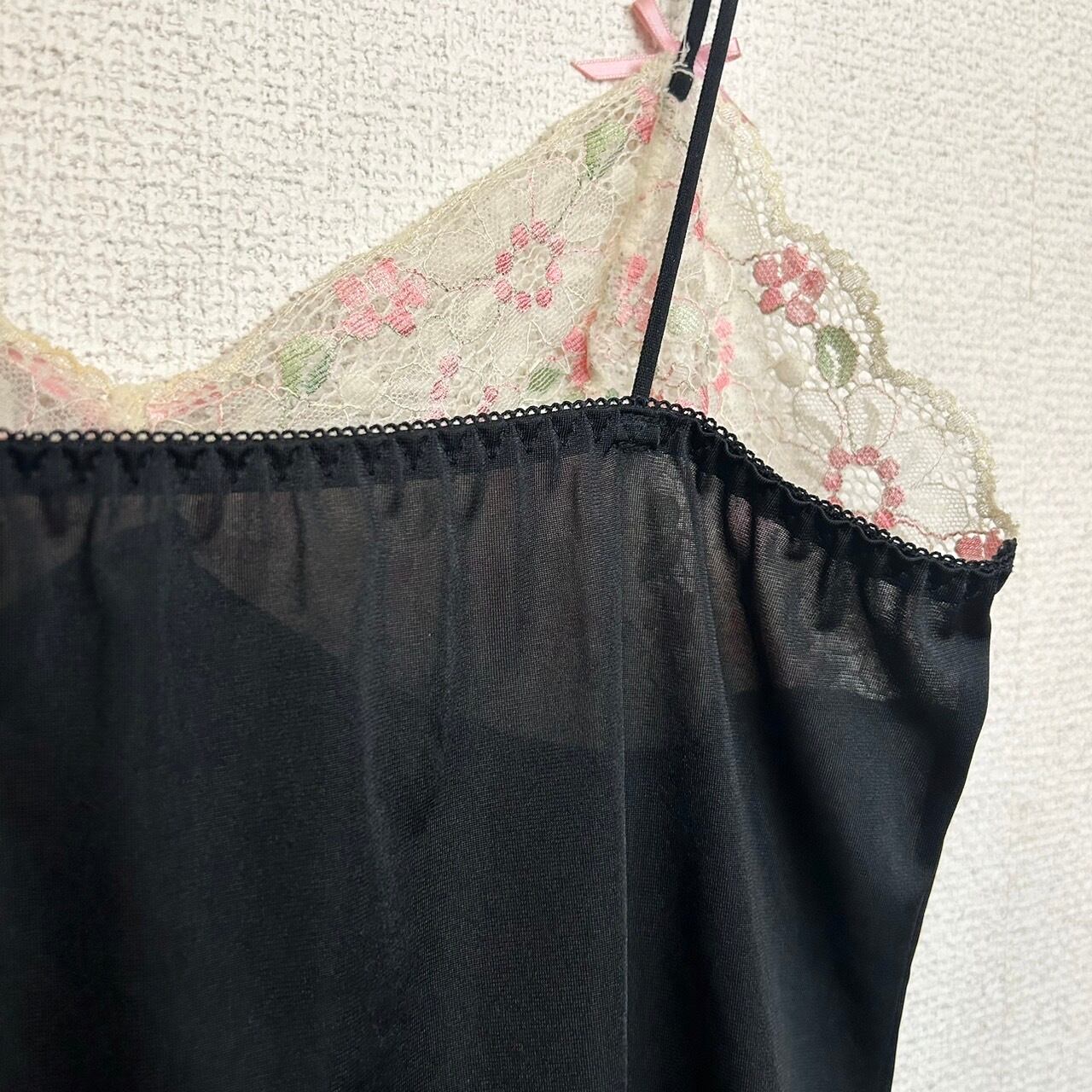 ブラックのランジェリーキャミソール。胸元はピンクのリボンと花刺繍のレースが施されていて、裾フリルのキャミソールです。レイヤードにオススメのアイテムです。