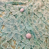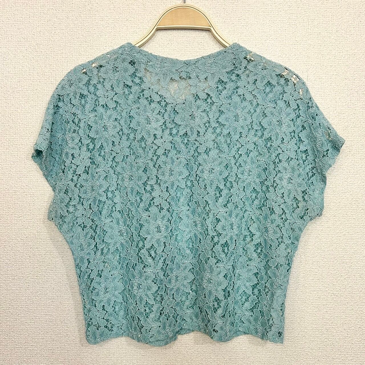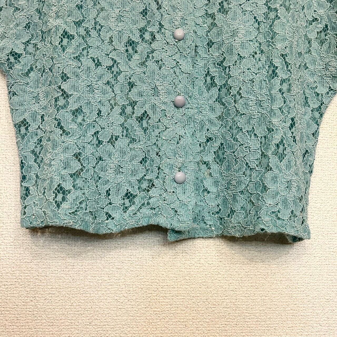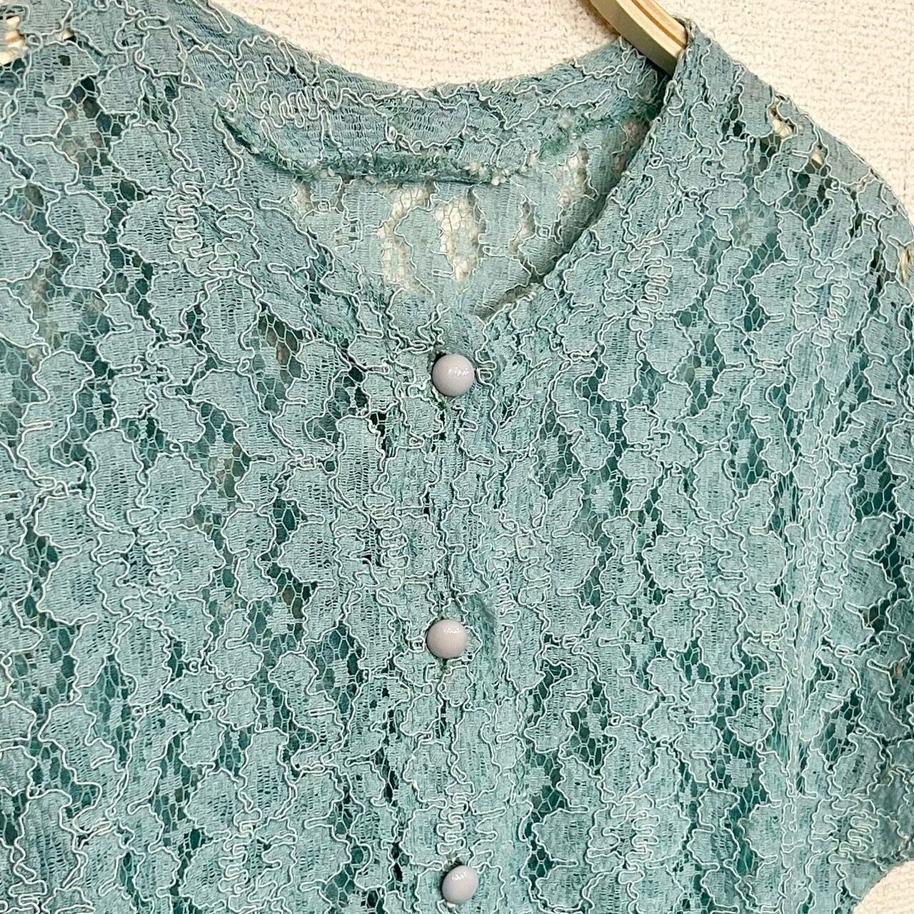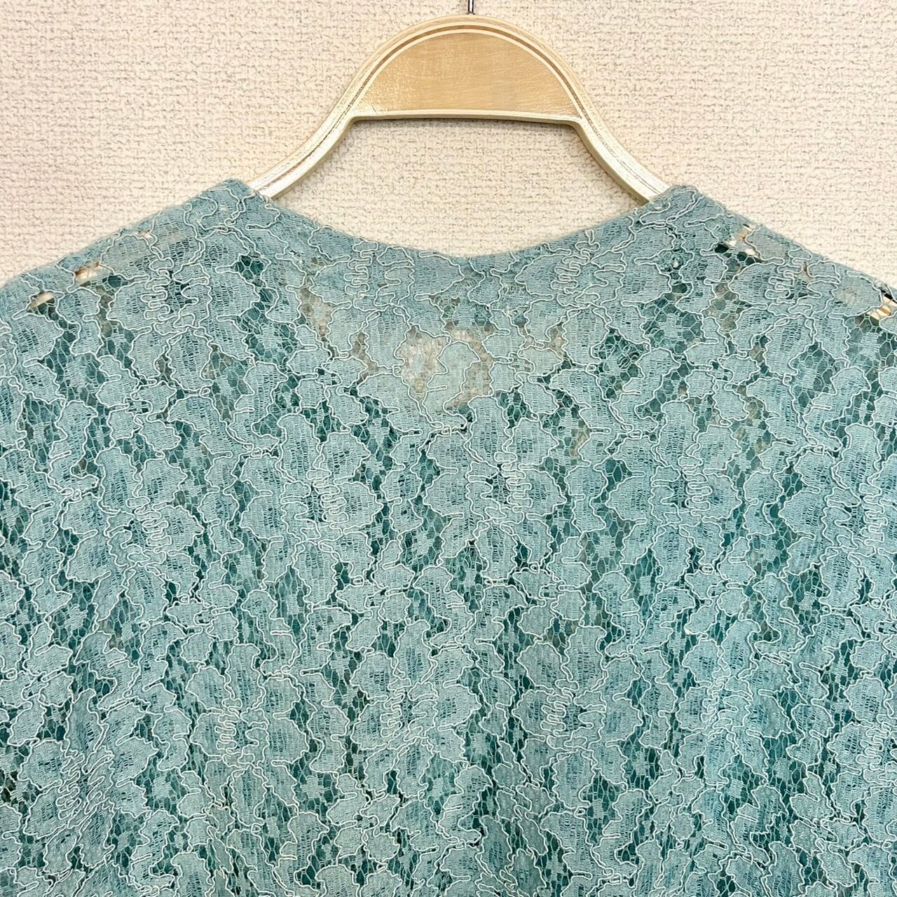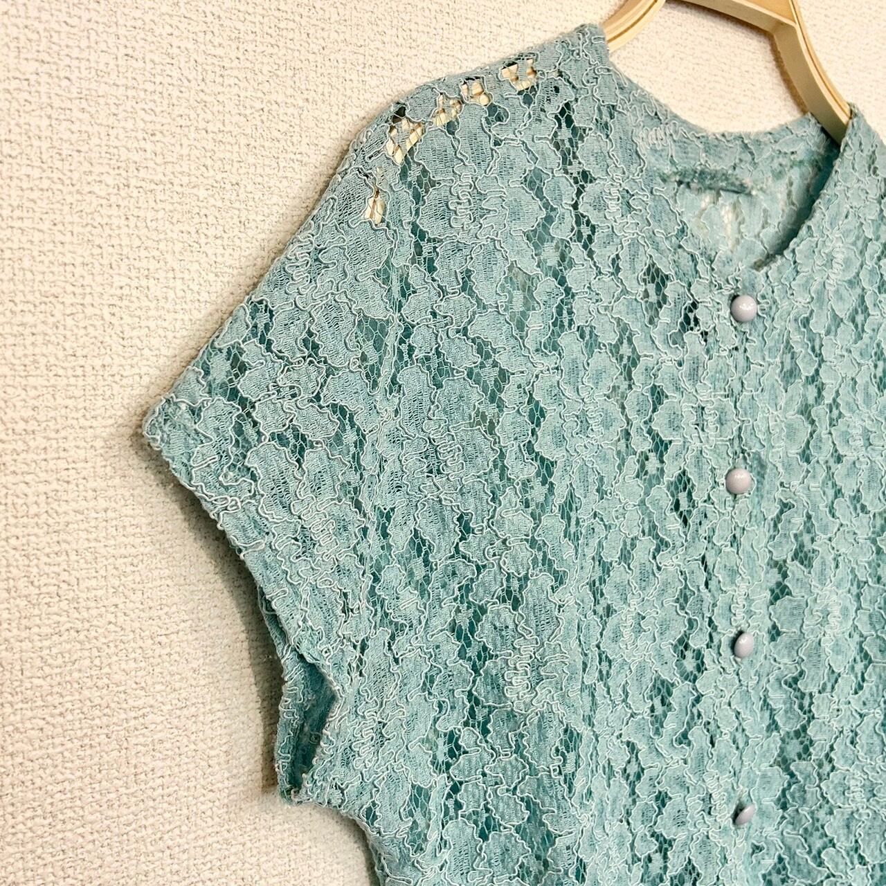 ミントグリーンカラーの花のような不思議な形の総レースのトップスです。