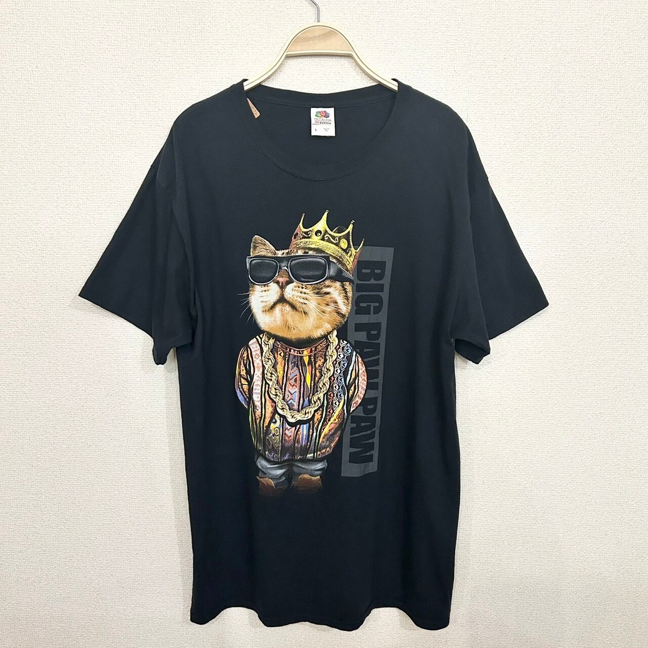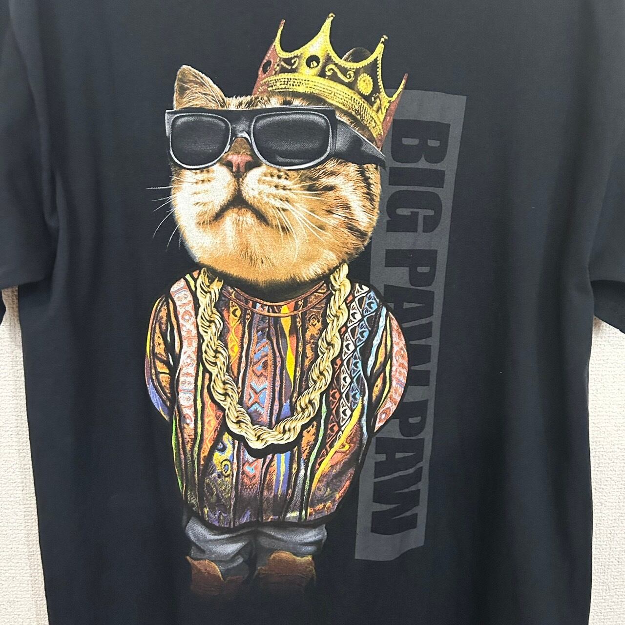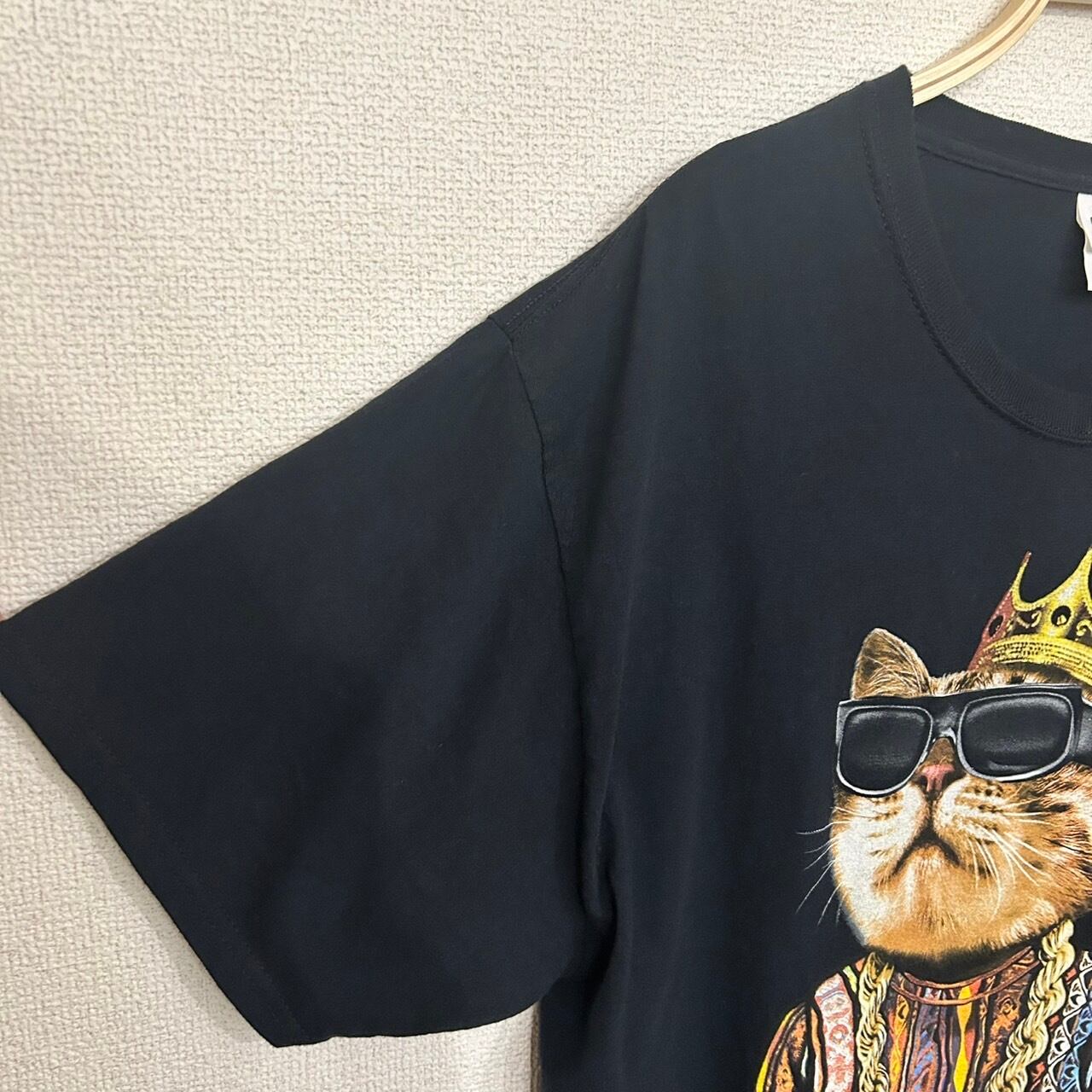 ヒップホップファッションに身を包んだ王冠をかぶった猫が大きくプリントされていてインパクトのあるパロディTシャツです。