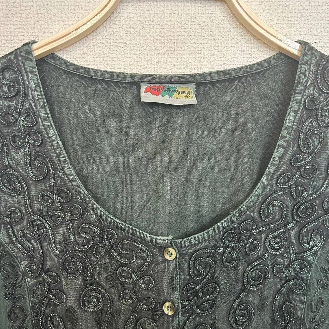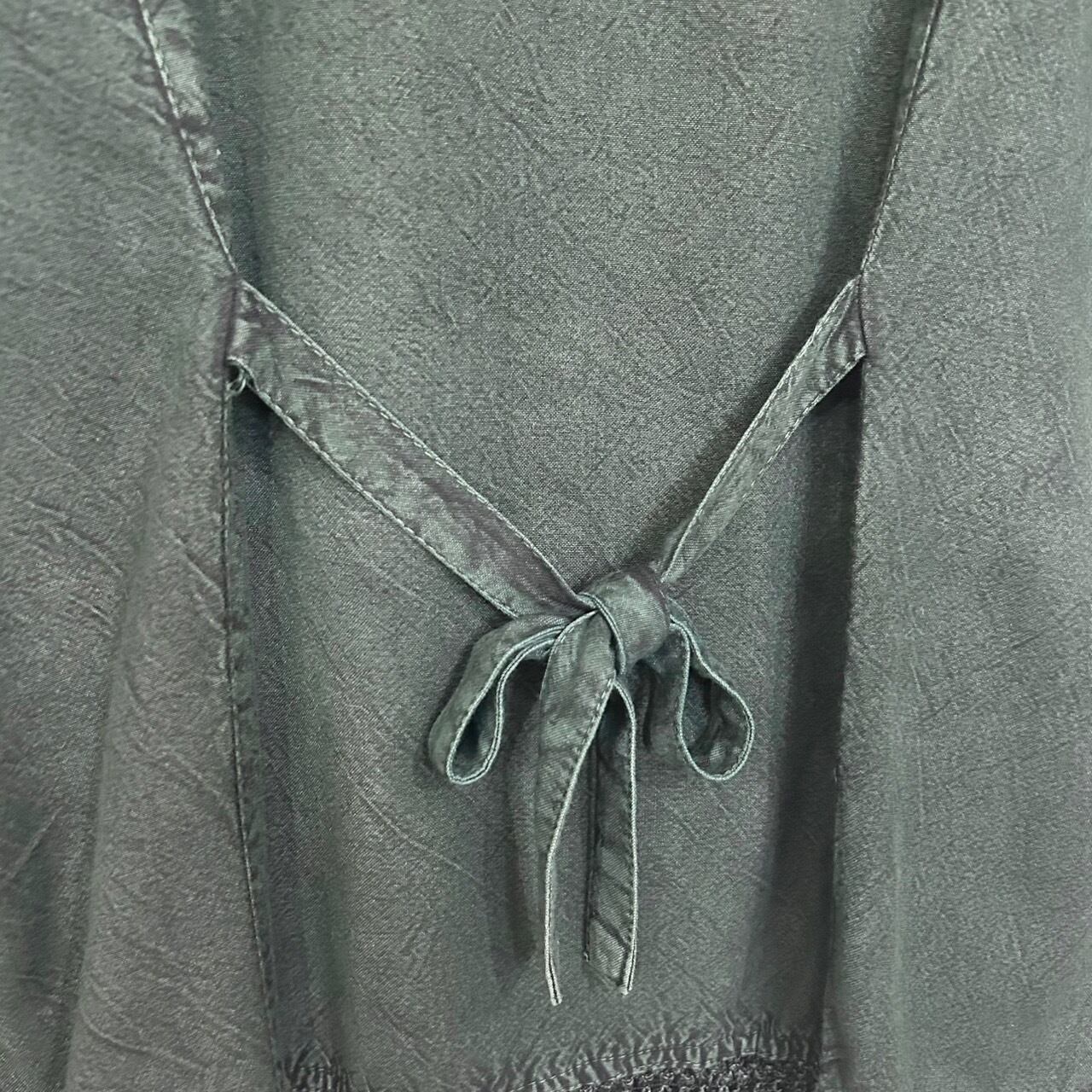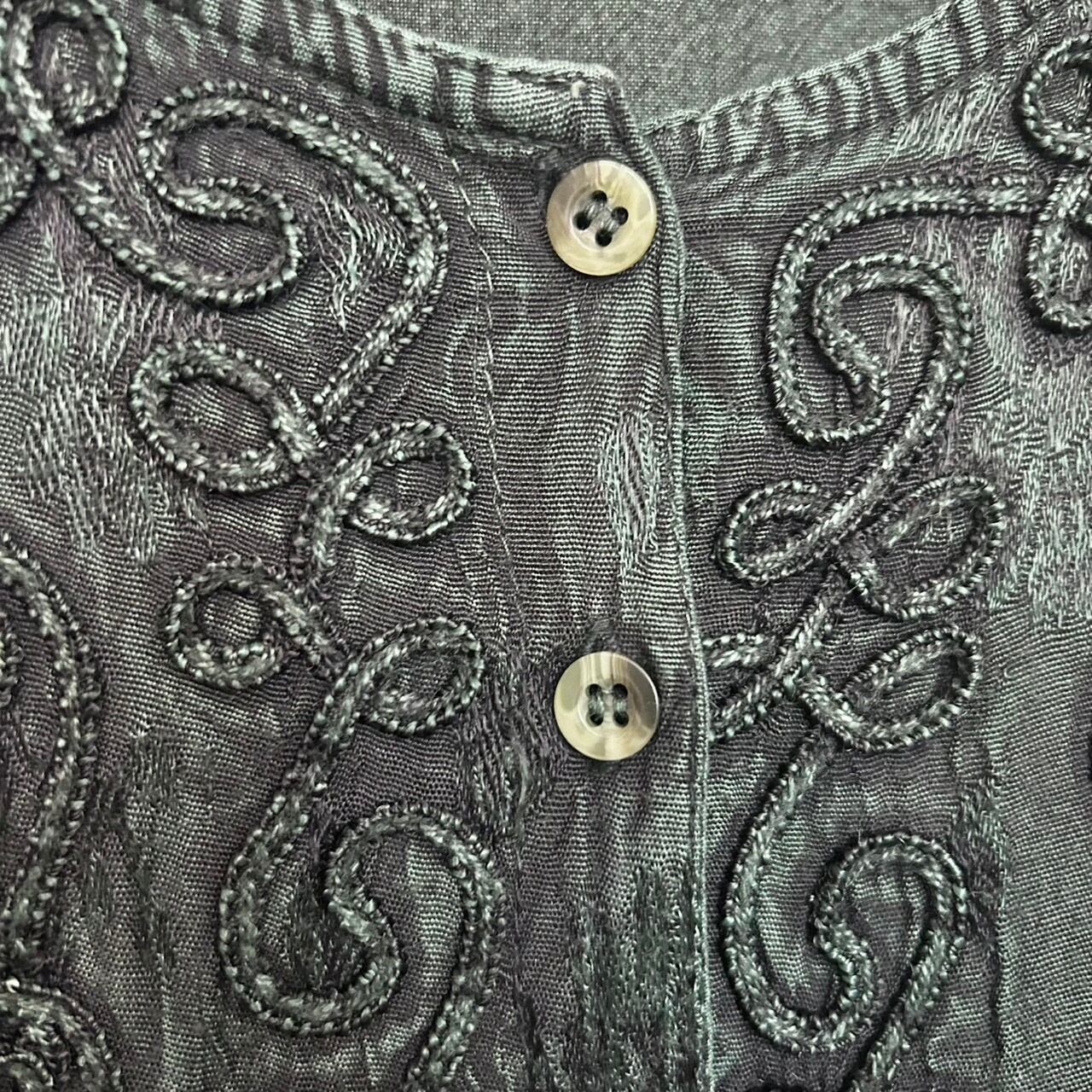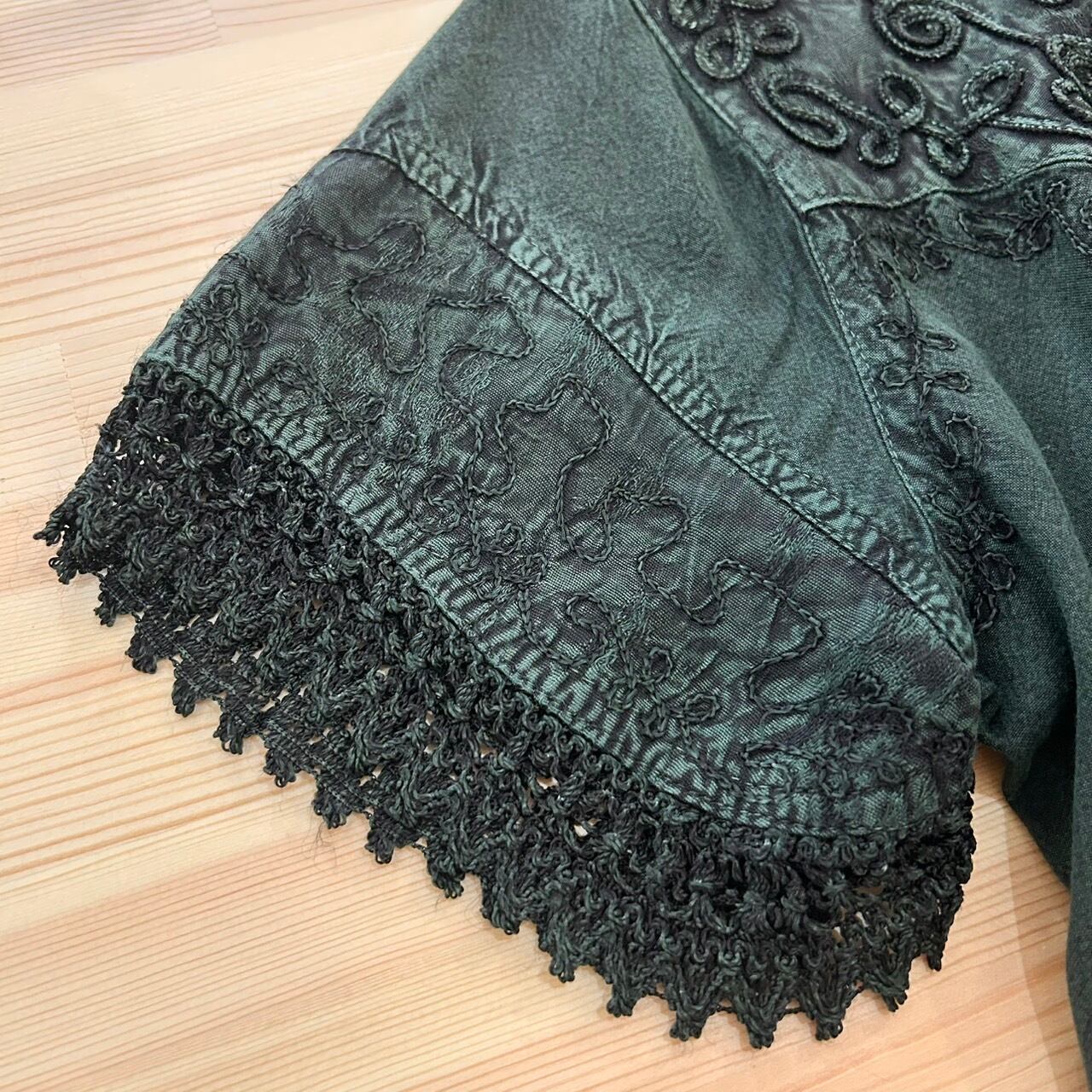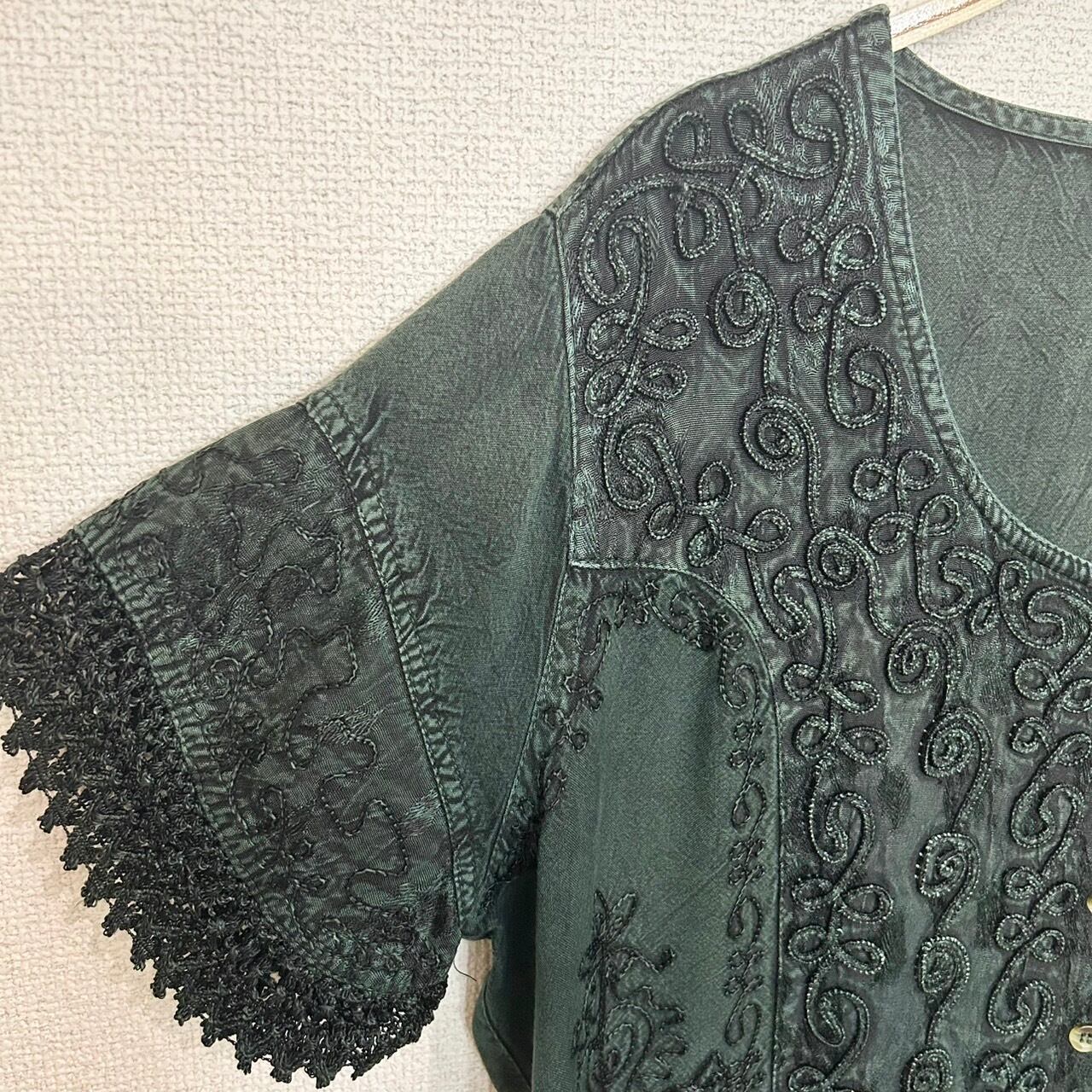深緑色のインド刺繍レーヨンシャツ。フロント全体に刺繍が施されていて、袖口や裾部分がレースのようになっている素敵なインド刺繍シャツです。1枚で着ても、ワンピースの上に着てもとても可愛い1着です。サイズもXLと大きめでゆったりと着ていただけます。