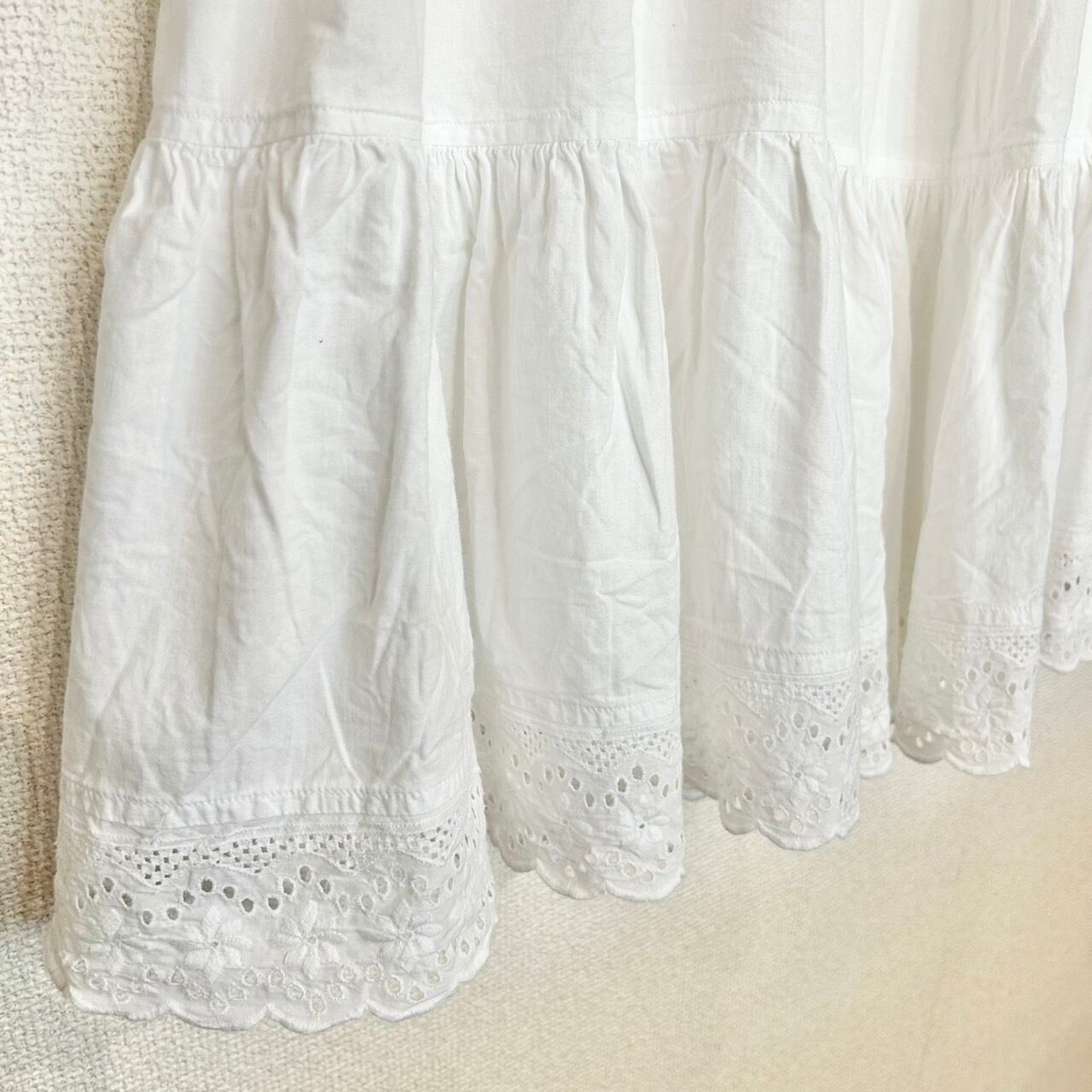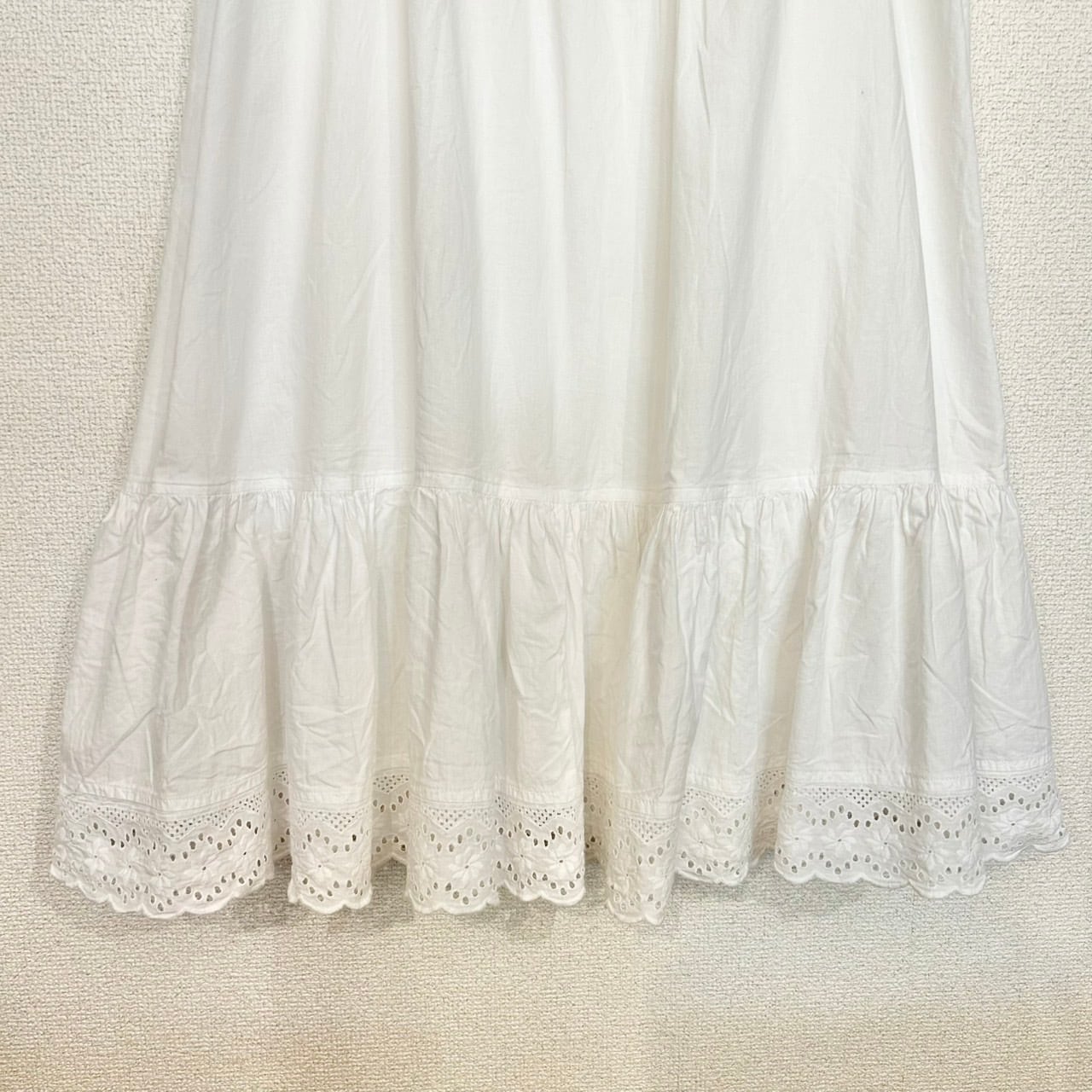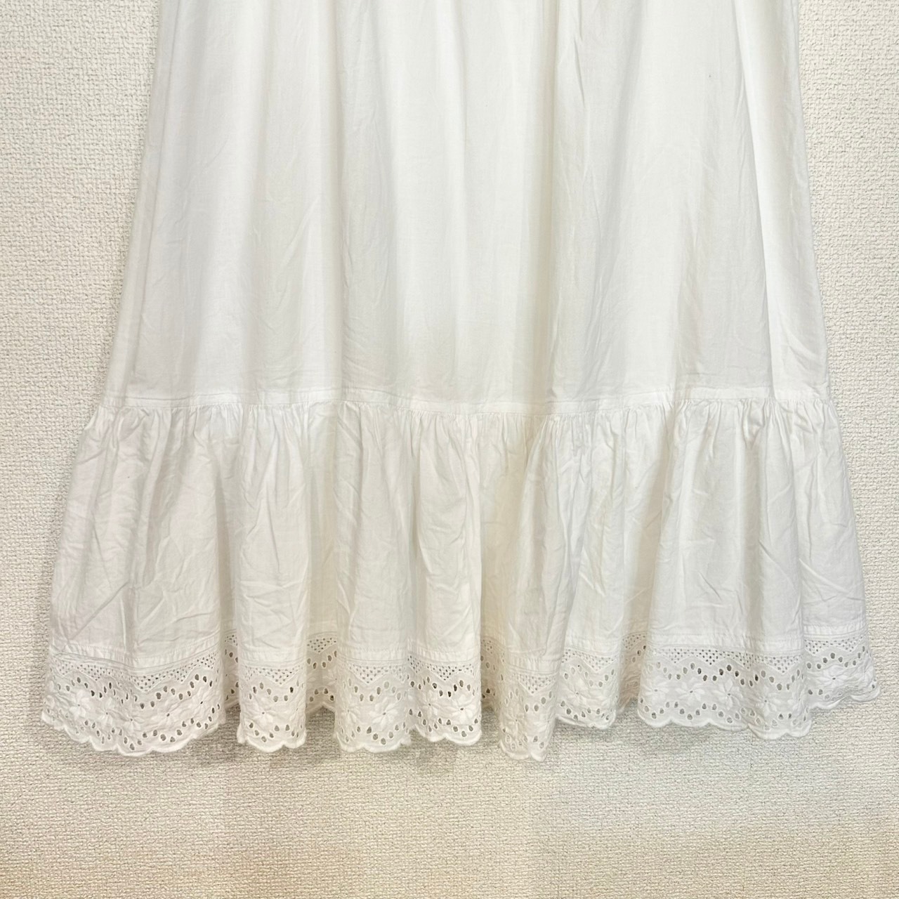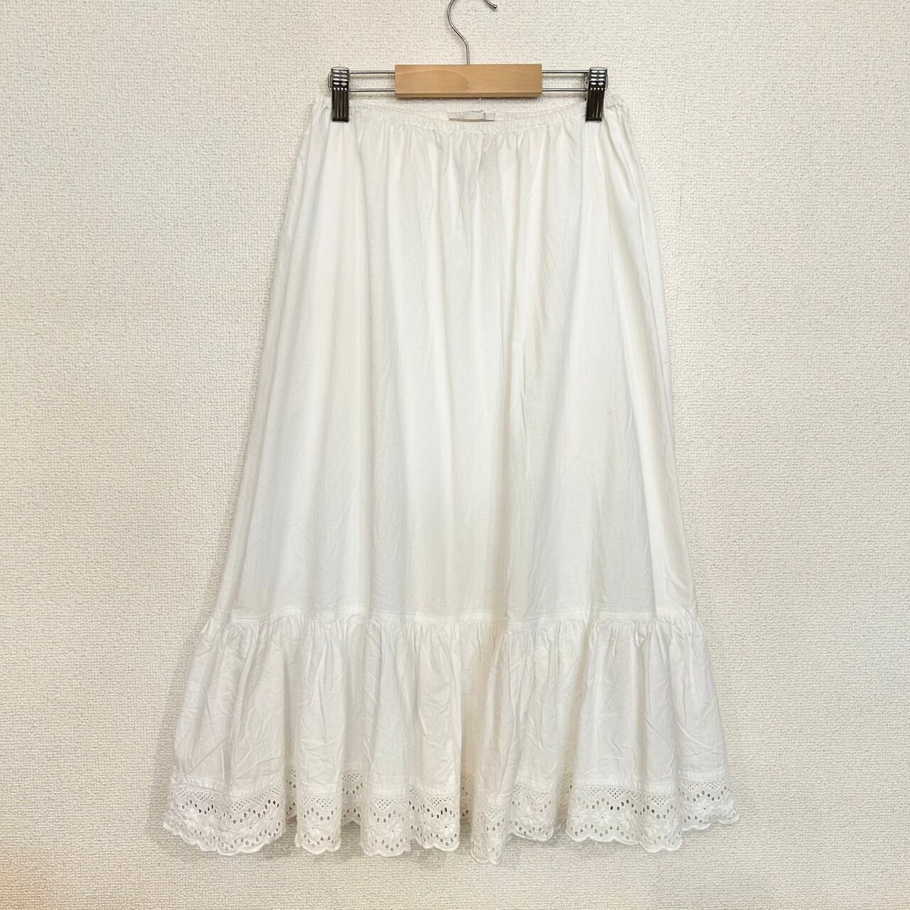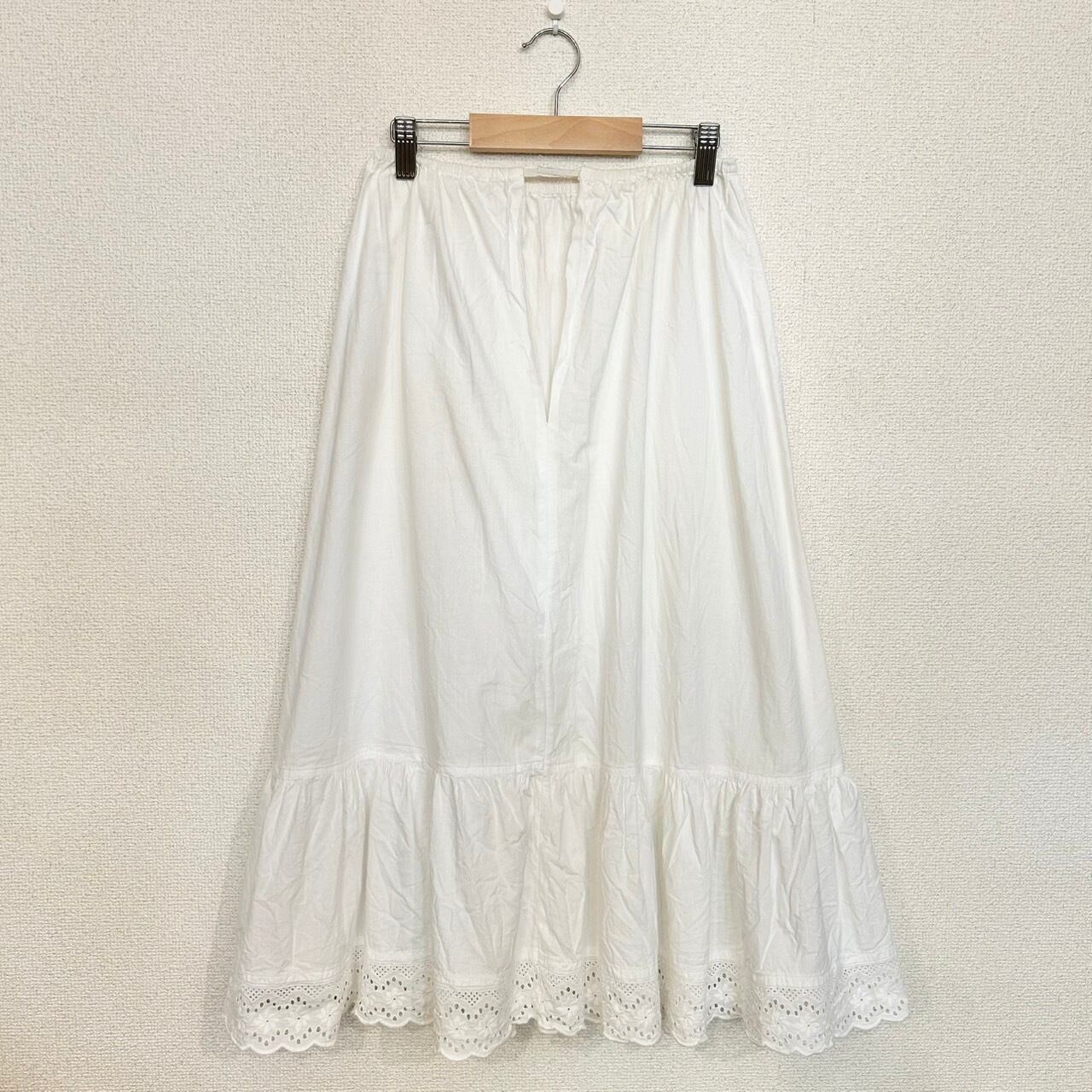 膝下丈の裾レースの白スカート。裾部分の大きめのレースが可愛いスカートです。インナーはなく、1枚では透けるのでレイヤードして履くのにおススメの1枚です。