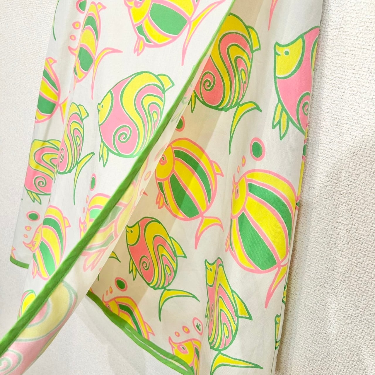 蛍光色の魚柄がレトロでとても可愛い巻きスカート。熱帯魚のような魚2匹の総柄がなかなかのインパクトあるスカートです。色々なコーディネートが楽しめそうなアイテムです。