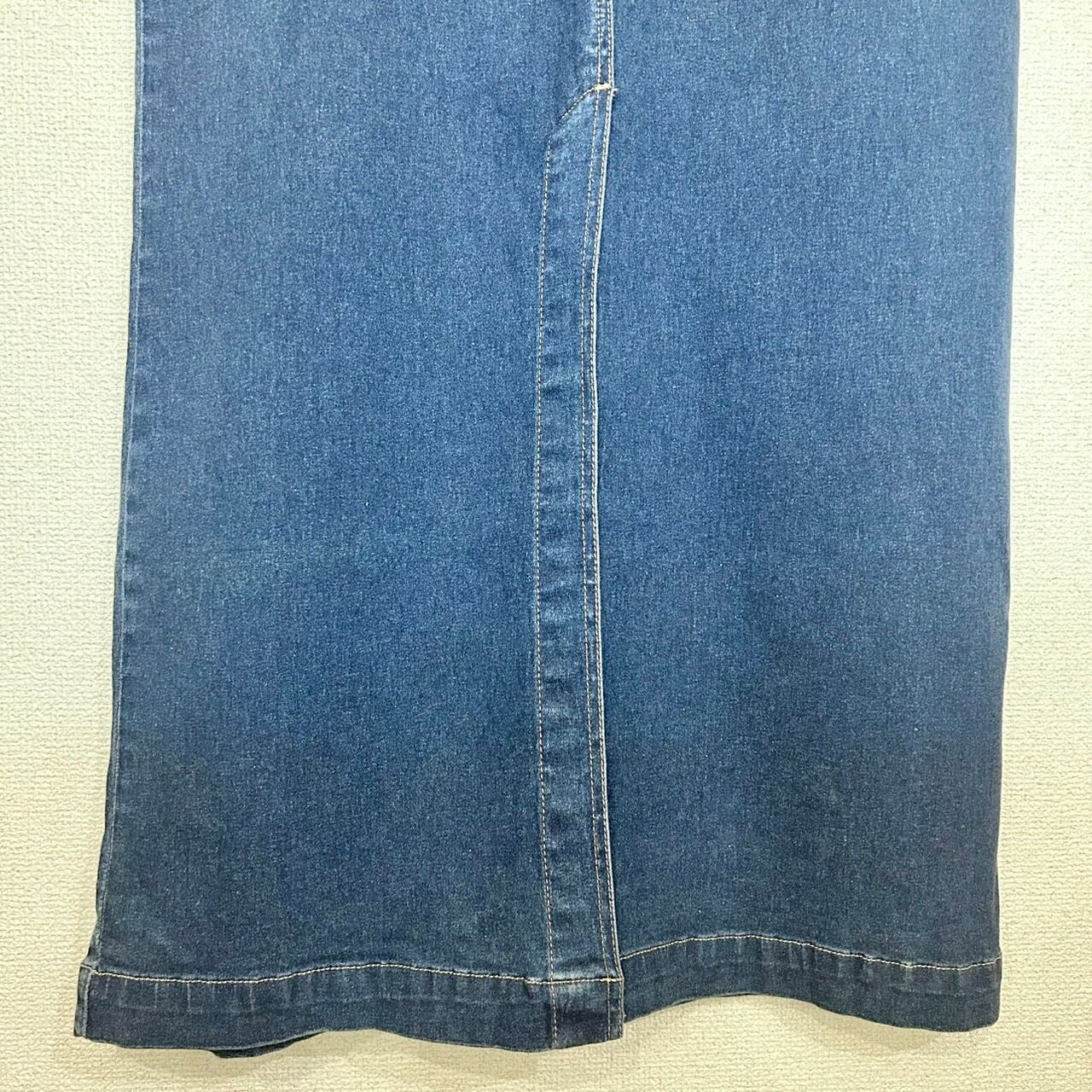 伸縮性のあるタイトめなデニムロングスカートです。フロントにポケットが2つ付いていて、ボタンで留めるタイプのスカートです。ベルトホールはなし。裾部分は前後にスリットが入っていて、動きやすく形が綺麗な1枚です。