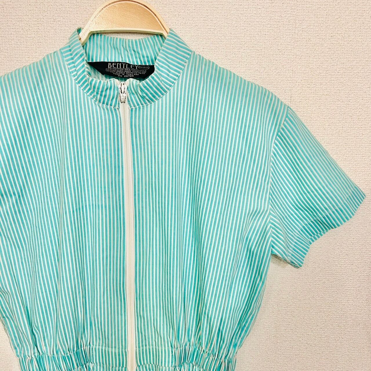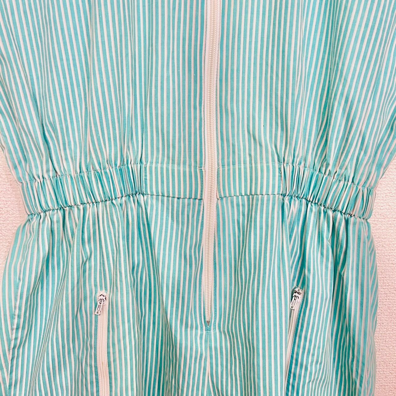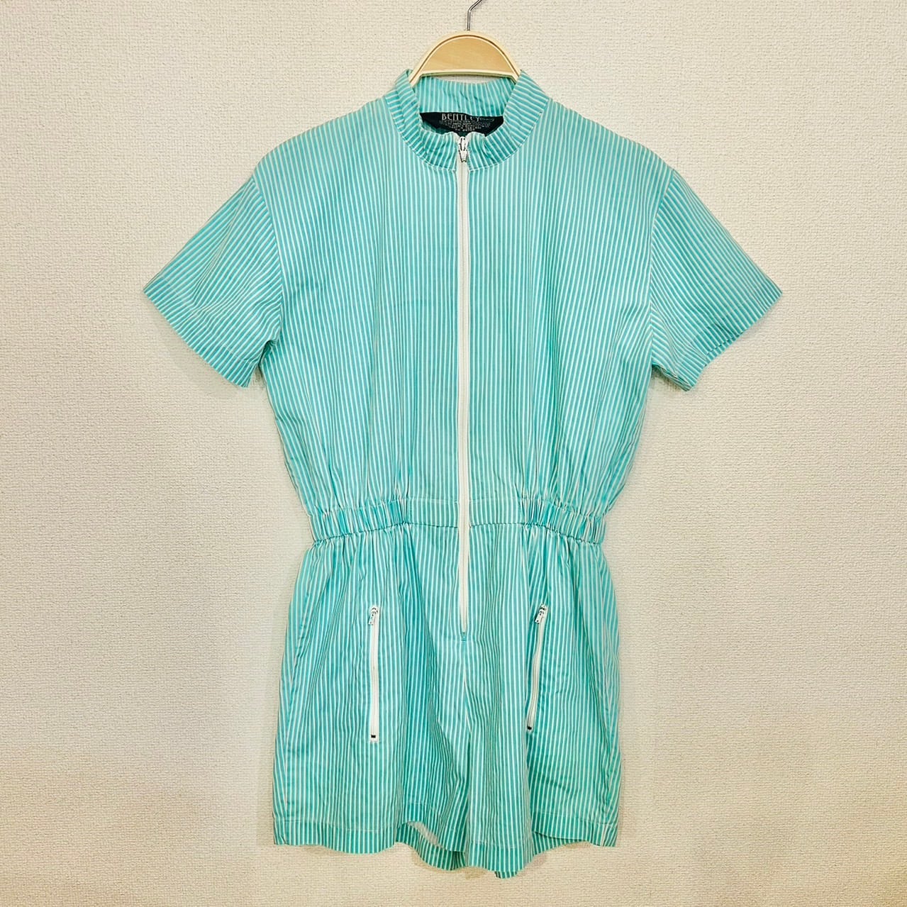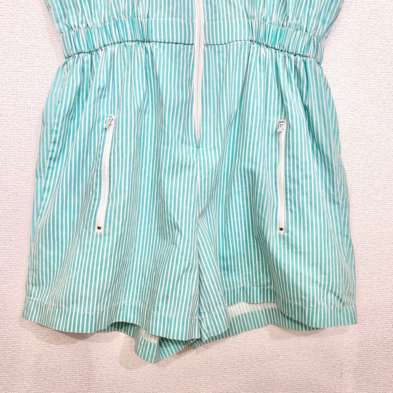 海外映画に出てくる女の子が着ていそうな、POPで鮮やかなミントグリーンのストライプがとても可愛いロンパースです。フロント部分にジップがついていて着脱もしやすく、ポケットもあるので機能性も良い1枚です。