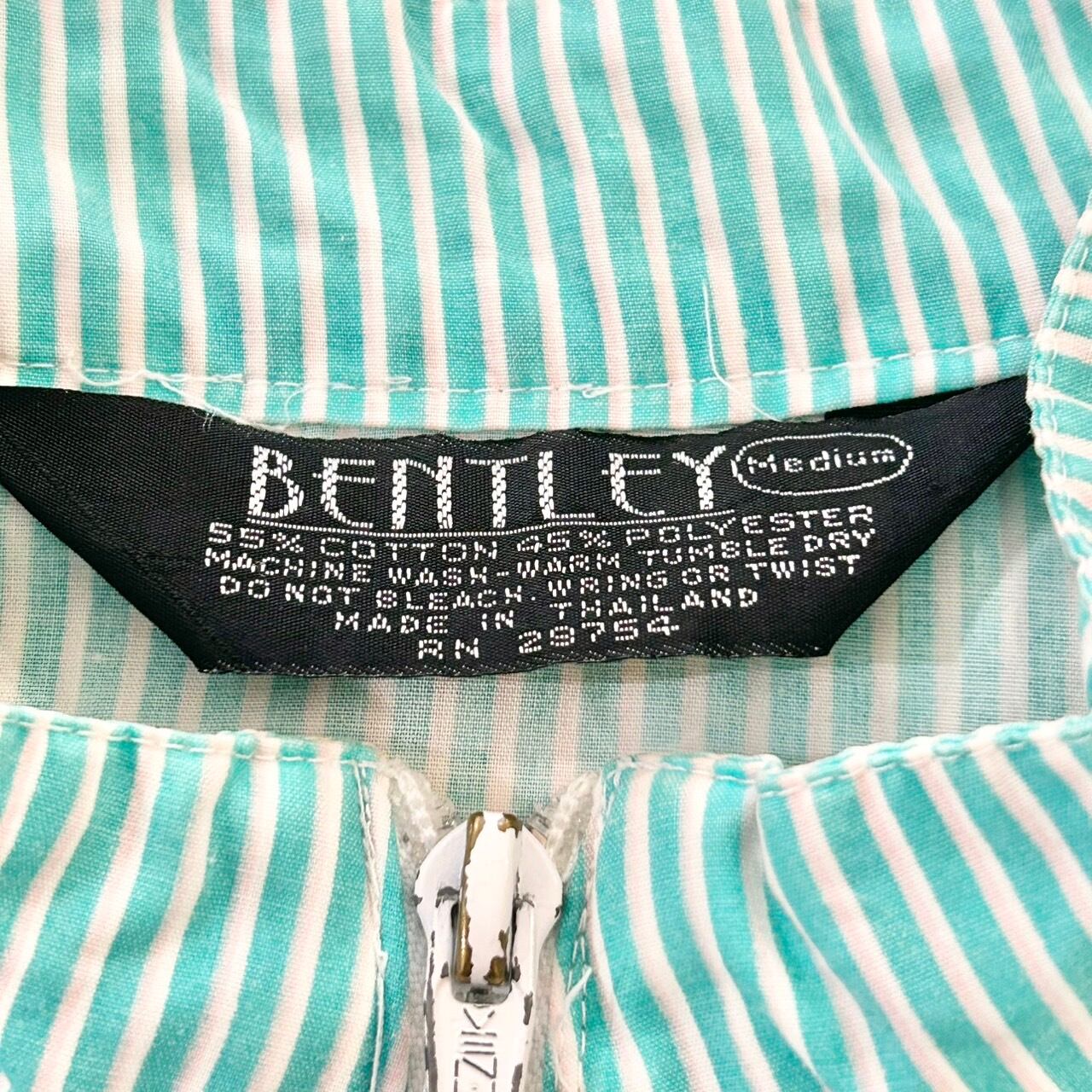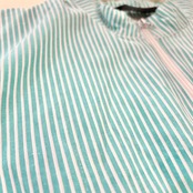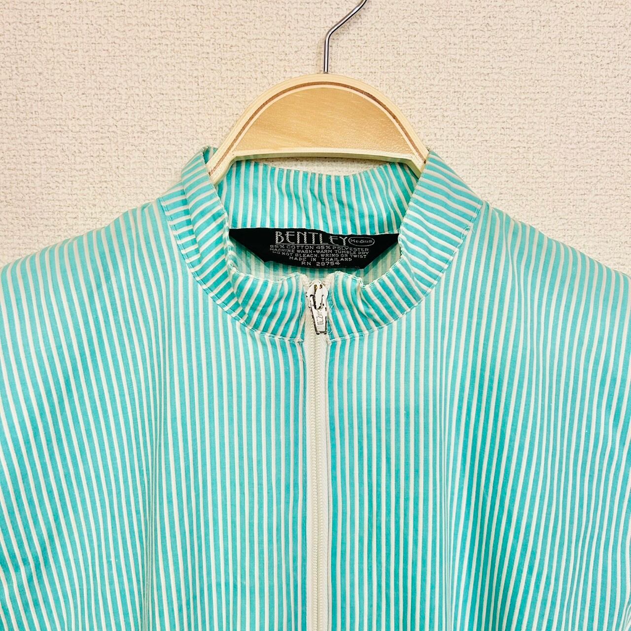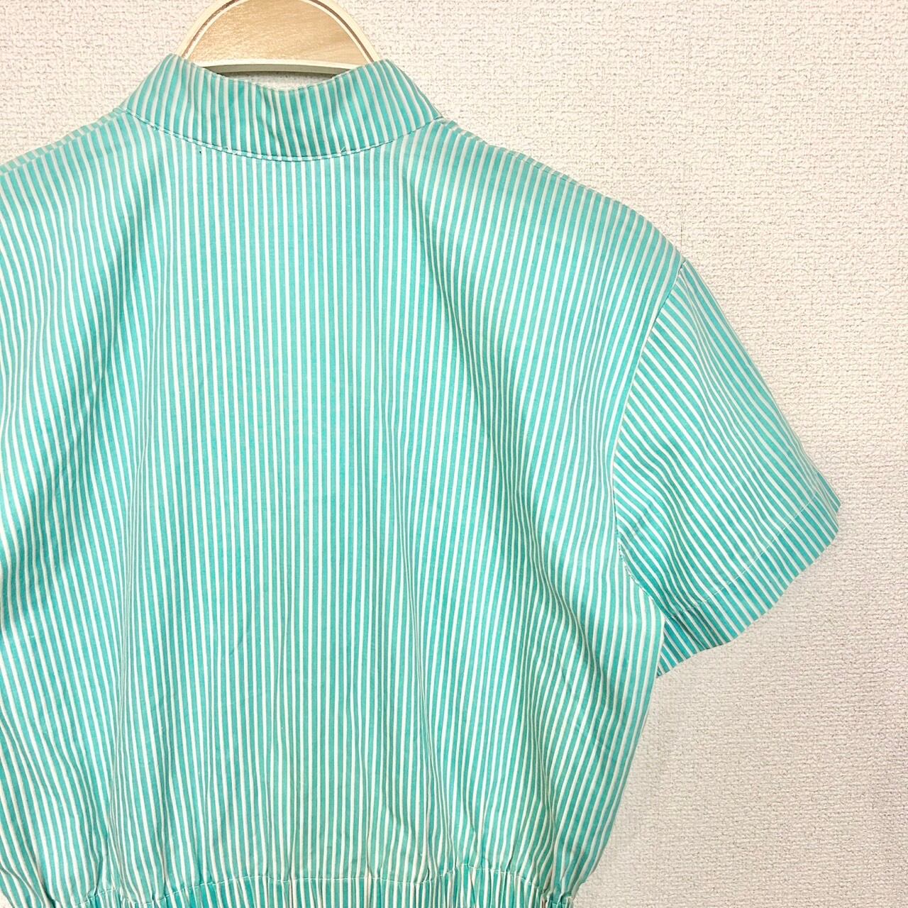 海外映画に出てくる女の子が着ていそうな、POPで鮮やかなミントグリーンのストライプがとても可愛いロンパースです。フロント部分にジップがついていて着脱もしやすく、ポケットもあるので機能性も良い1枚です。