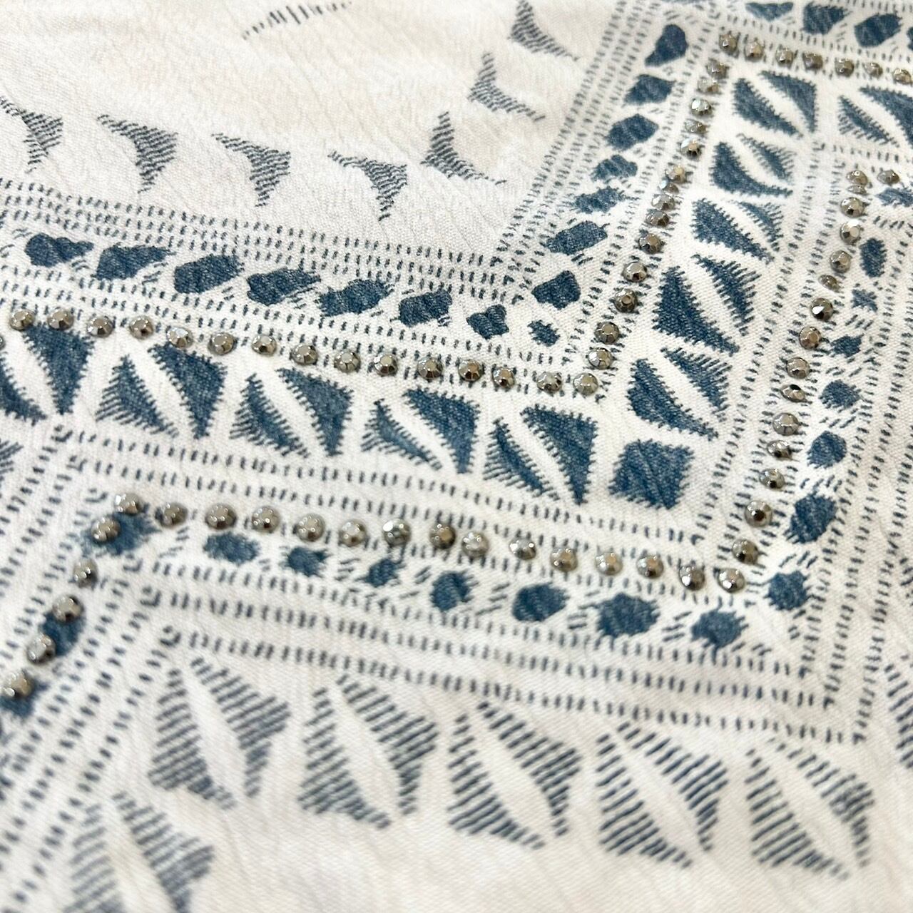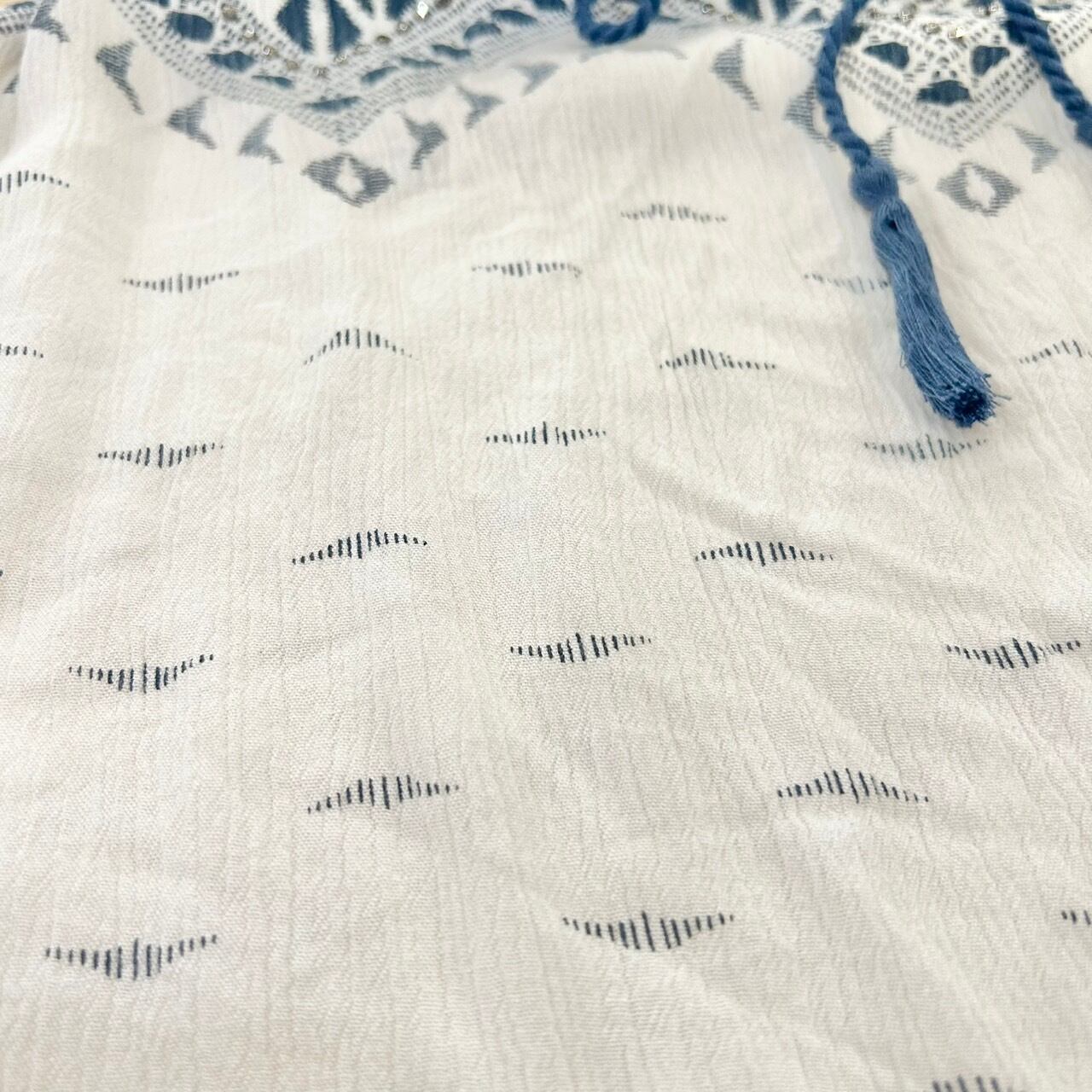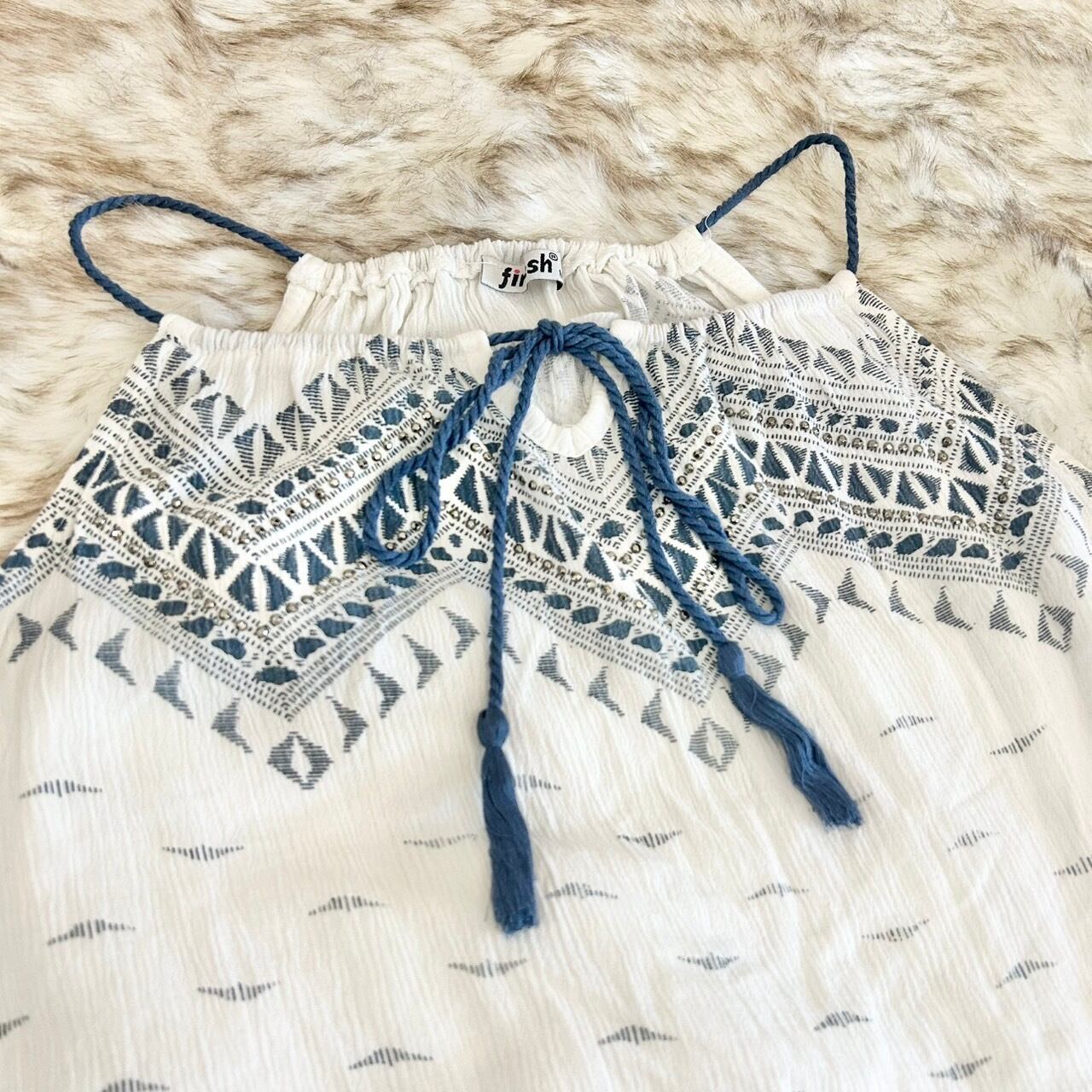 くすみブルーの紐と柄が可愛いノースリーブトップス。前身頃にはラインストーンが施されていて、デザイン性のあるトップスになっています。タンクトップの上などにレイヤードしても可愛いですし、中にチューブをきて1枚で着ても素敵です。