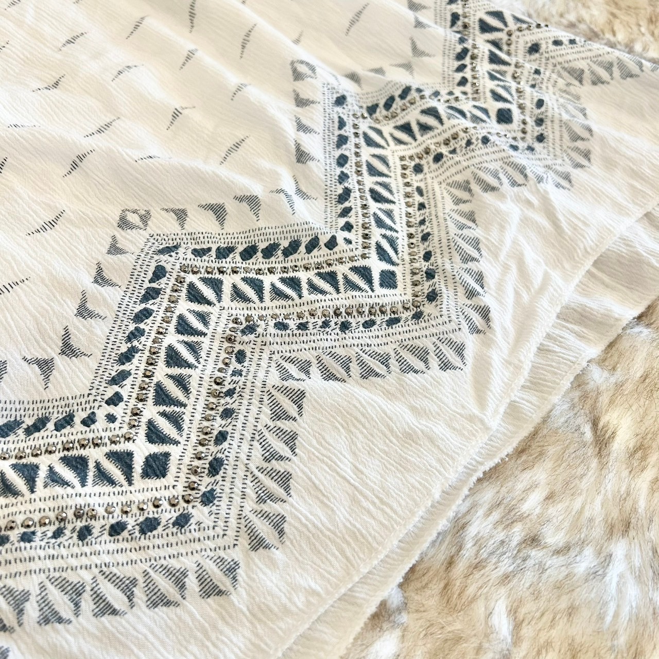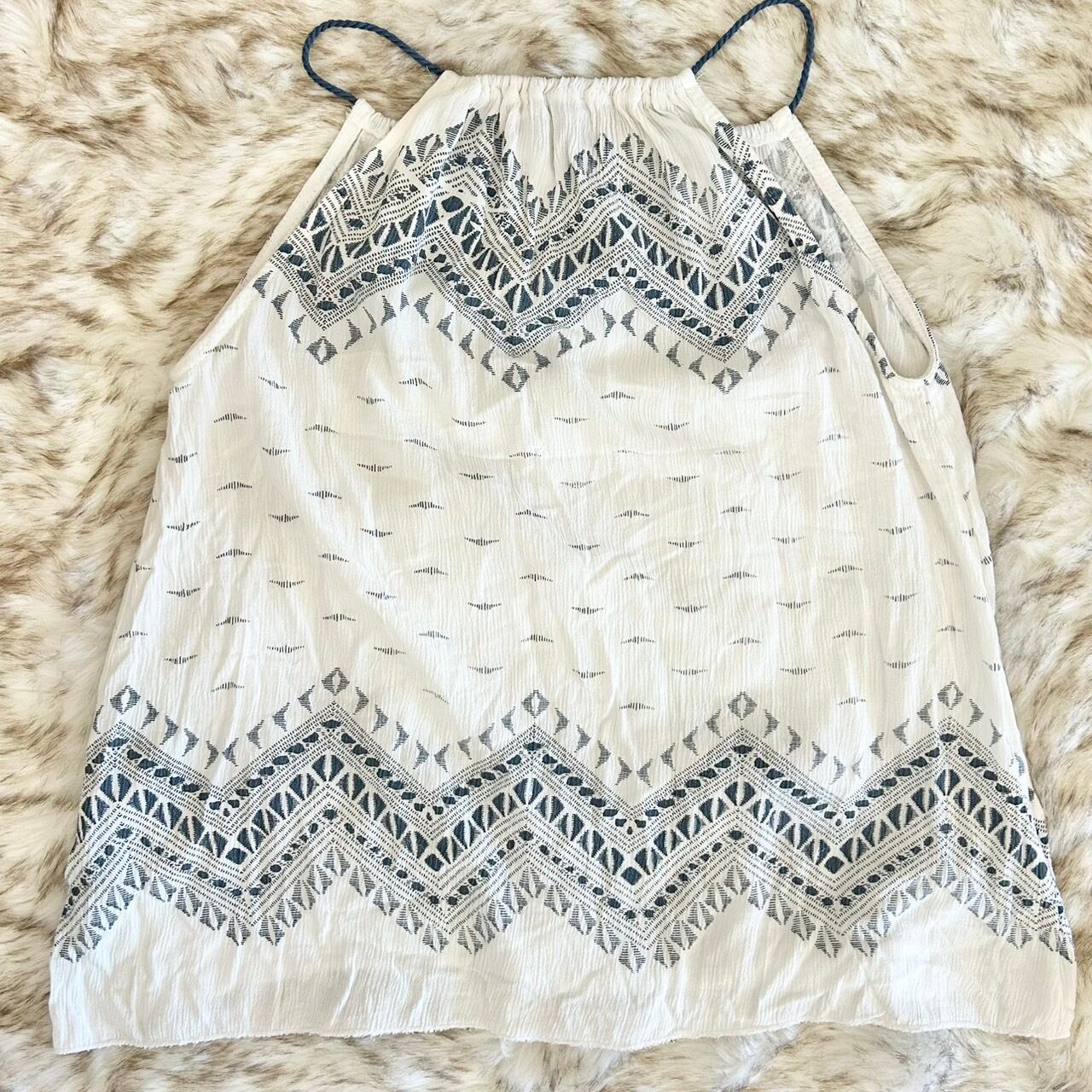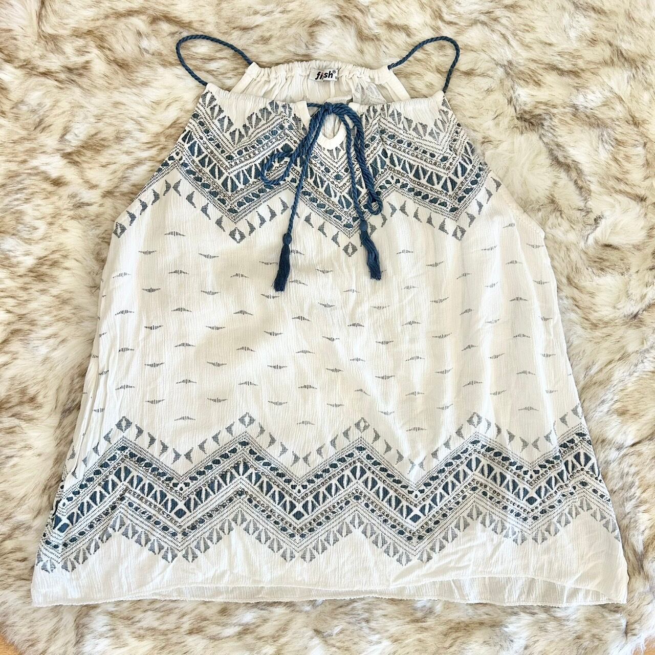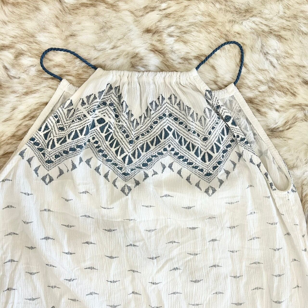 くすみブルーの紐と柄が可愛いノースリーブトップス。前身頃にはラインストーンが施されていて、デザイン性のあるトップスになっています。タンクトップの上などにレイヤードしても可愛いですし、中にチューブをきて1枚で着ても素敵です。