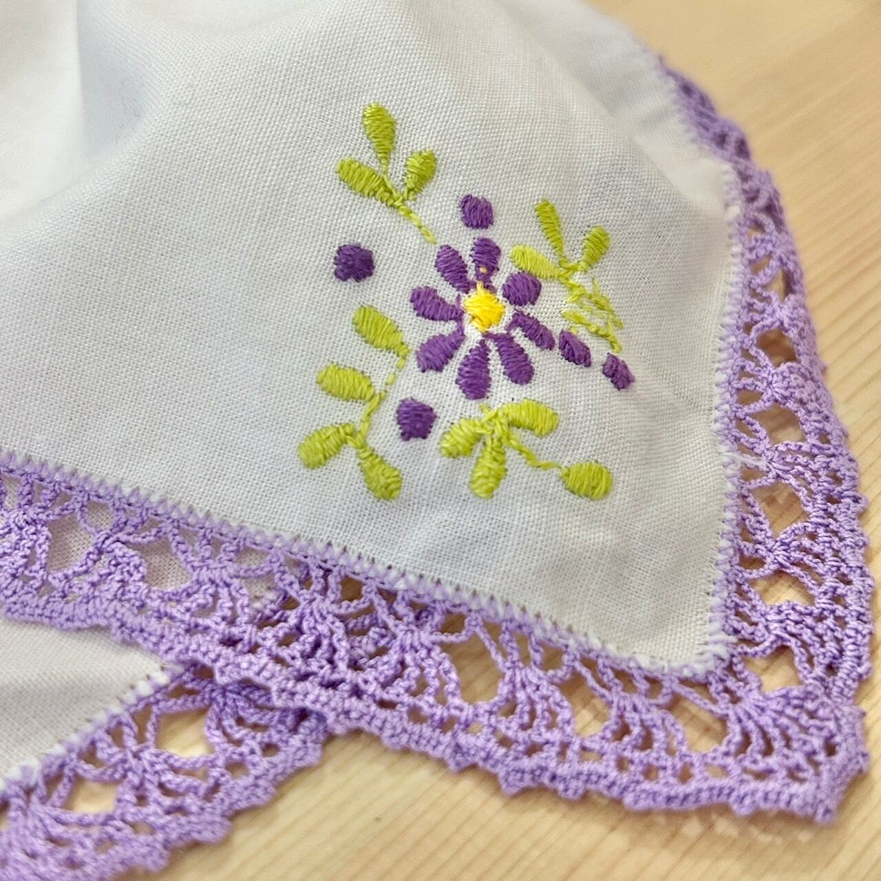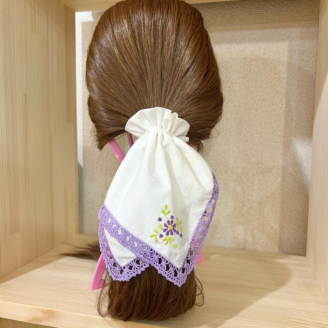 当店オリジナル、ヴィンテージドイリーをリメイクしたシュシュになります。刺繍入りのハンカチを1枚使用したシンプルなタイプです。
