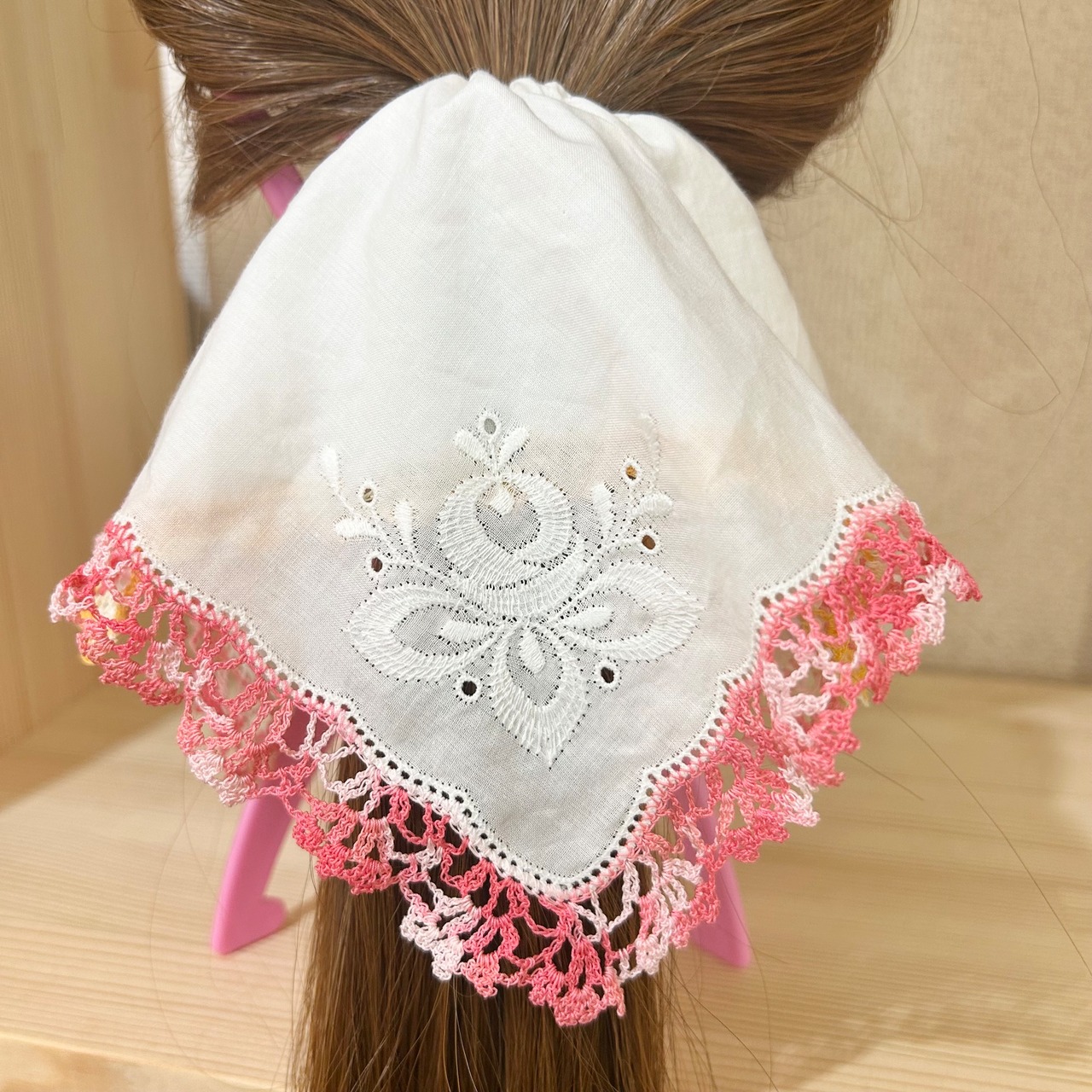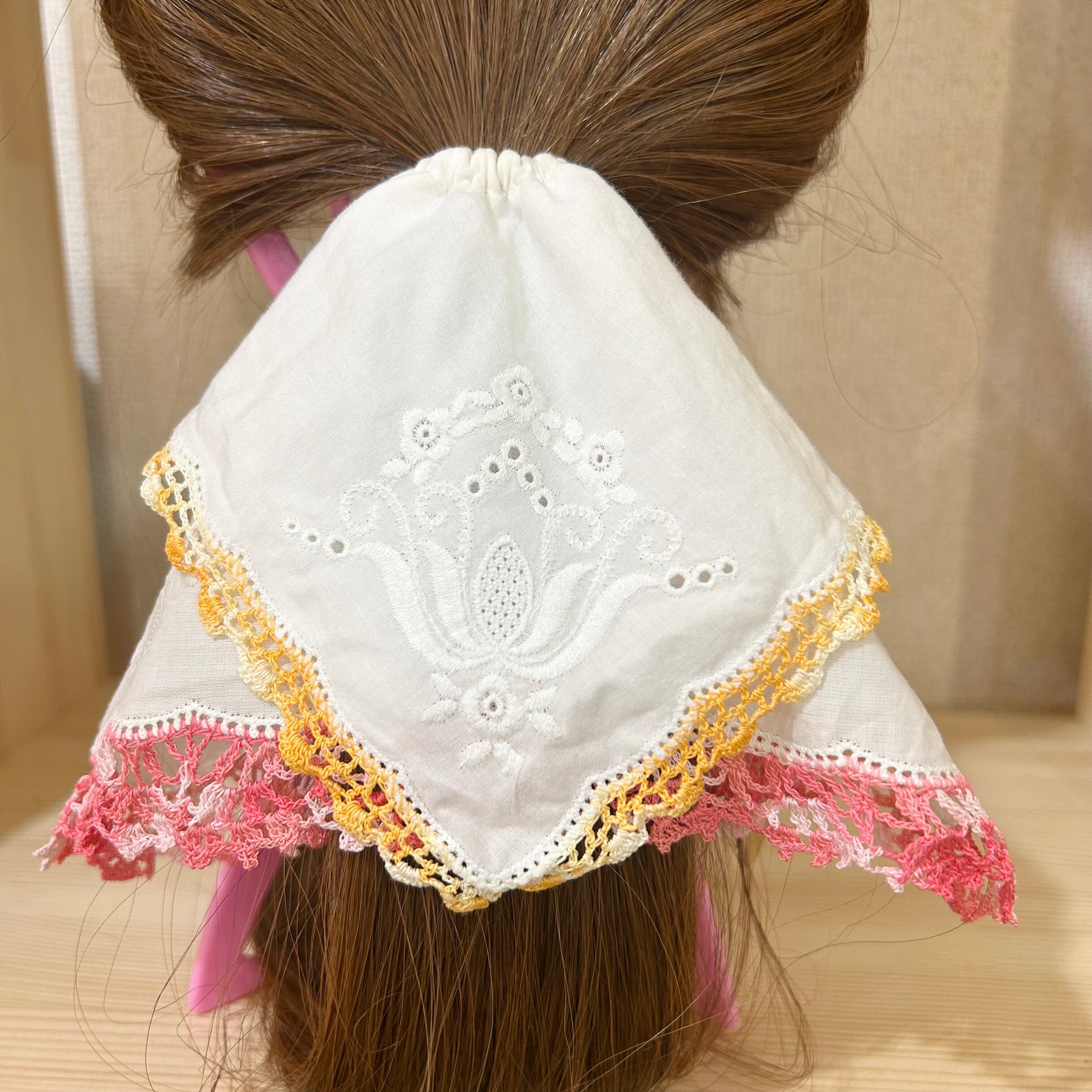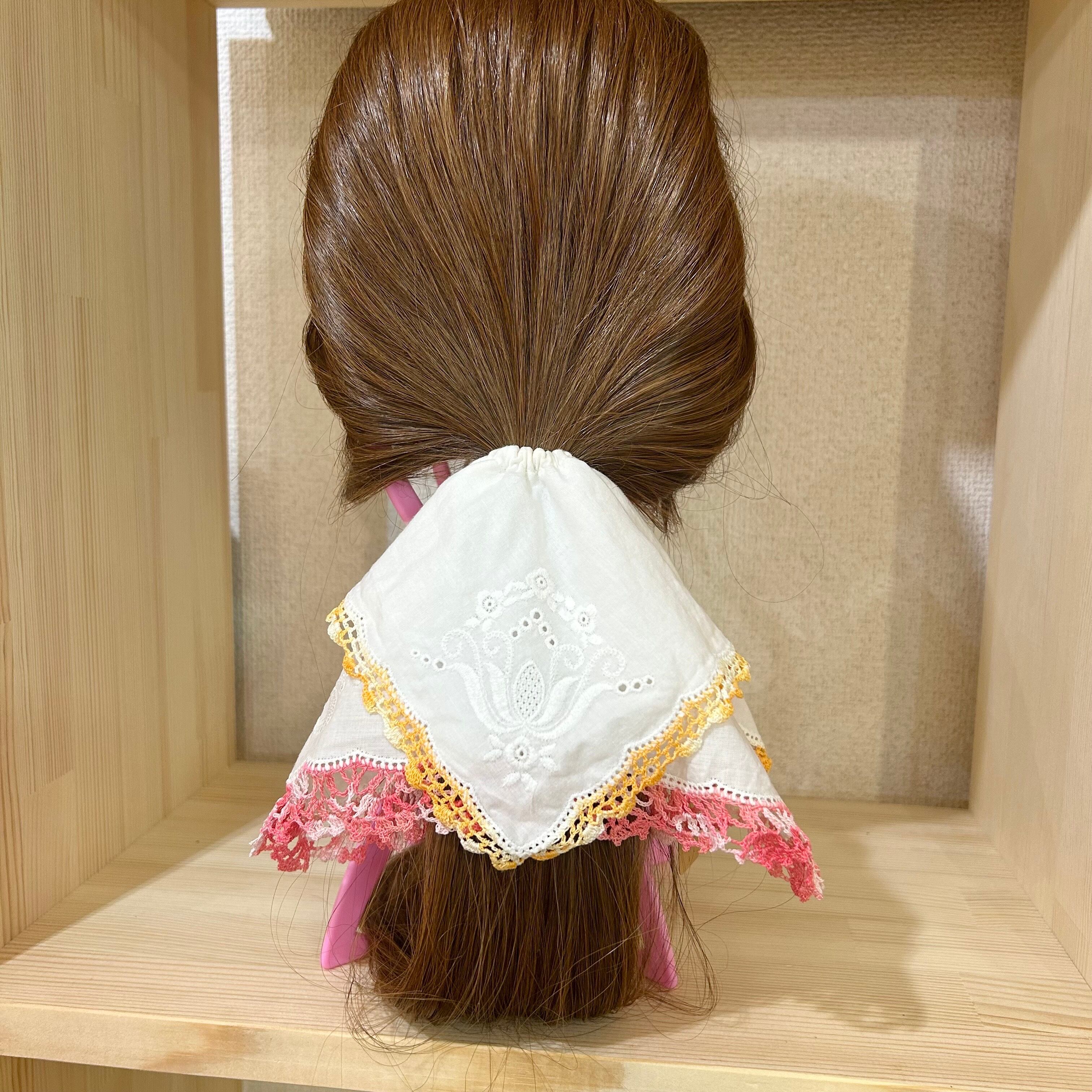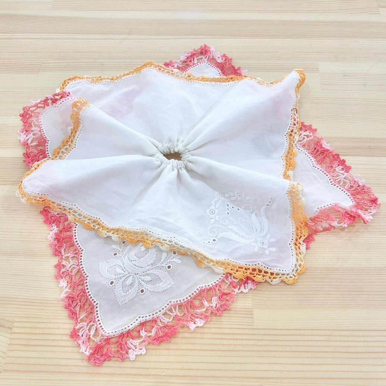 当店オリジナル、ヴィンテージドイリーをリメイクしたシュシュになります。刺繍入りハンカチを2枚重ねてあり、ひっくり返すことでリバーシブルで使用していただけます。その日の気分でお使いください♡