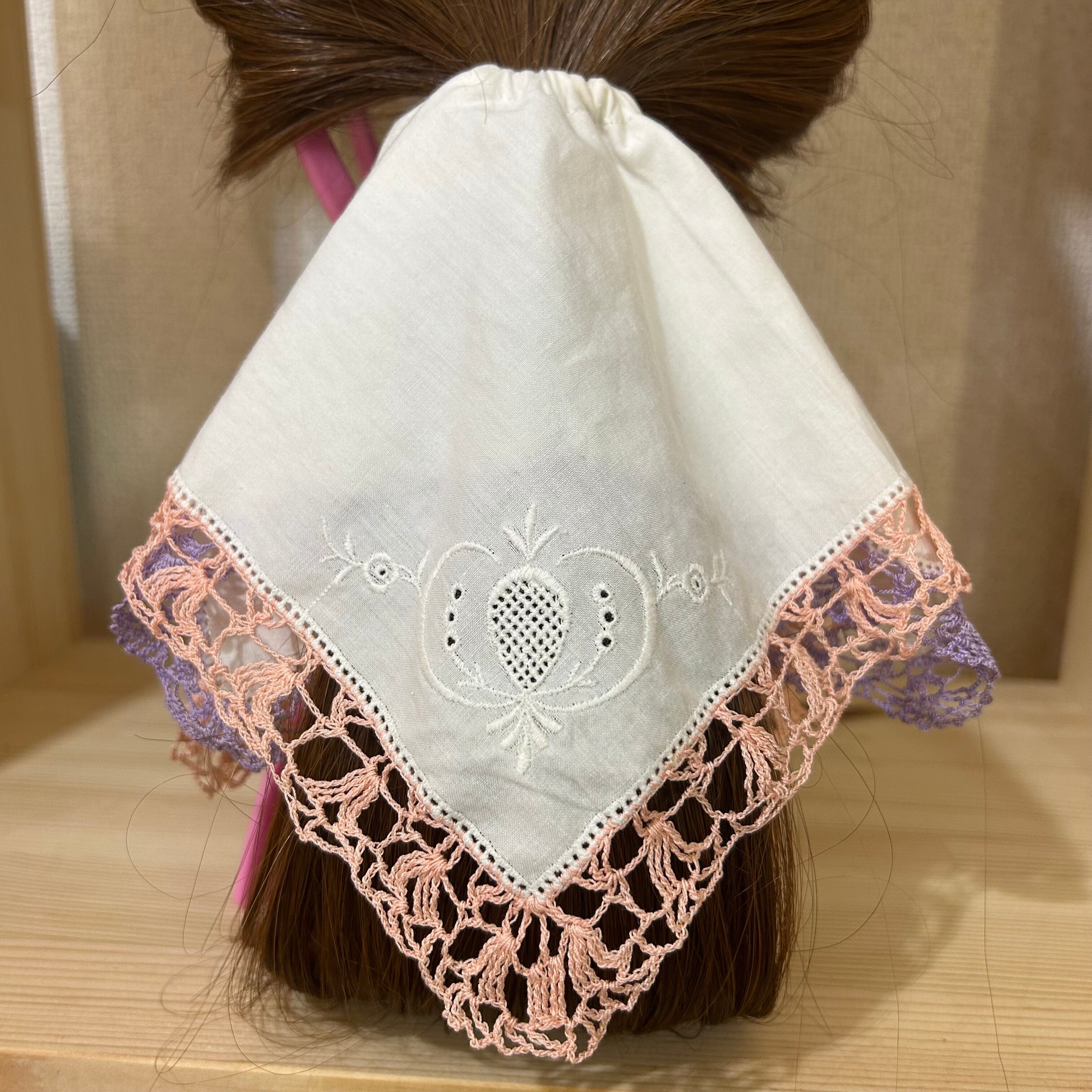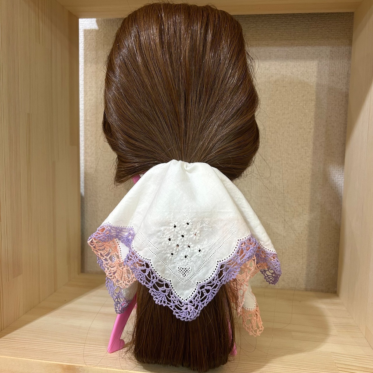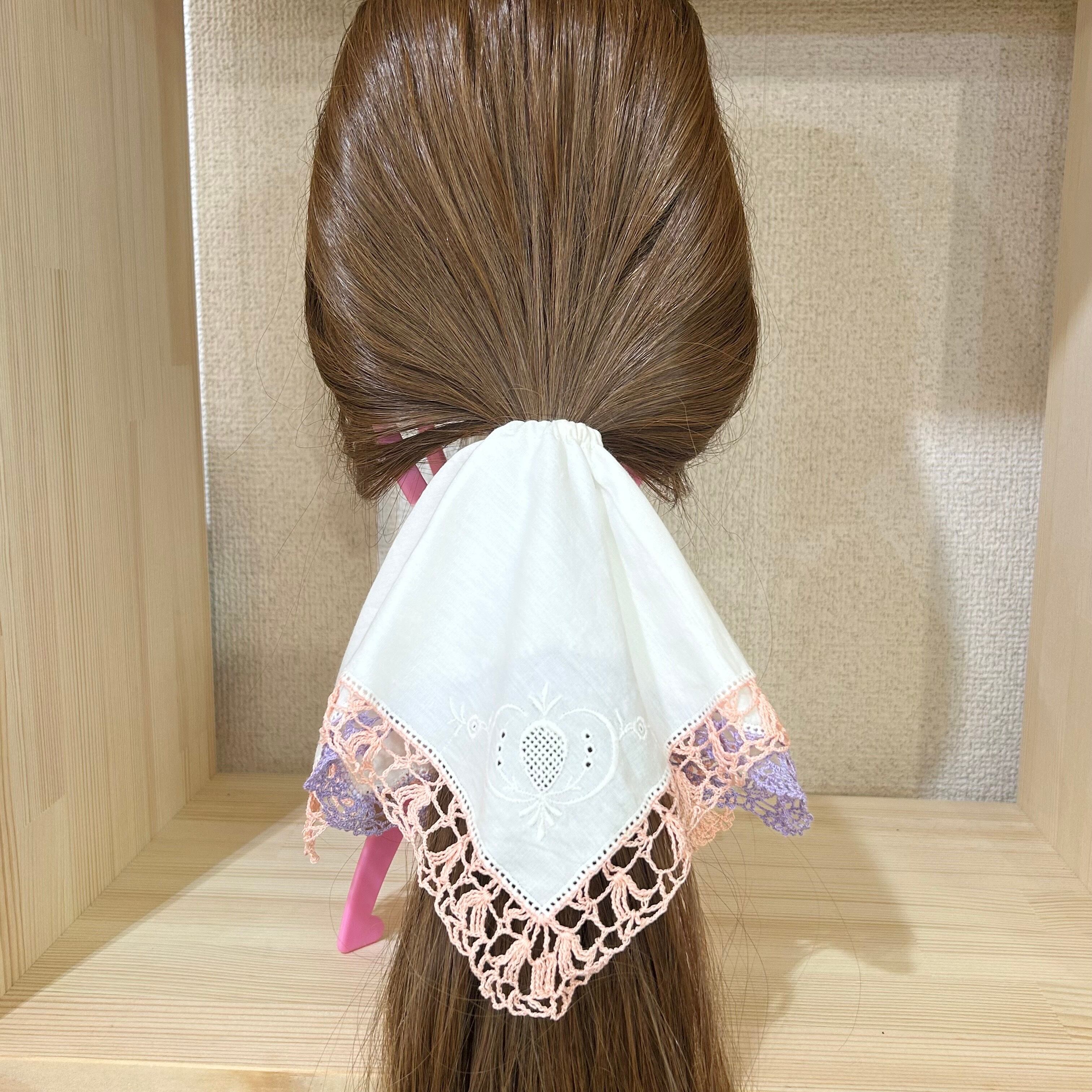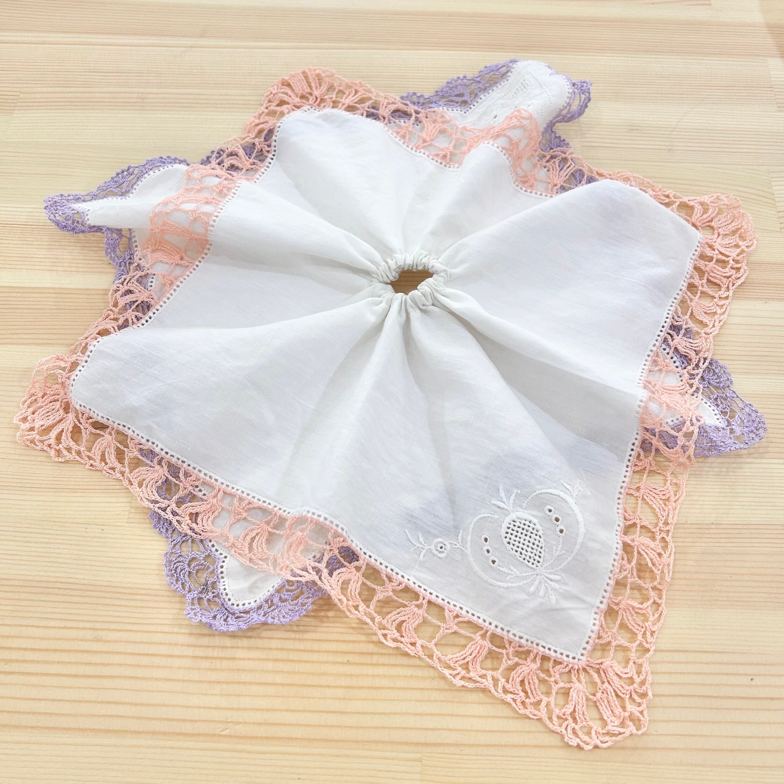 当店オリジナル、ヴィンテージドイリーをリメイクしたシュシュになります。刺繍入りハンカチを2枚重ねてあり、ひっくり返すことでリバーシブルで使用していただけます。その日の気分でお使いください♡
