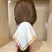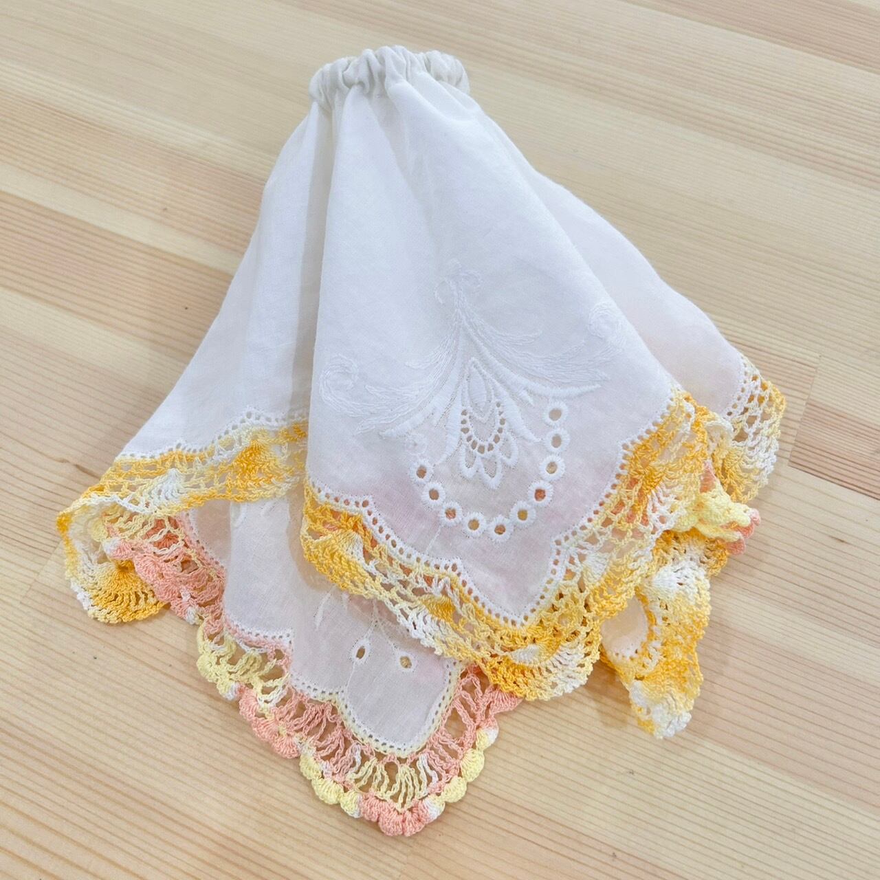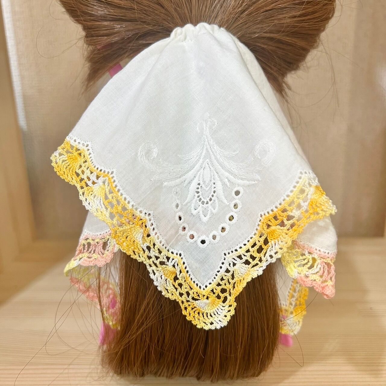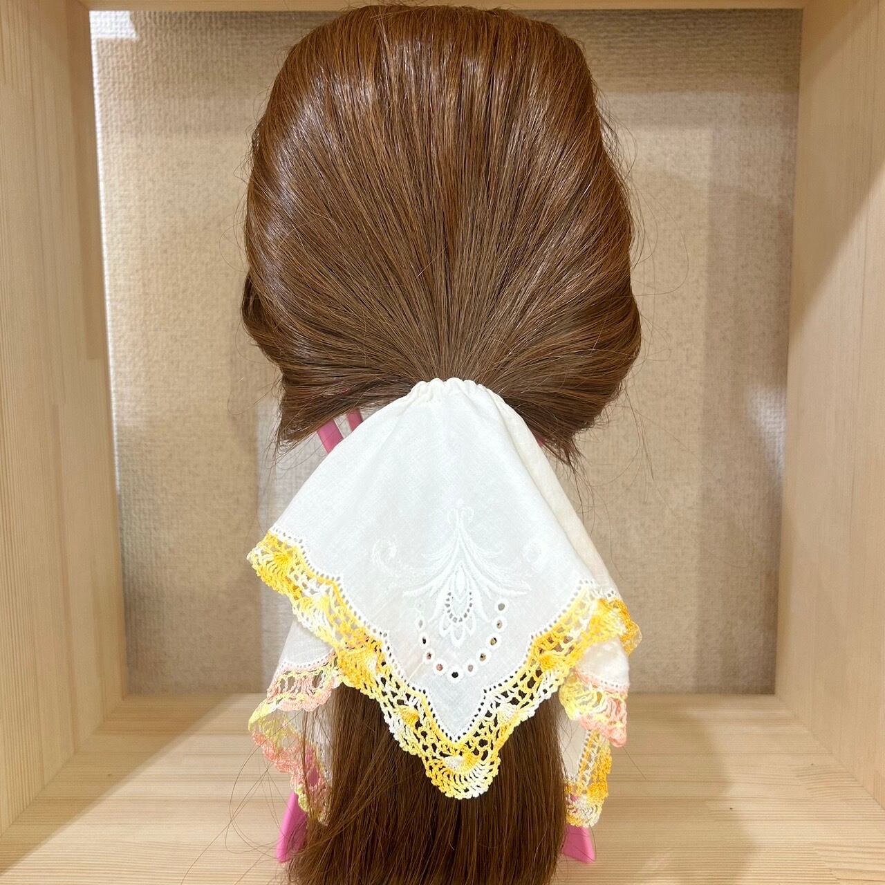 当店オリジナル、ヴィンテージドイリーをリメイクしたシュシュになります。刺繍入りハンカチを2枚重ねてあり、ひっくり返すことでリバーシブルで使用していただけます。その日の気分でお使いください♡