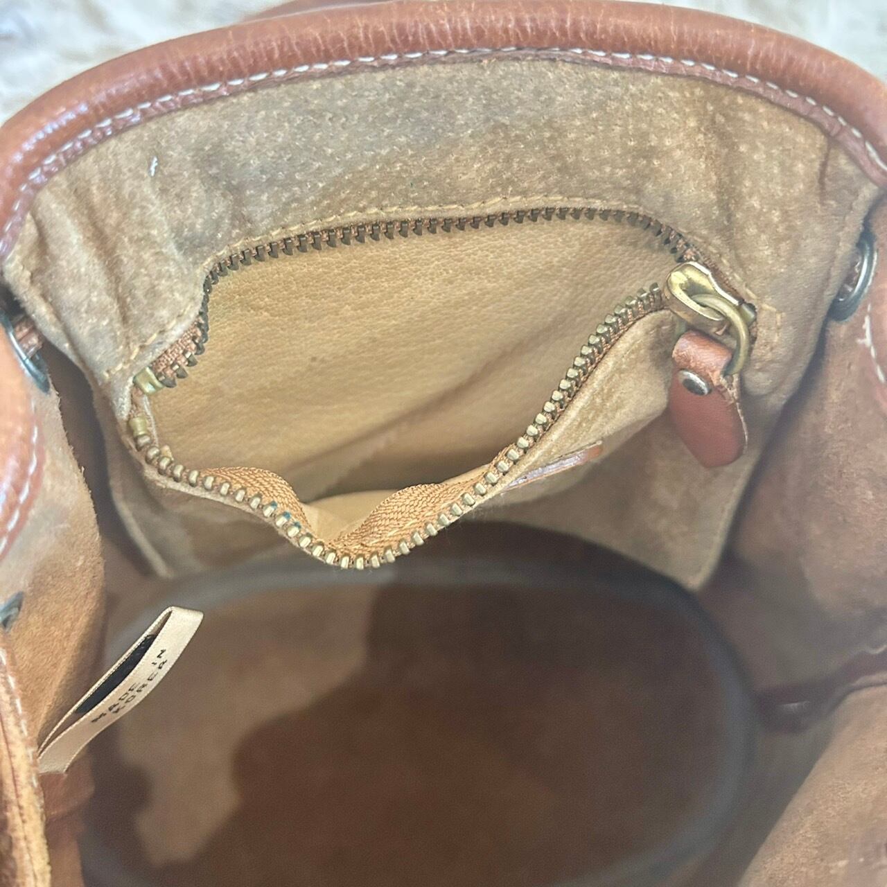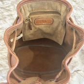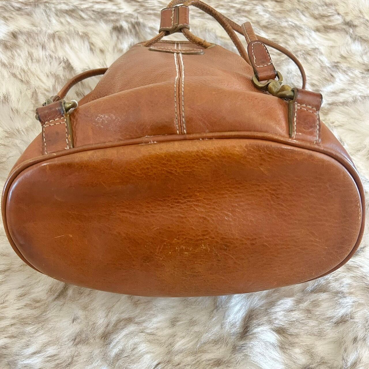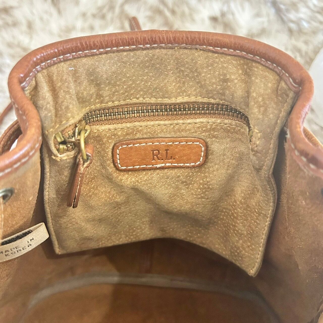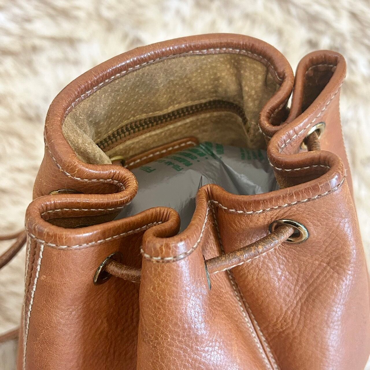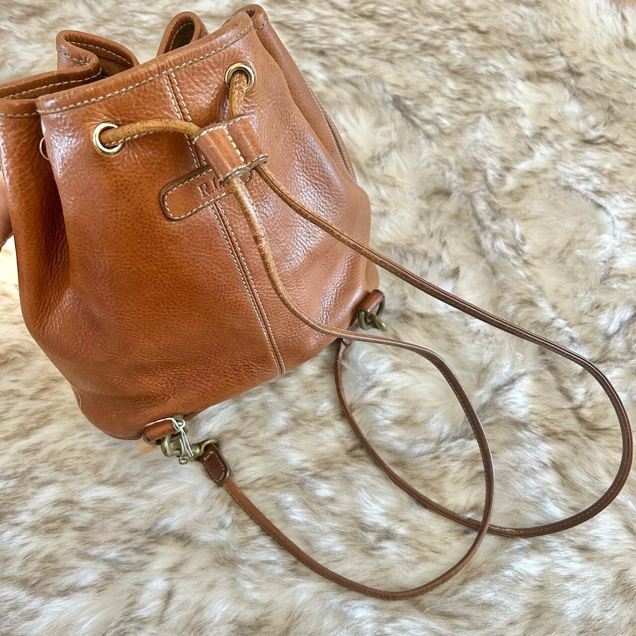 ラルフローレンのレザーバッグ。オールレザーのバックパックです。ファスナー付きの内ポケットが1つ付いています。ショルダーの紐を絞るタイプです。