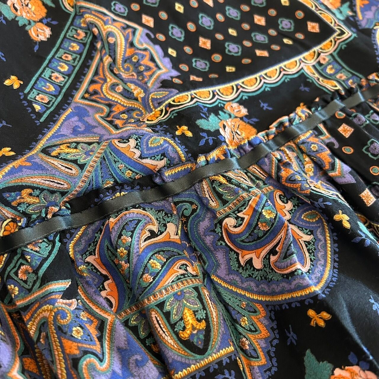 黒地に花などの総柄が素敵な総柄ロングスカートです。フリルと裾部分のレースが可愛いスカートです。ウエストゴムなので多少は余裕ありますが、細身です。裏地付き。