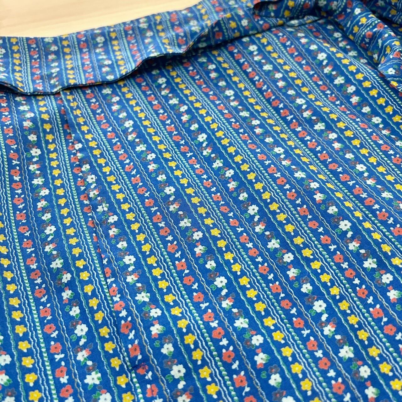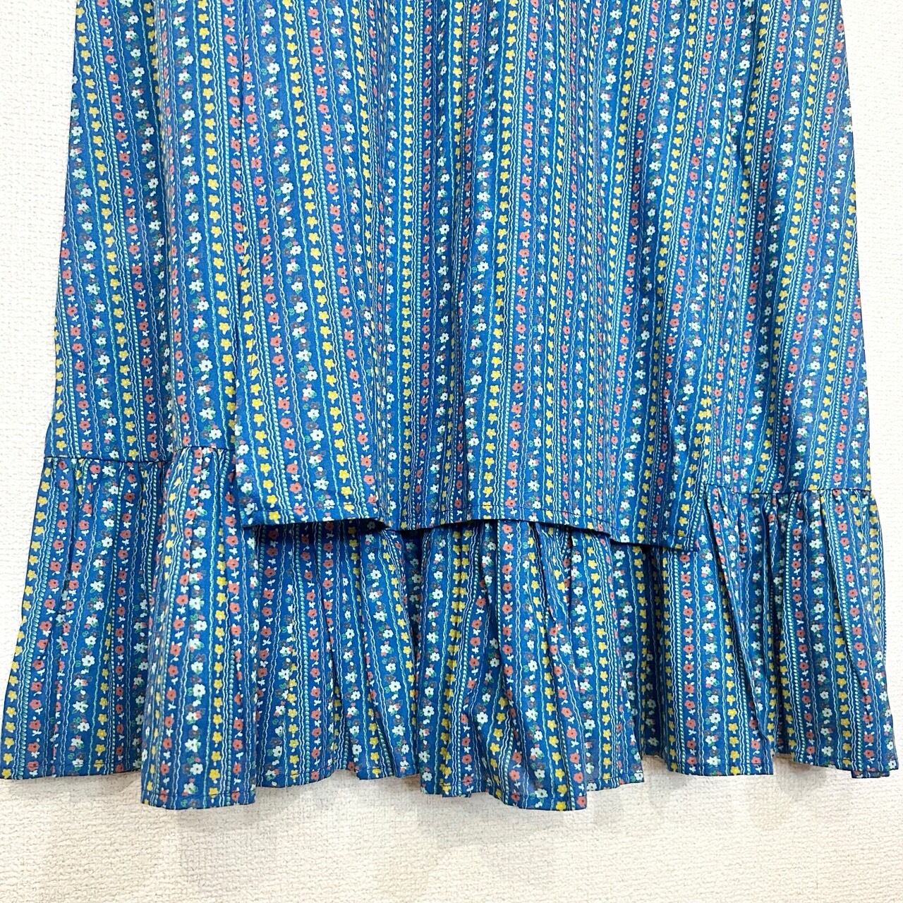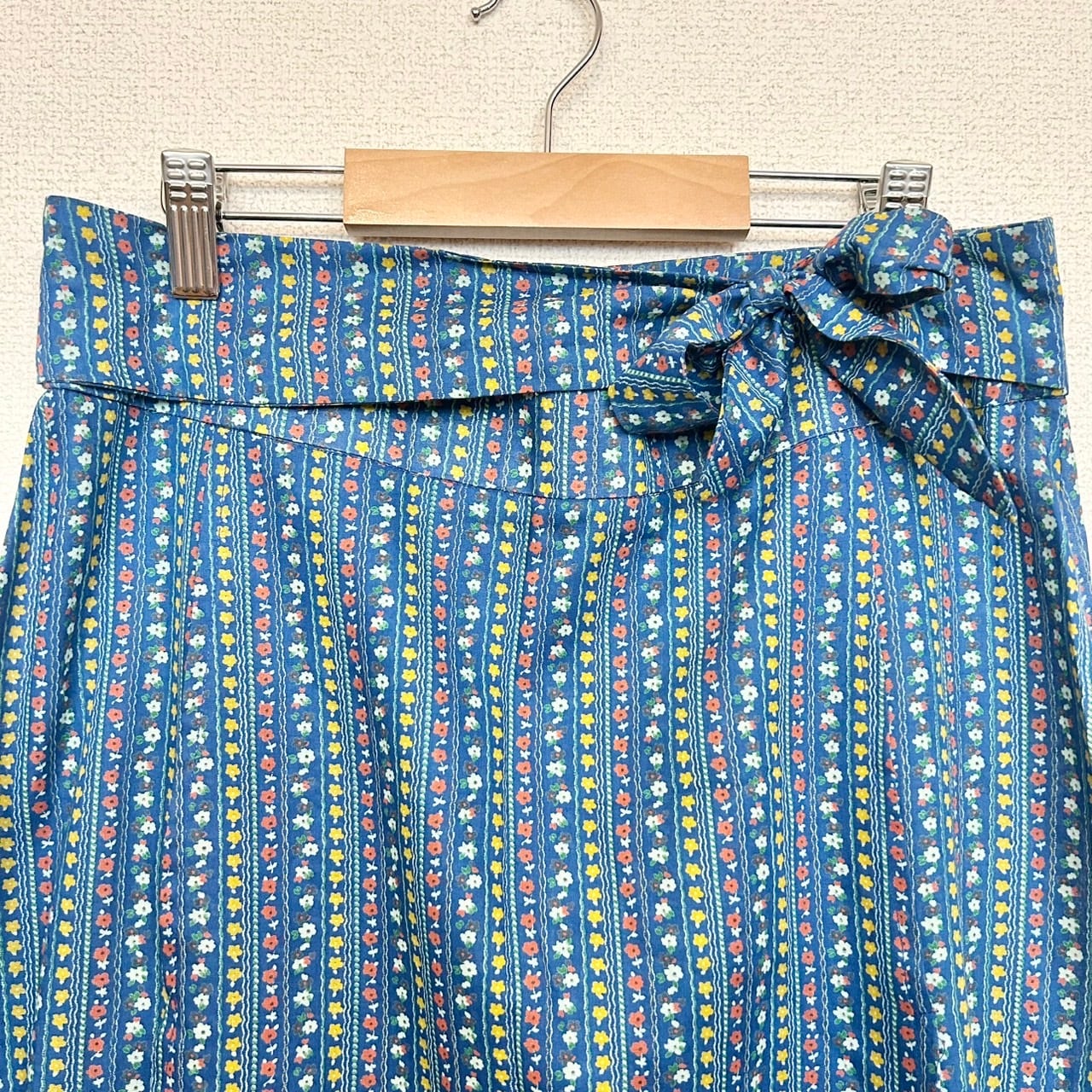 フロントに布が付いていてエプロンのようなデザインの小花柄ロングスカートです。後ろにボタンとジップが付いているので着脱もしやすく、裾がフリルになっていてとても可愛い1枚です。腰周りに付いているリボンは左右で長さが違います。