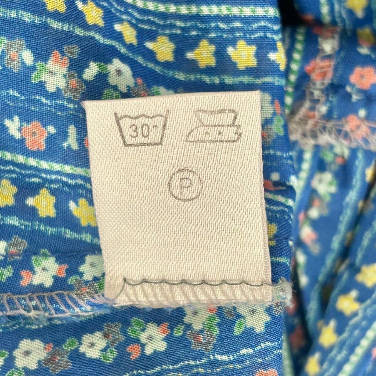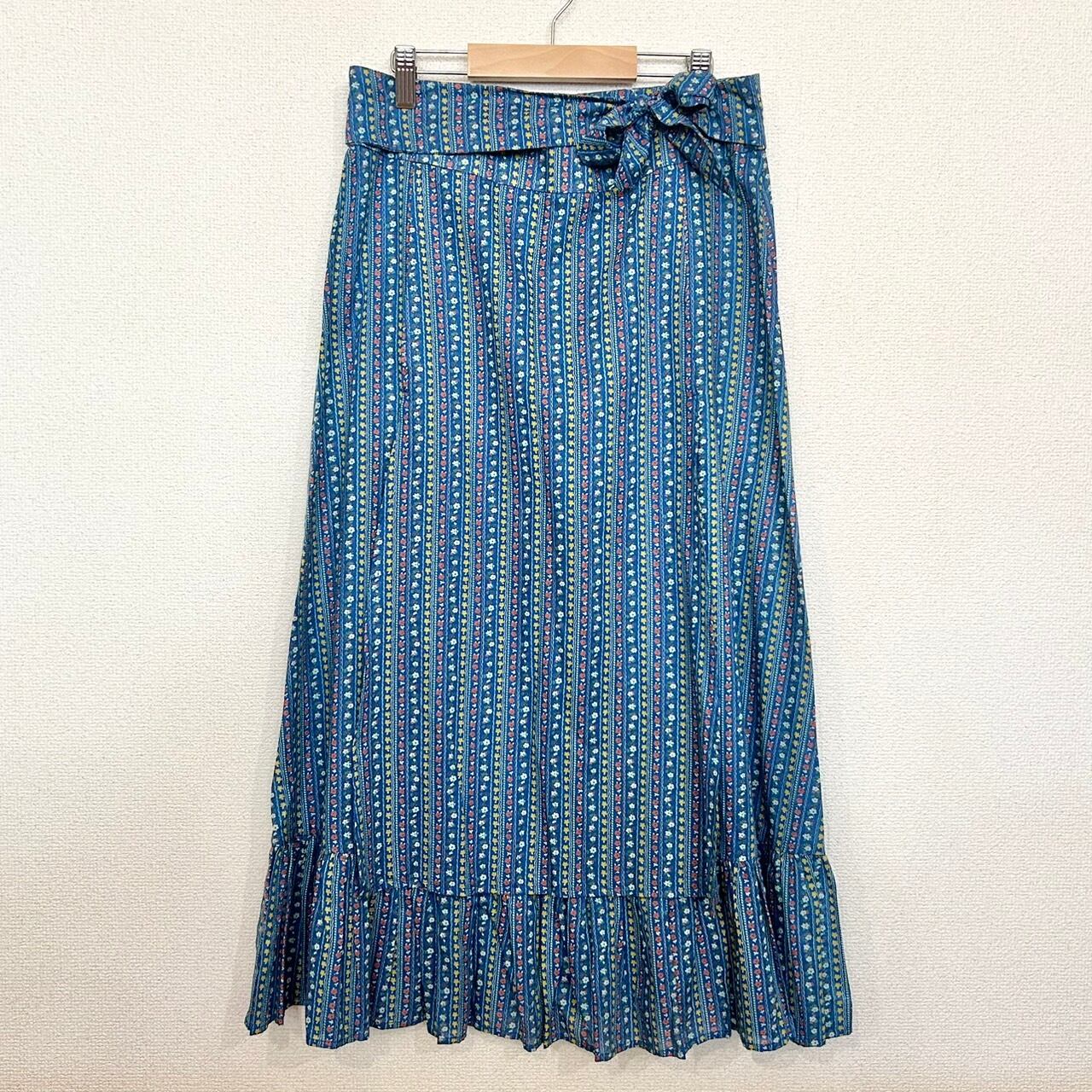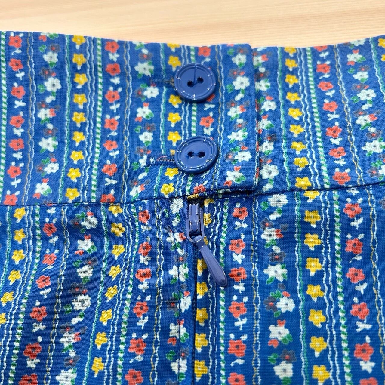 フロントに布が付いていてエプロンのようなデザインの小花柄ロングスカートです。後ろにボタンとジップが付いているので着脱もしやすく、裾がフリルになっていてとても可愛い1枚です。腰周りに付いているリボンは左右で長さが違います。