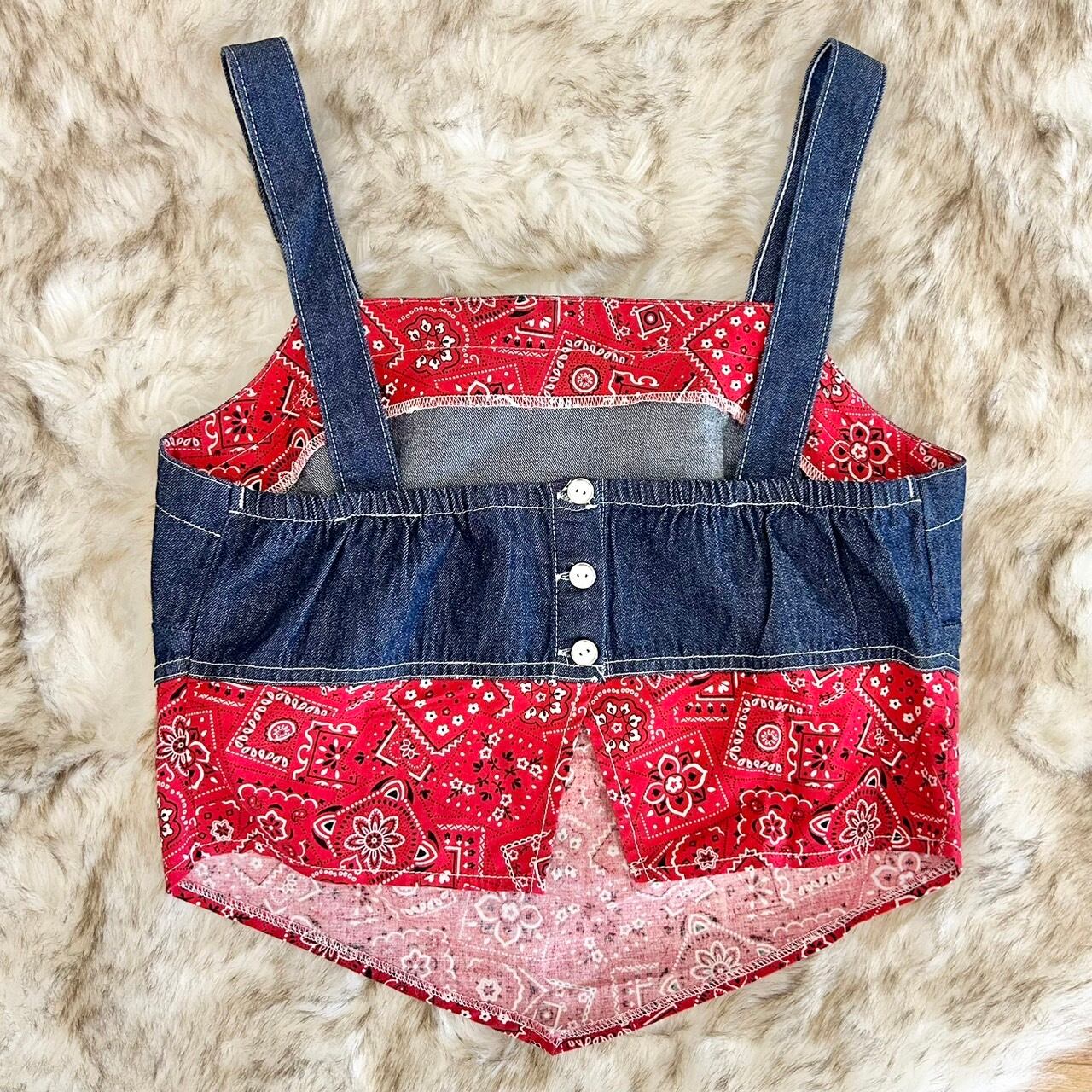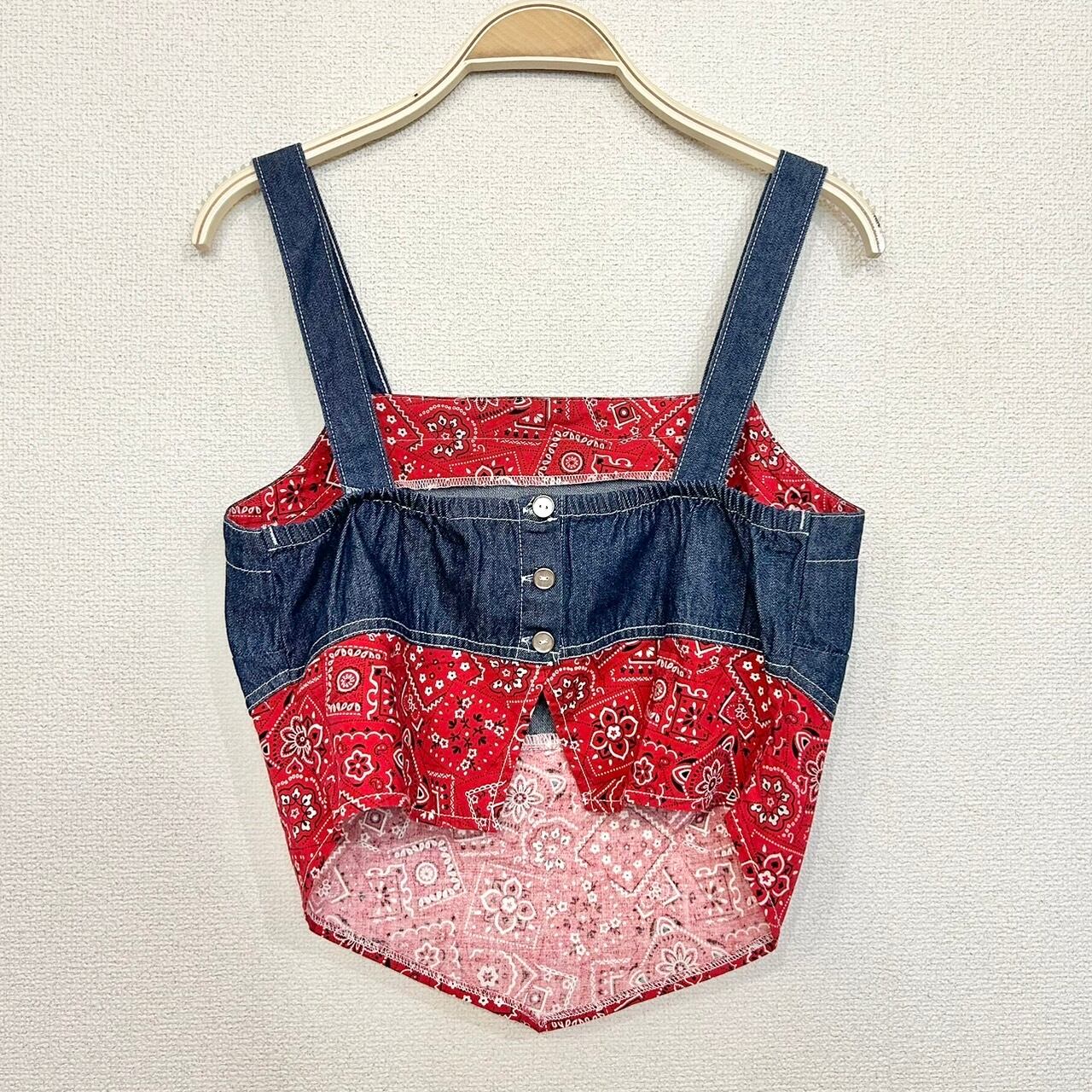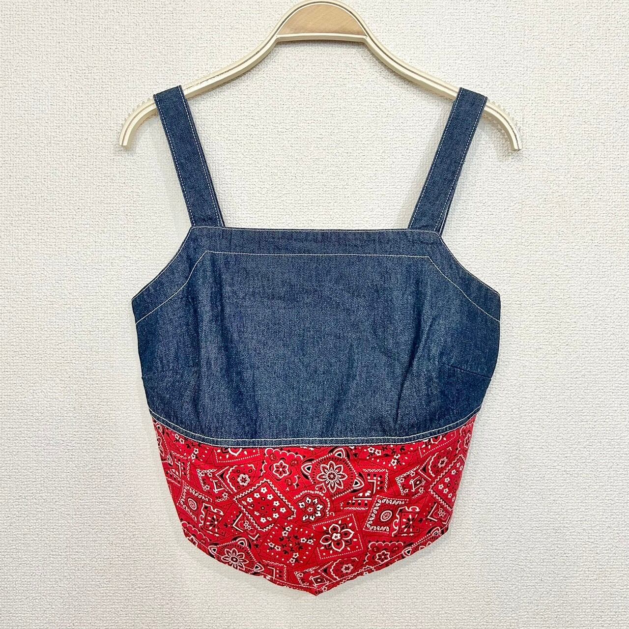 デニム地に赤色のバンダナ柄の生地を組み合わせたビスチェ。色々なトップスとも合わせやすく赤色がアクセントになってとても可愛い1枚です。後ろがボタンになっていて着脱もしやすいのでおススメです。