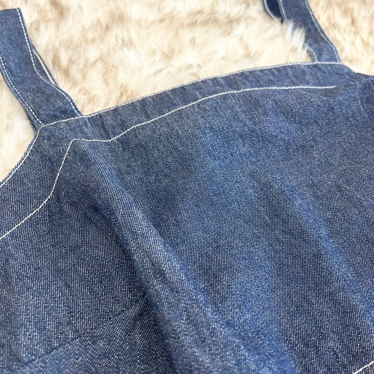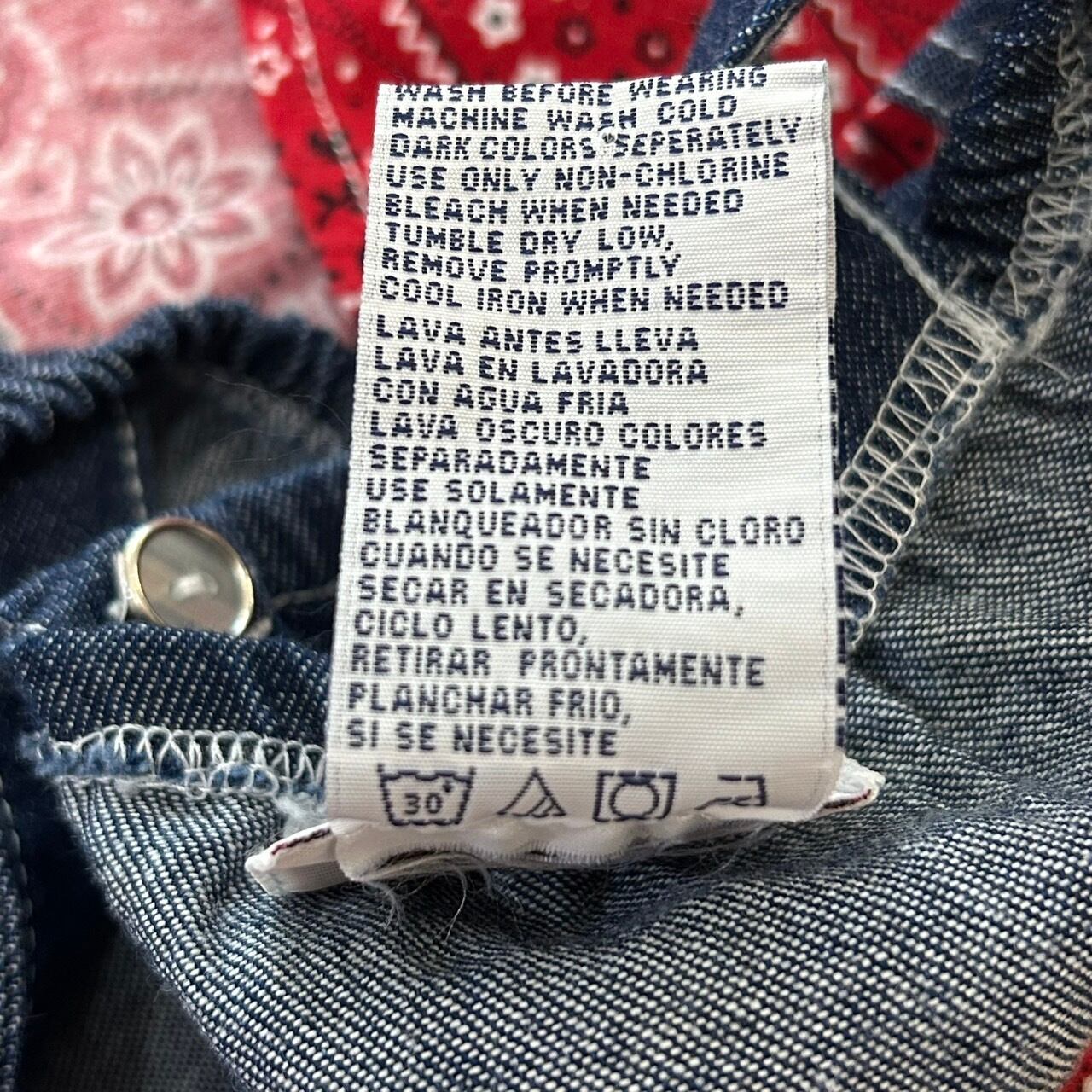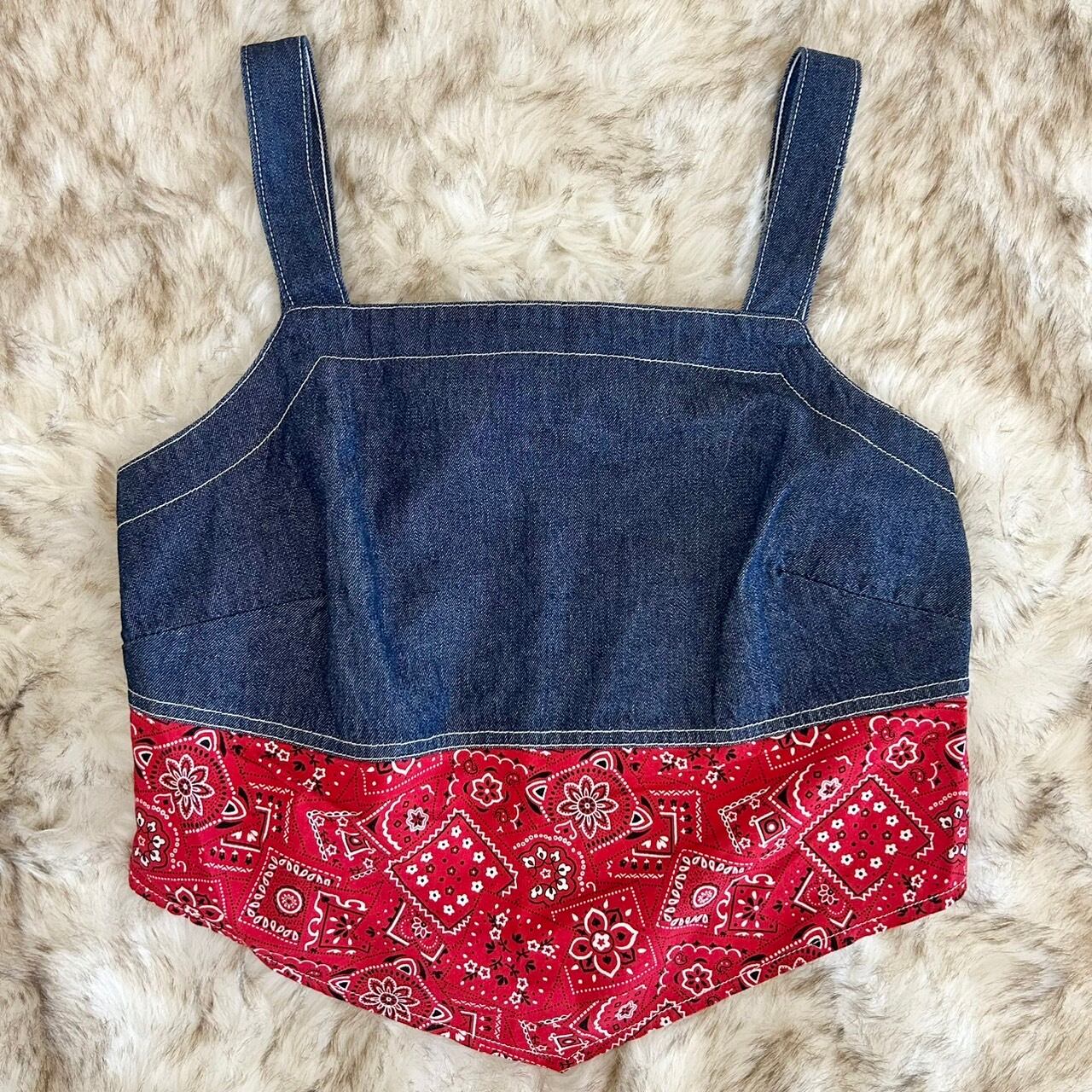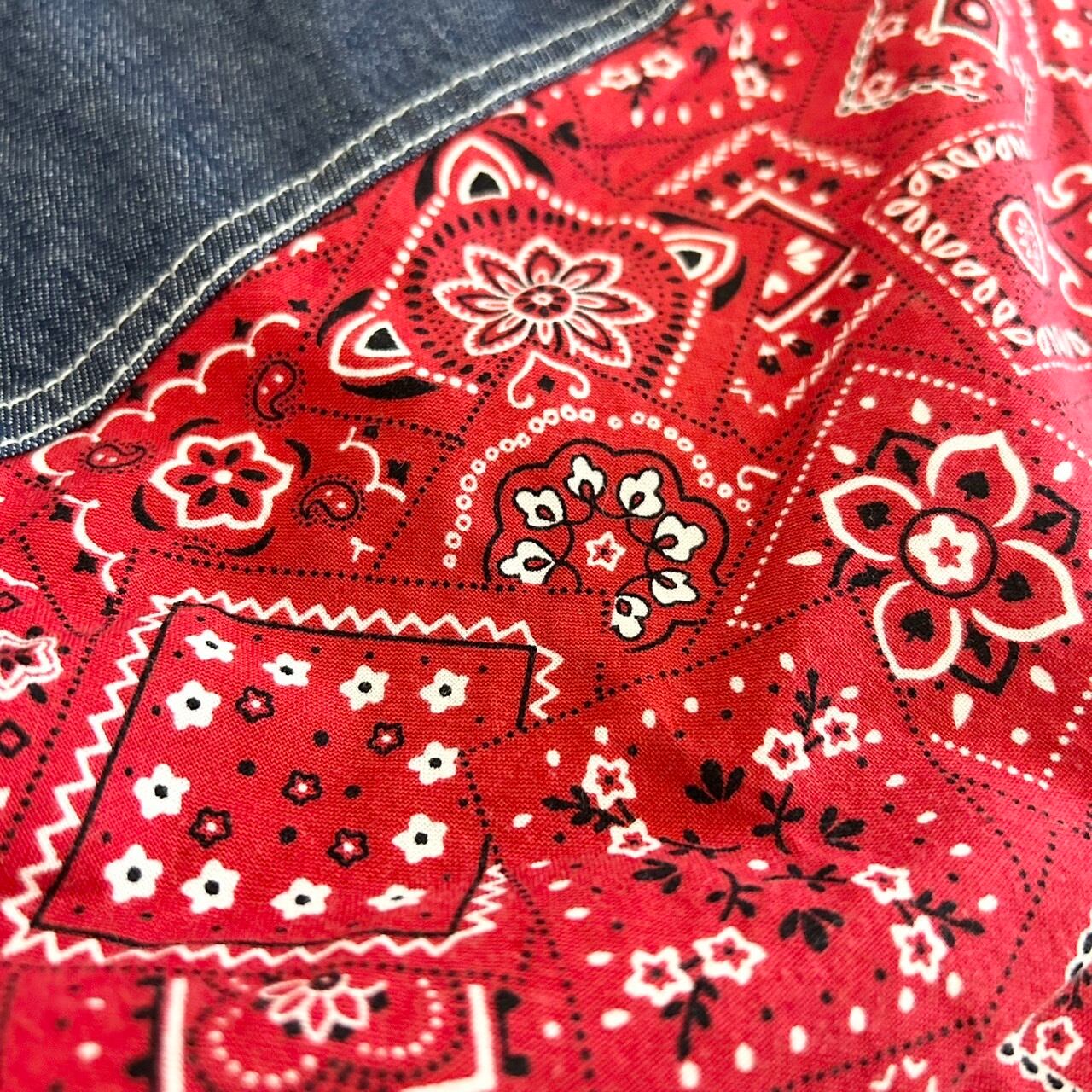 デニム地に赤色のバンダナ柄の生地を組み合わせたビスチェ。色々なトップスとも合わせやすく赤色がアクセントになってとても可愛い1枚です。後ろがボタンになっていて着脱もしやすいのでおススメです。