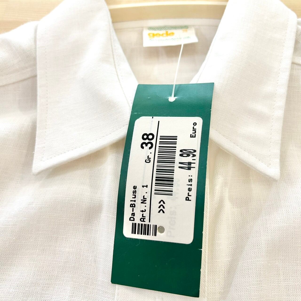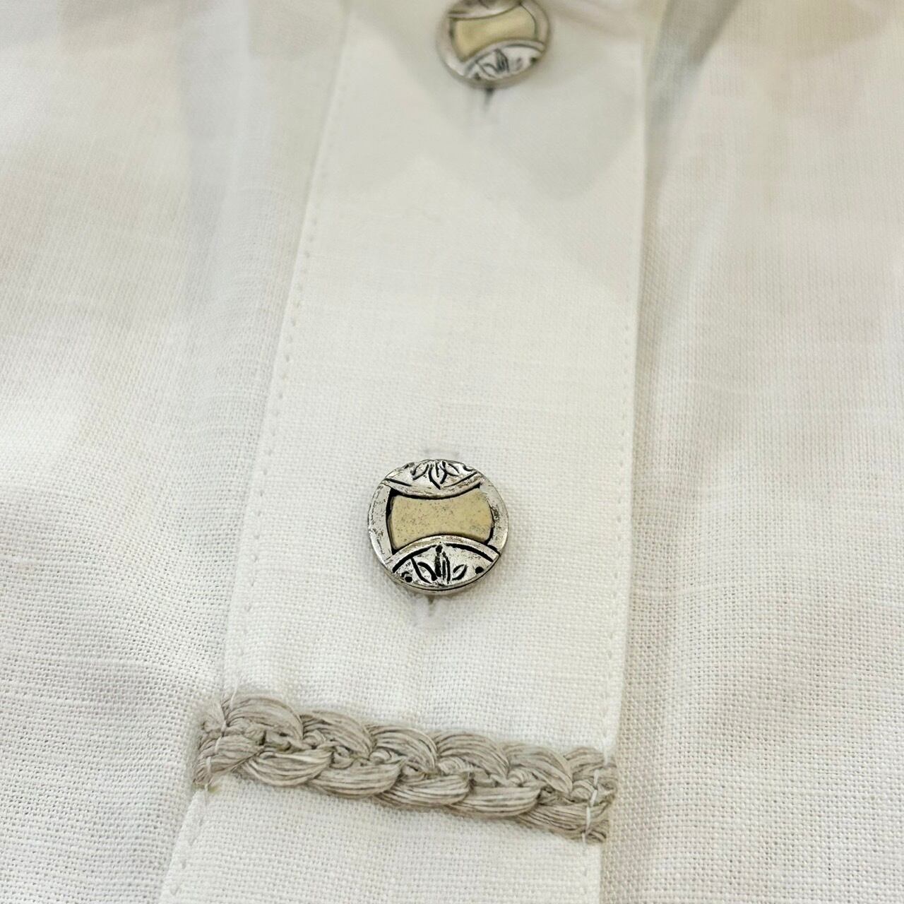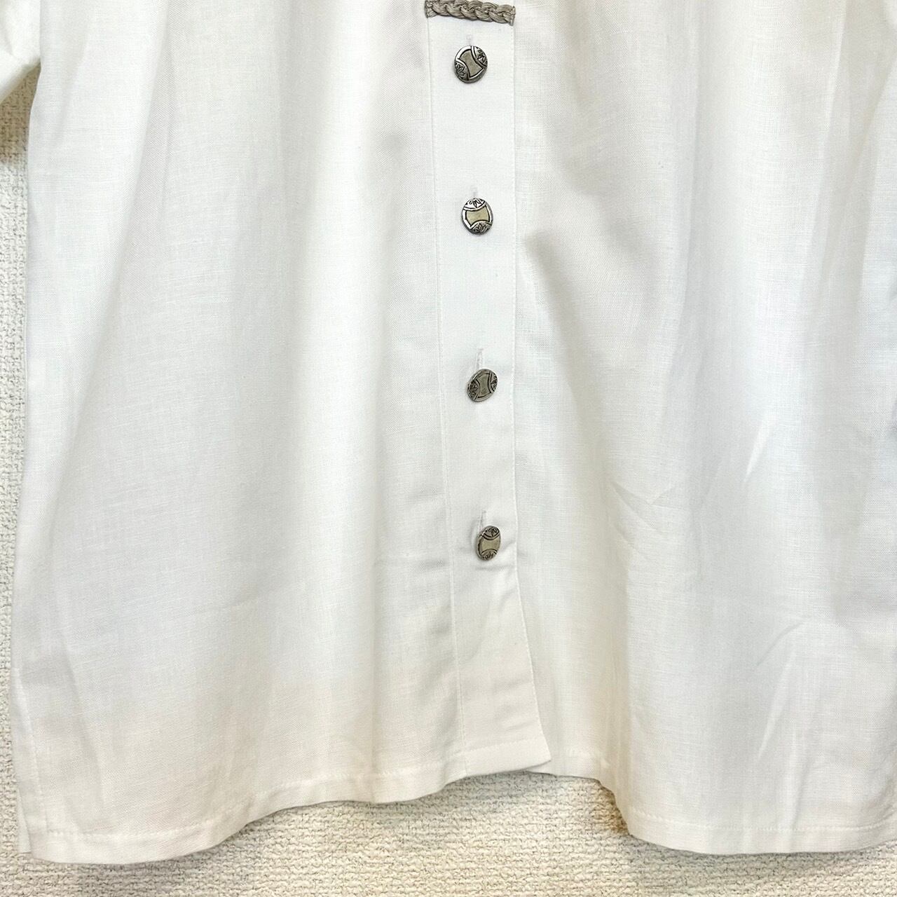 デッドストック品。前立て部分に刺繍が施されているシンプルな半袖のチロリアンシャツです。柔らかくリネン素材なので暑い時期に1枚で着ても素敵な1枚です。
