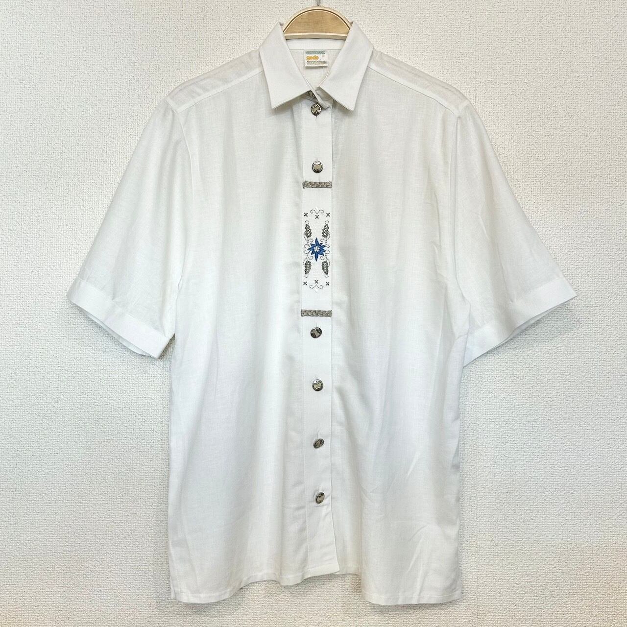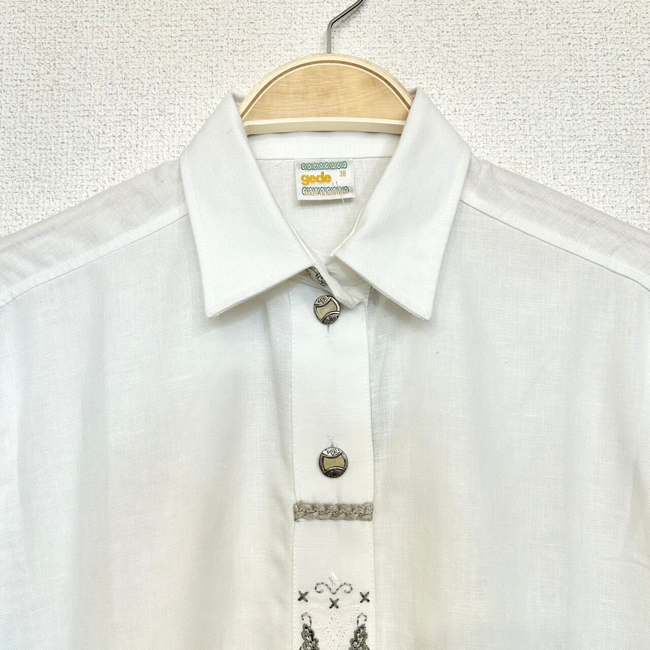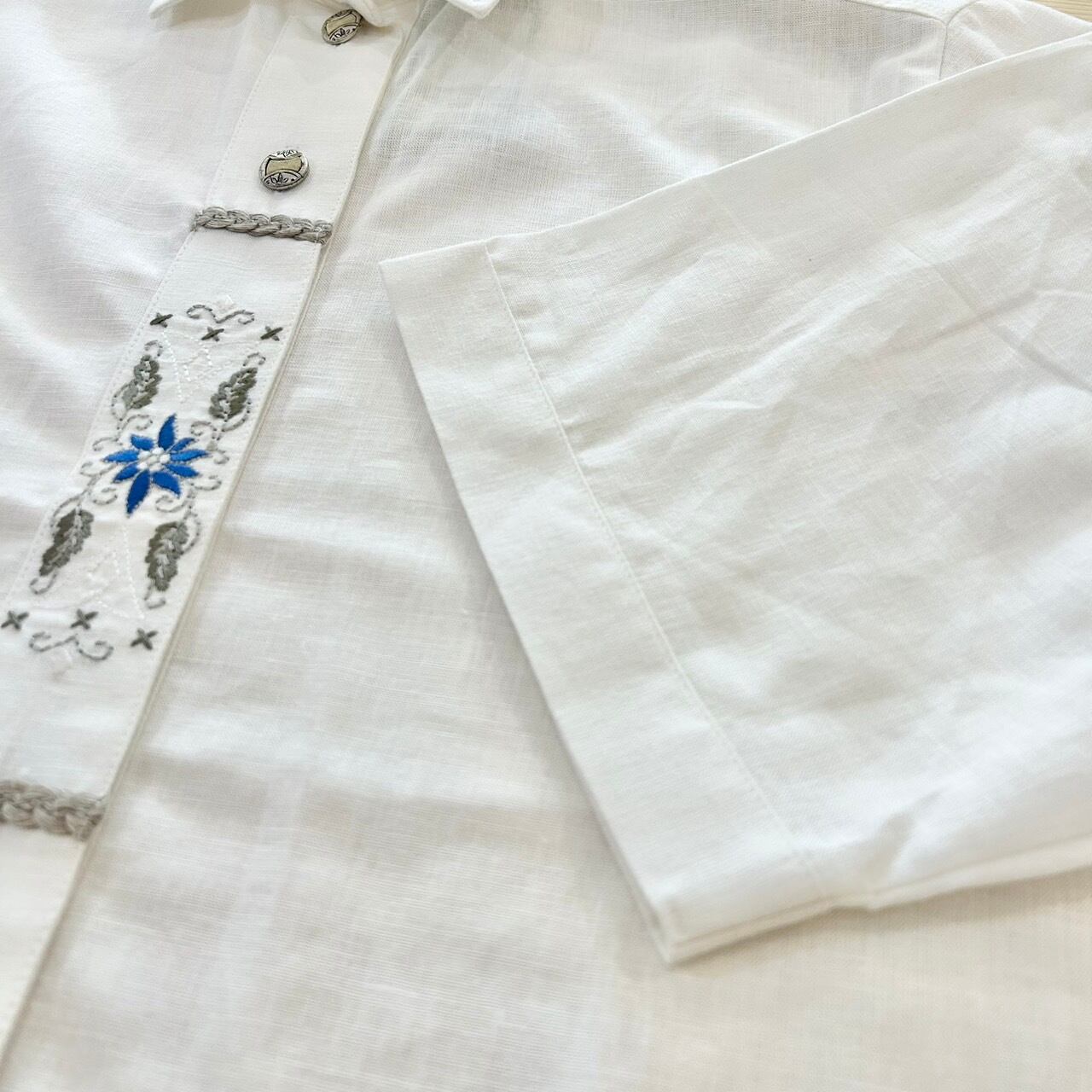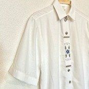 デッドストック品。前立て部分に刺繍が施されているシンプルな半袖のチロリアンシャツです。柔らかくリネン素材なので暑い時期に1枚で着ても素敵な1枚です。