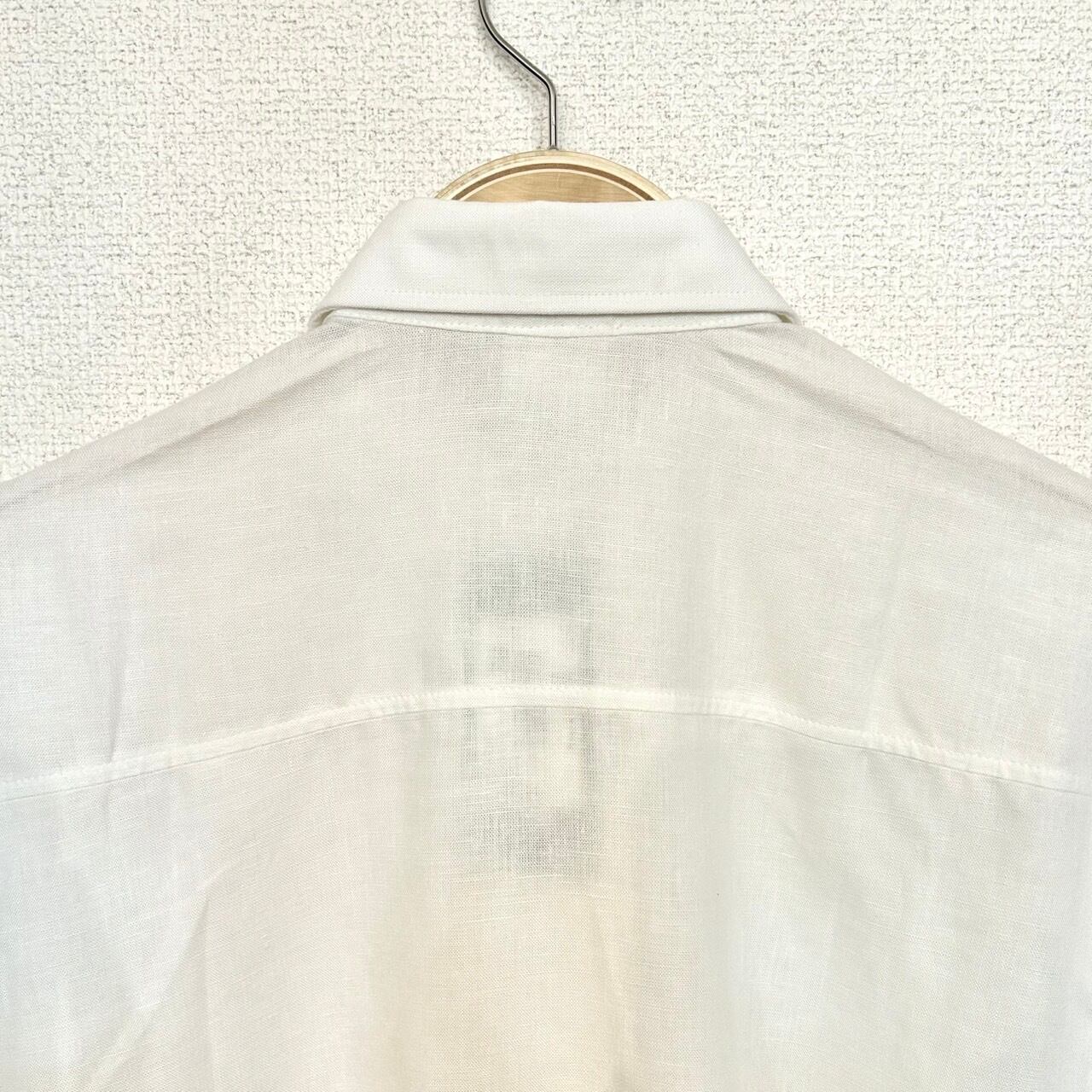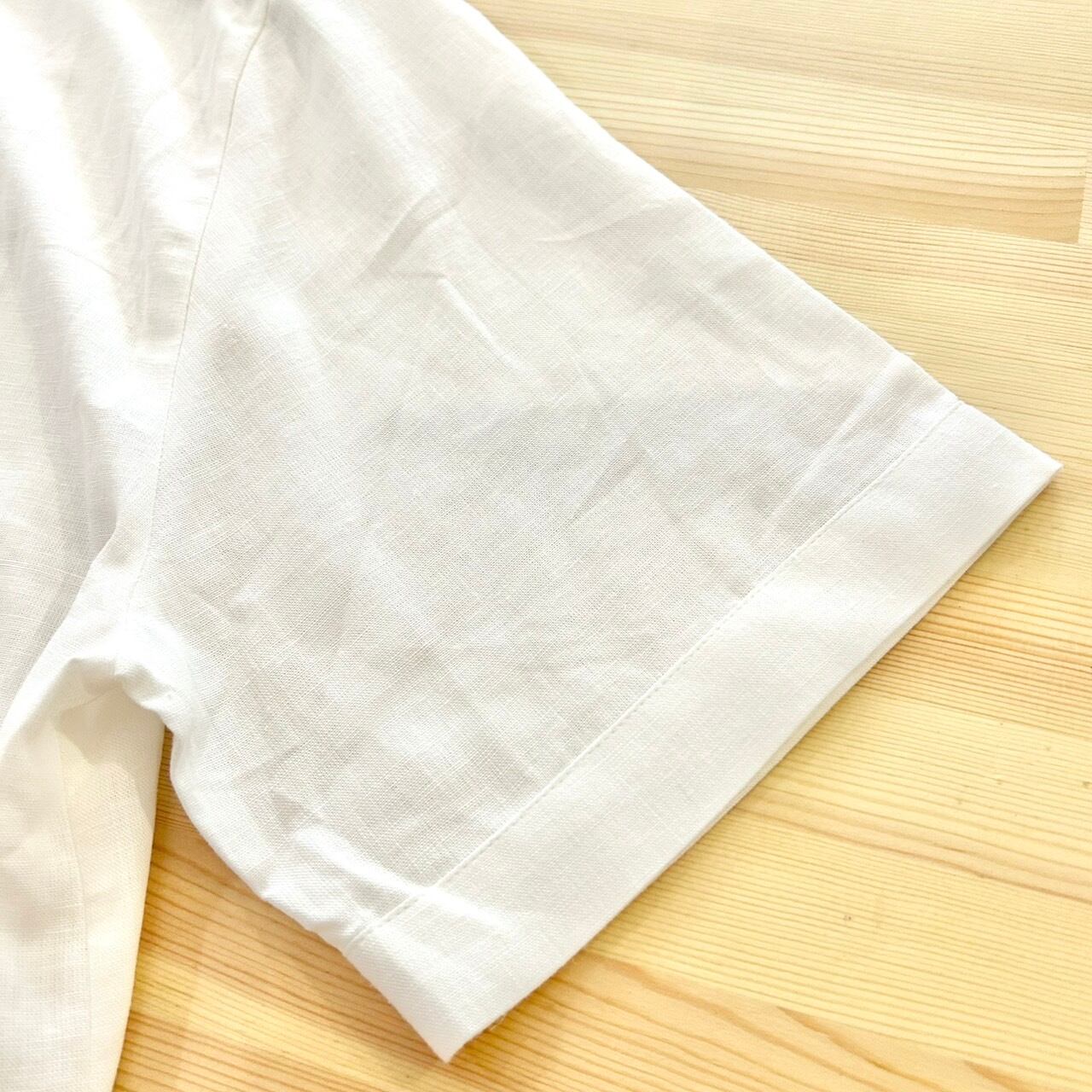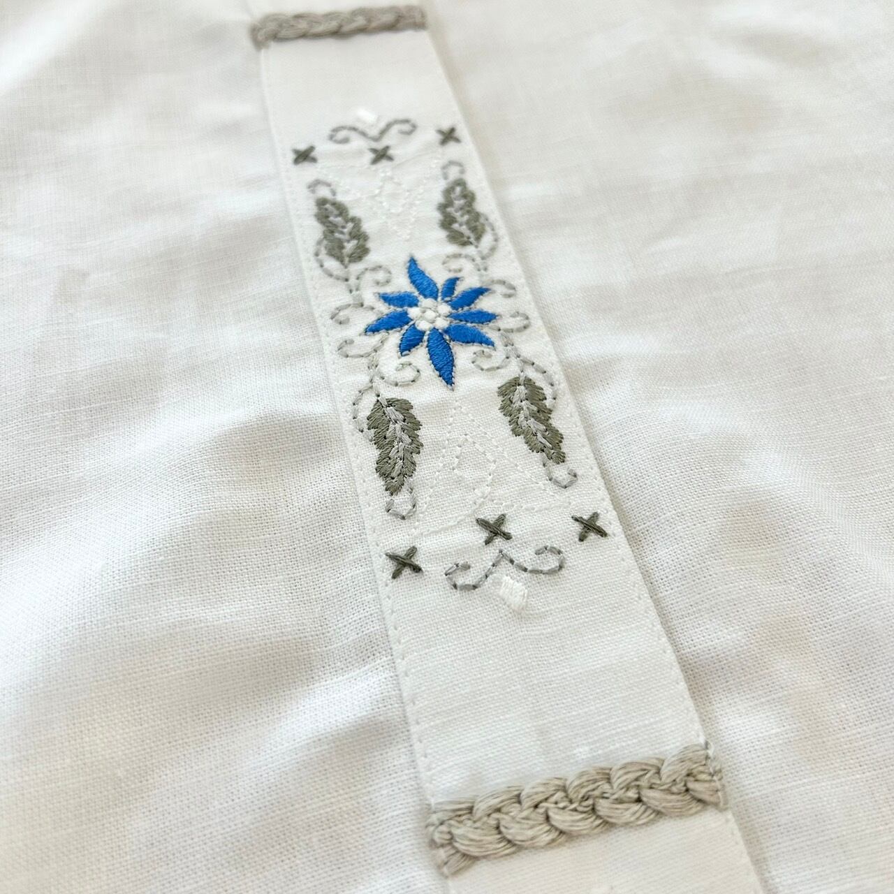 デッドストック品。前立て部分に刺繍が施されているシンプルな半袖のチロリアンシャツです。柔らかくリネン素材なので暑い時期に1枚で着ても素敵な1枚です。